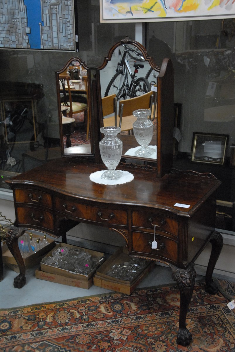 Lot 256: Custom mahogany vanity with triple mirror and cabriole legs carved with lion mask and paw feet. ht. 30 1/2 in. wd. 46 1/2 in. dp. 22 1/2 in.