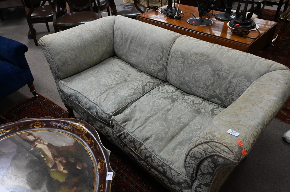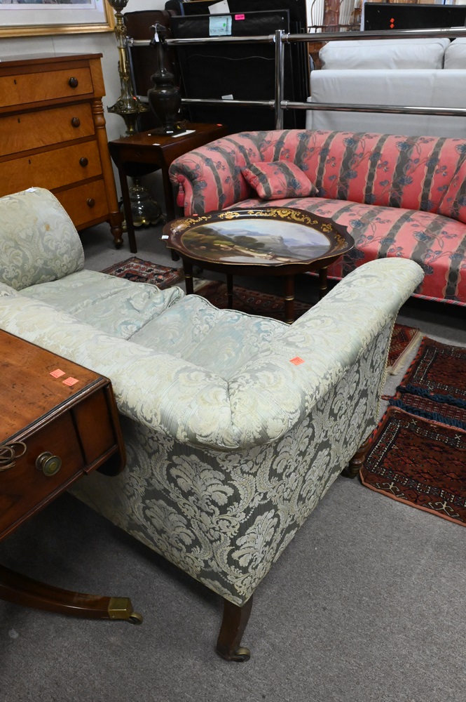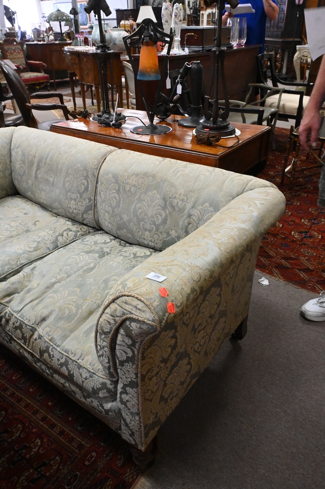 Custom Upholstered Victorian Style Settee, attributed to George Smith, height 29 inches, length 58 inches.