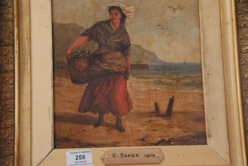 Lot 256: E. Baker oil on board of basket of fish on the ocean edge, signed lower left E. Baker 1874, 11 1/2 x 9 1/2.