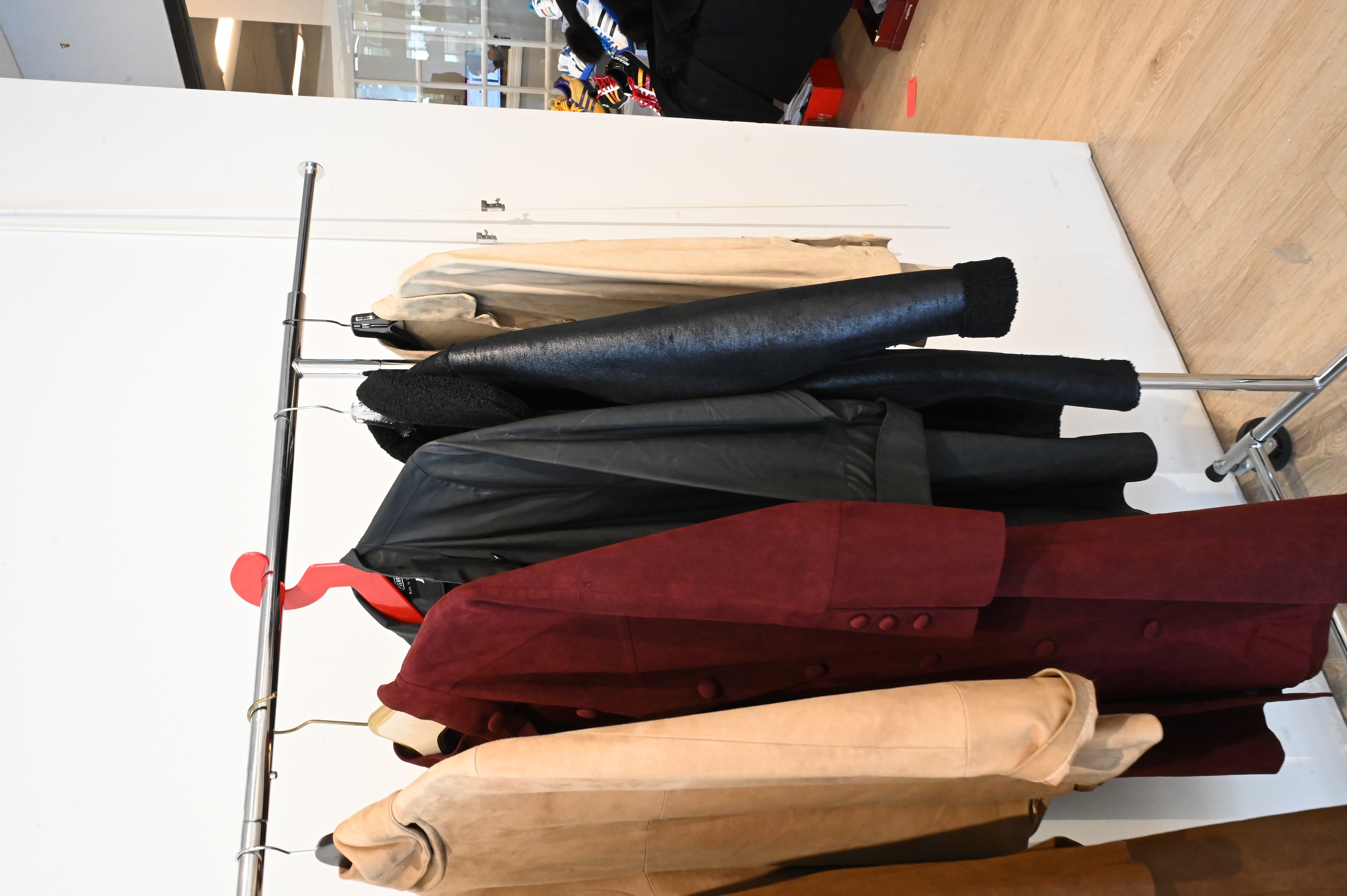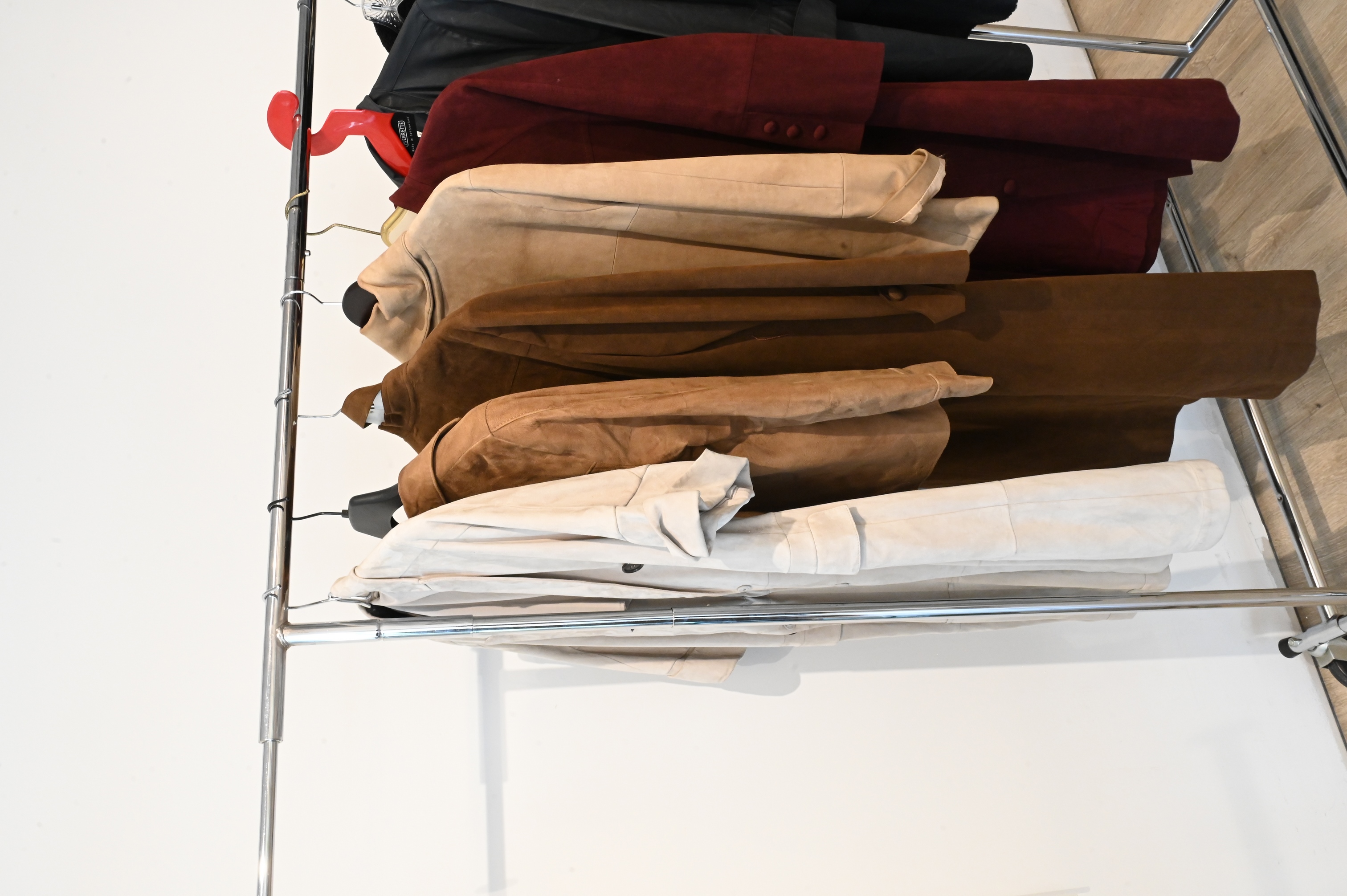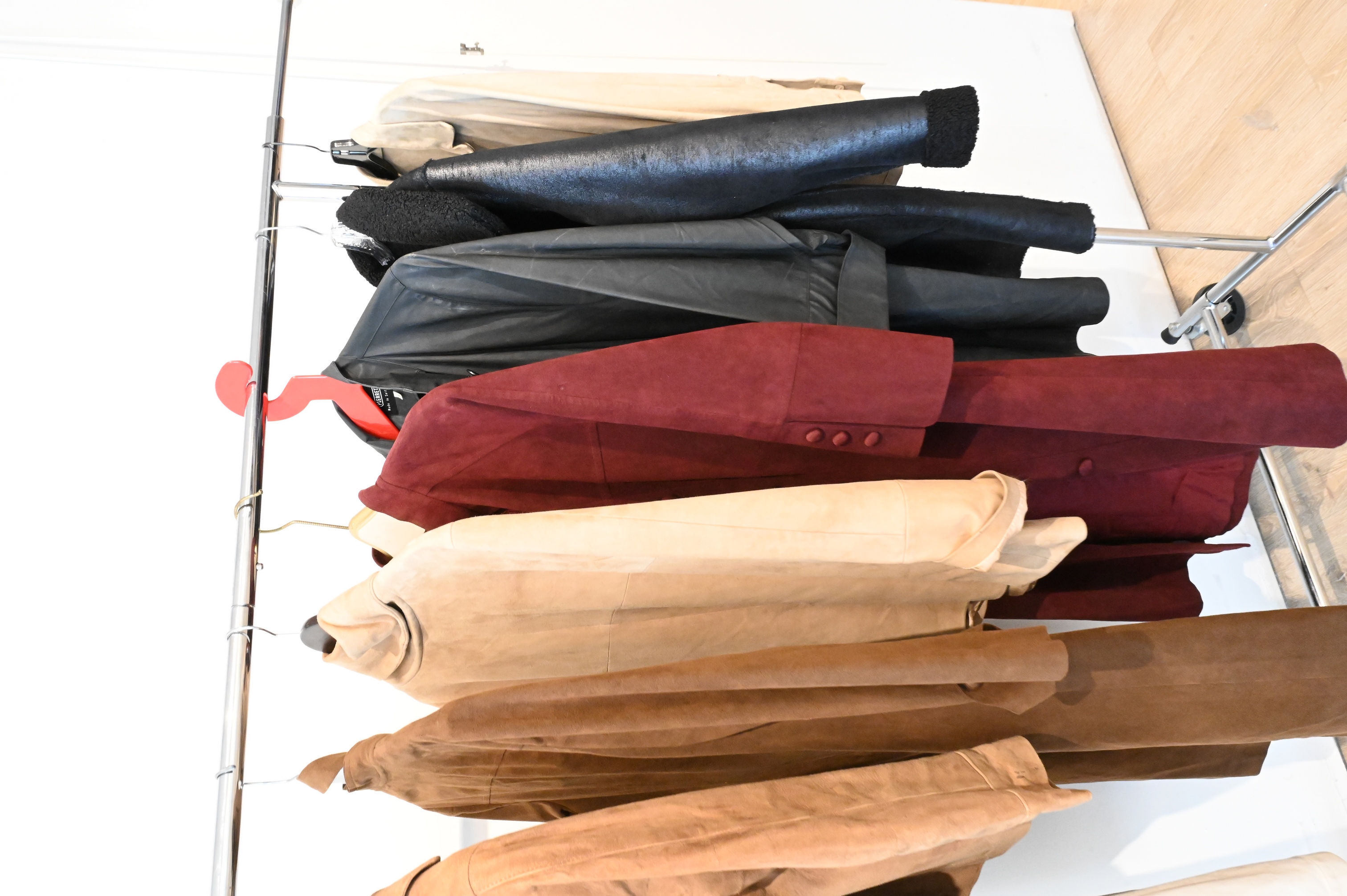 to include B. Clemo Hd red full length coat, suede turtleneck, Italian suede button jacket in beige, brown leather full length coat, etcetera, small sizes