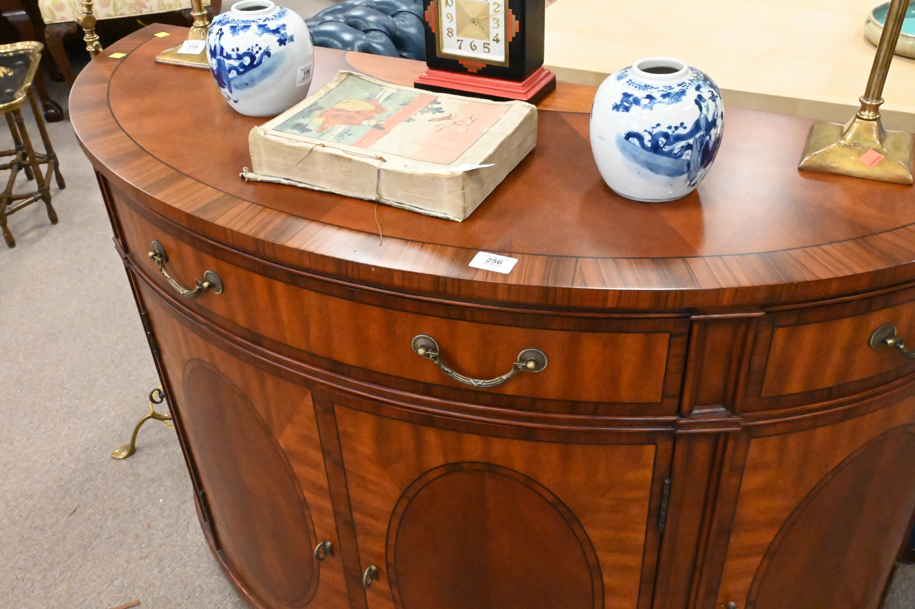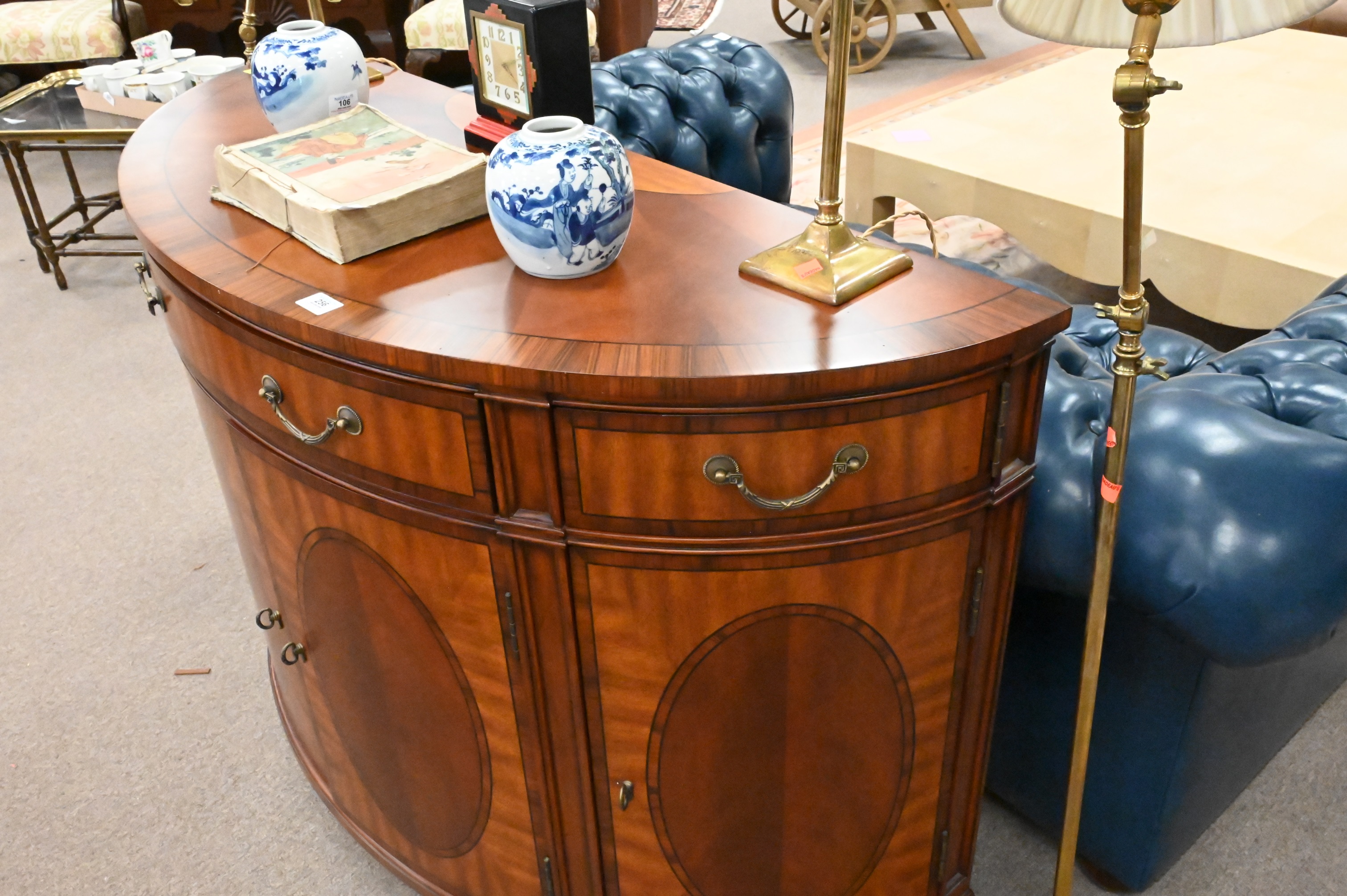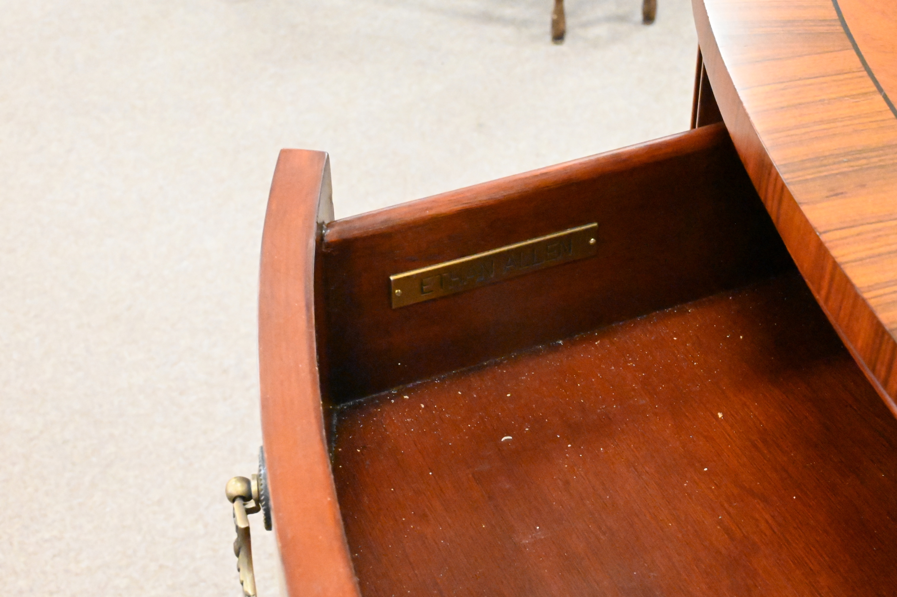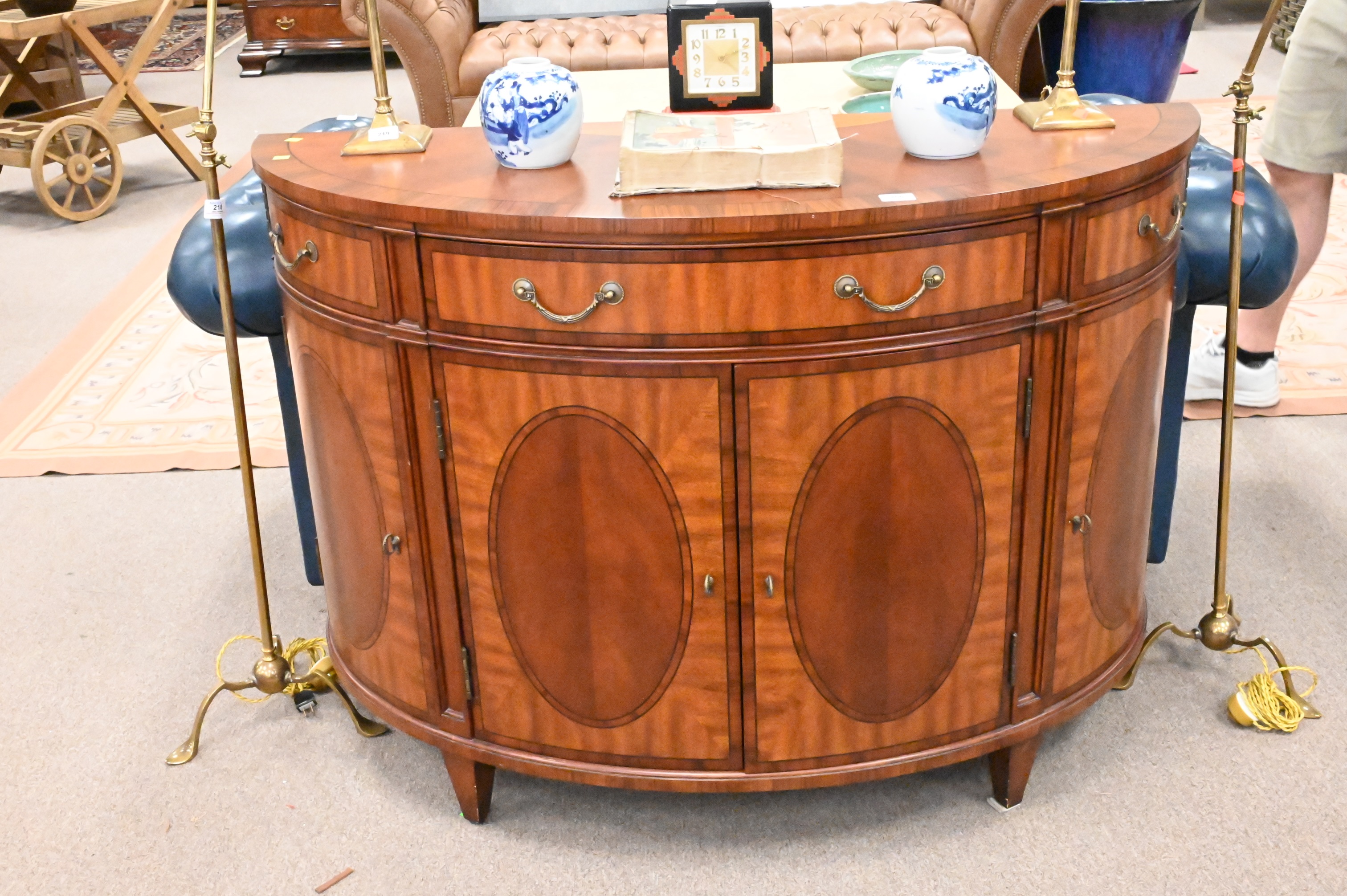 Ethan Allen Demilune Server, having inlaid top, a drawer, two swing drawers and four doors, height 35 inches, top 19″x50″