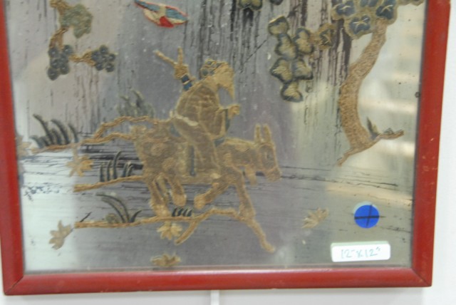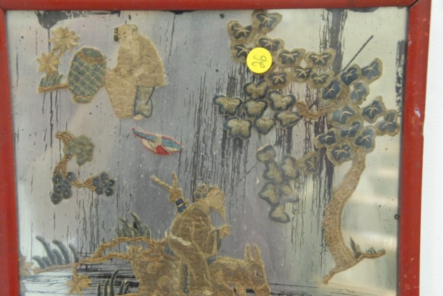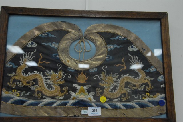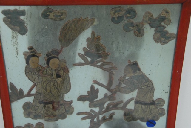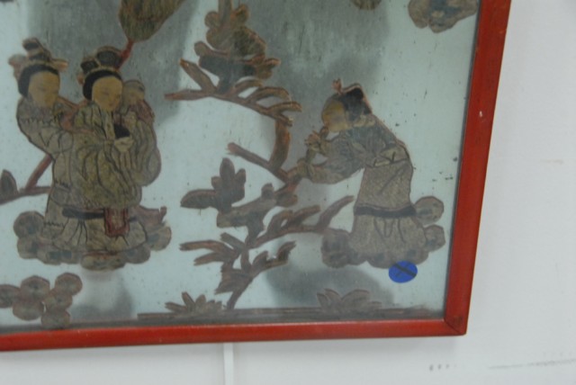 Group of 3 early oriental emperoress sp A pair of mirrored backs in red frames with a double 4 claw dragon piece of shell