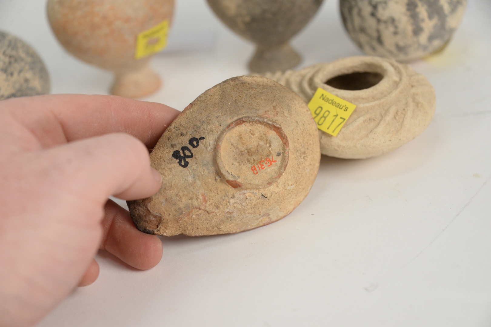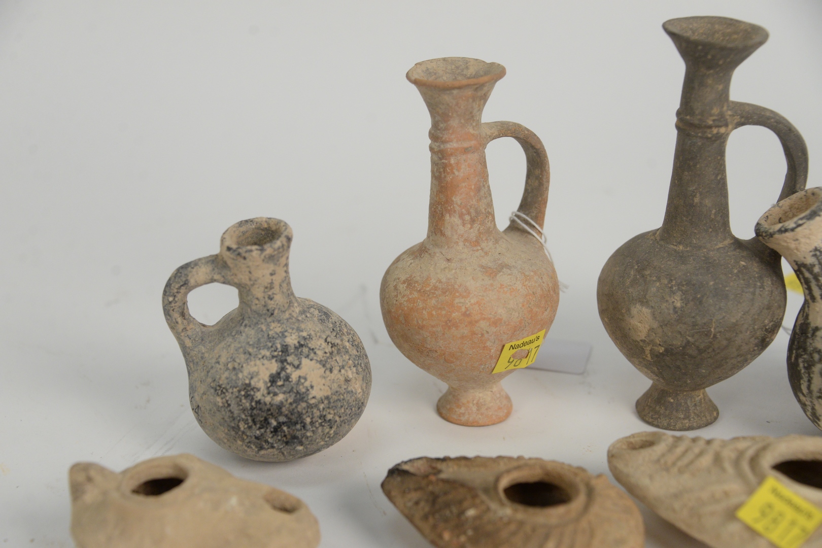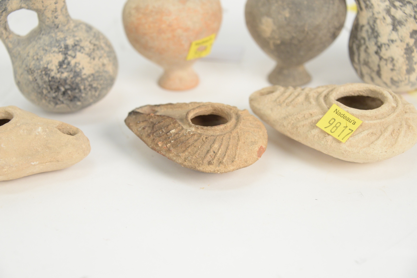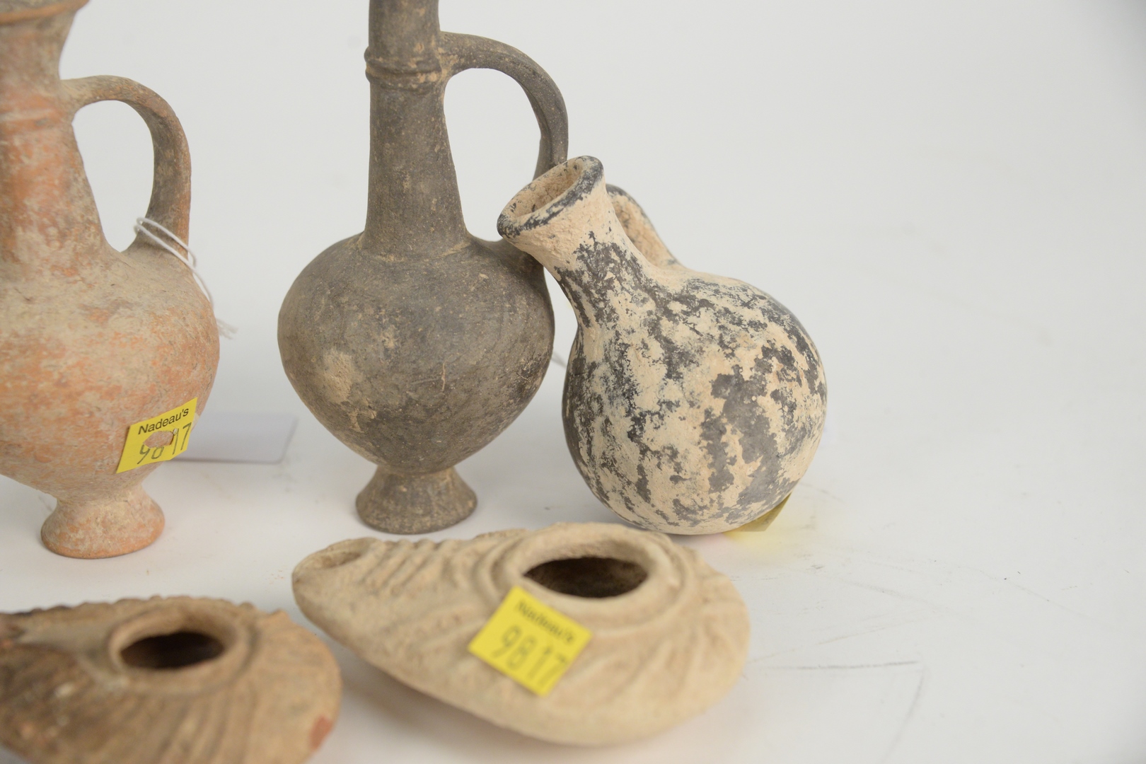 Lot 256: Group of Seven Ancient Clay Items to include three oil lamps by Zantine, two cypriot jars with handles, along with two black jars with handles, largest height 6 inches.