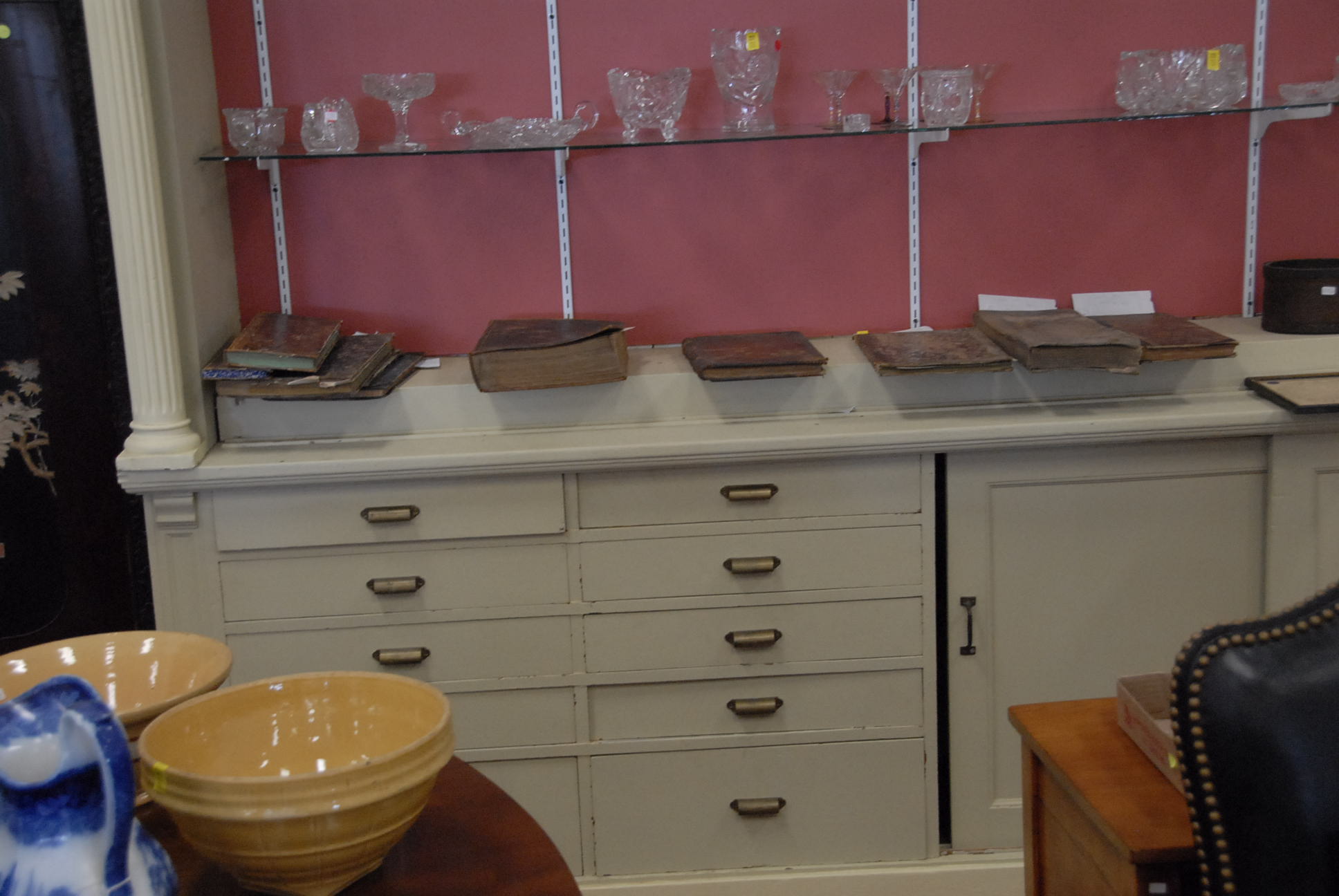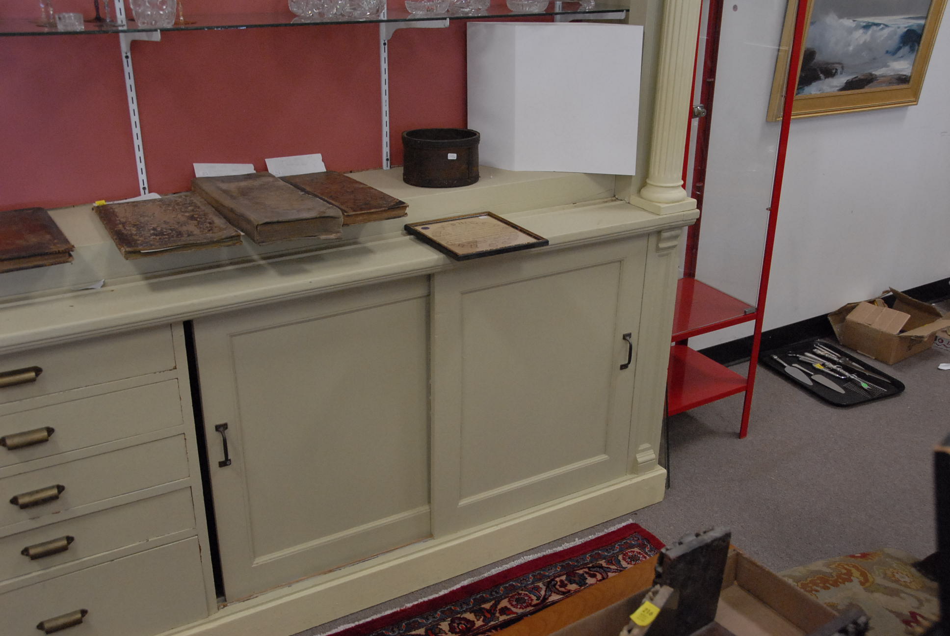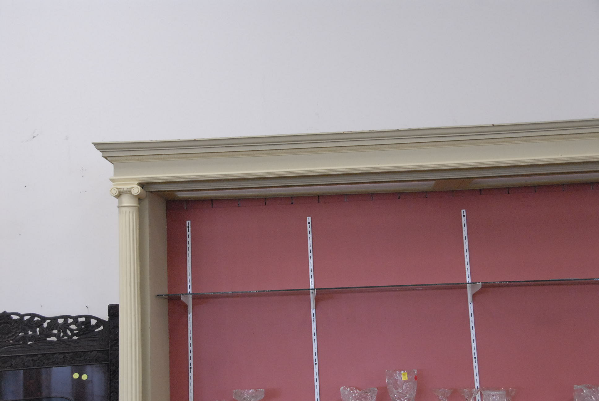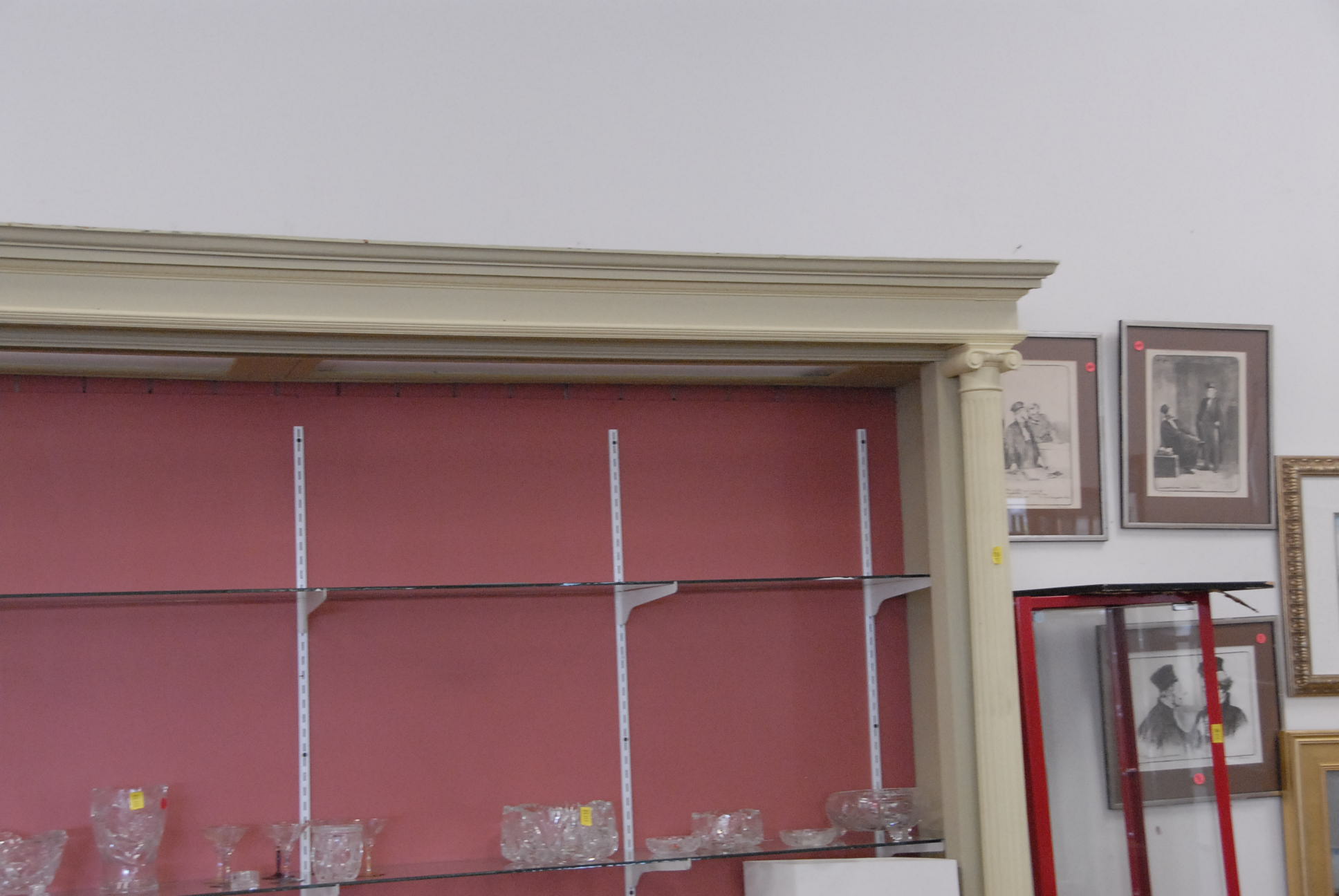 Large storage display cabinet with glass front and columns on top and doors and drawers in base.