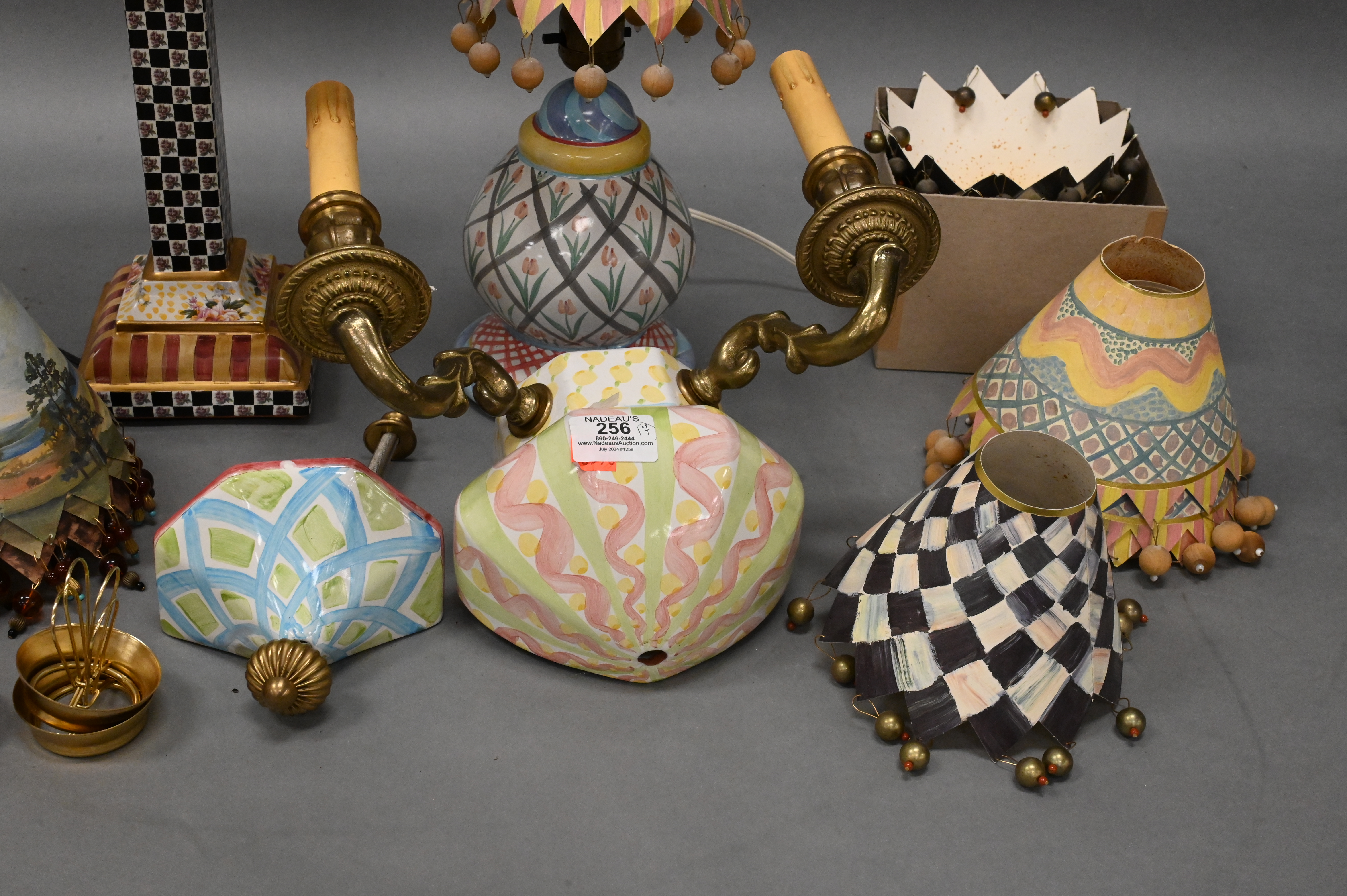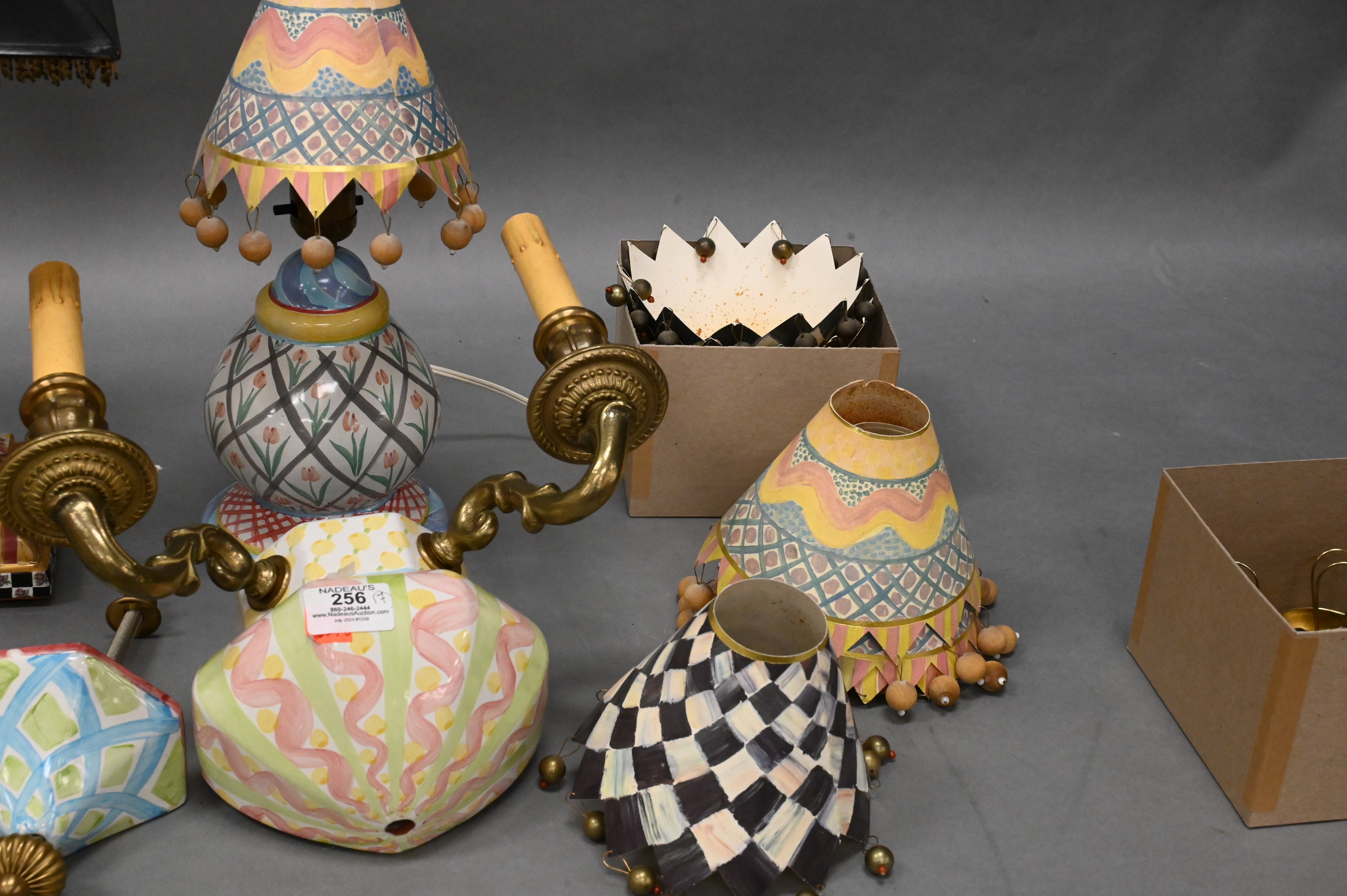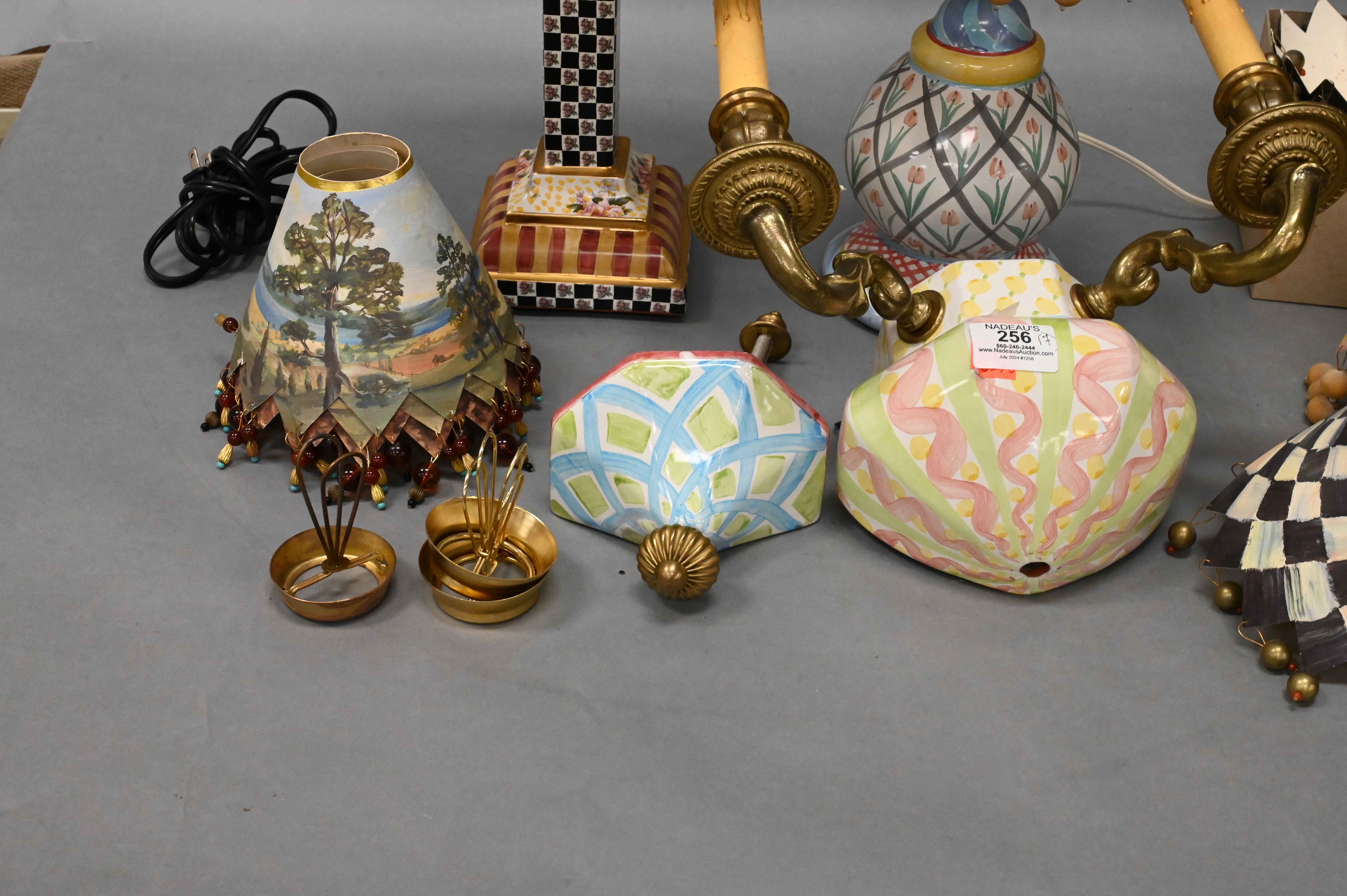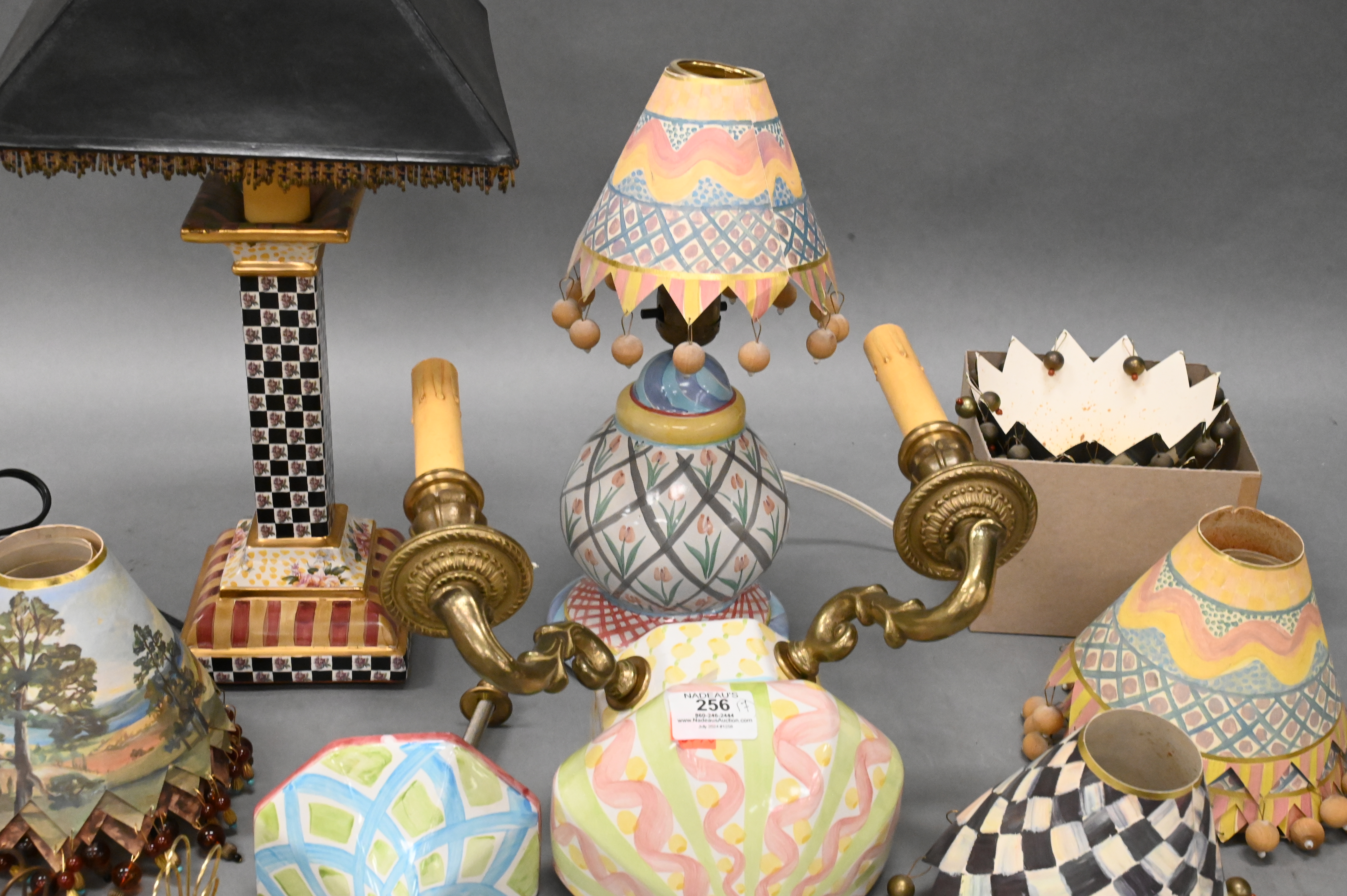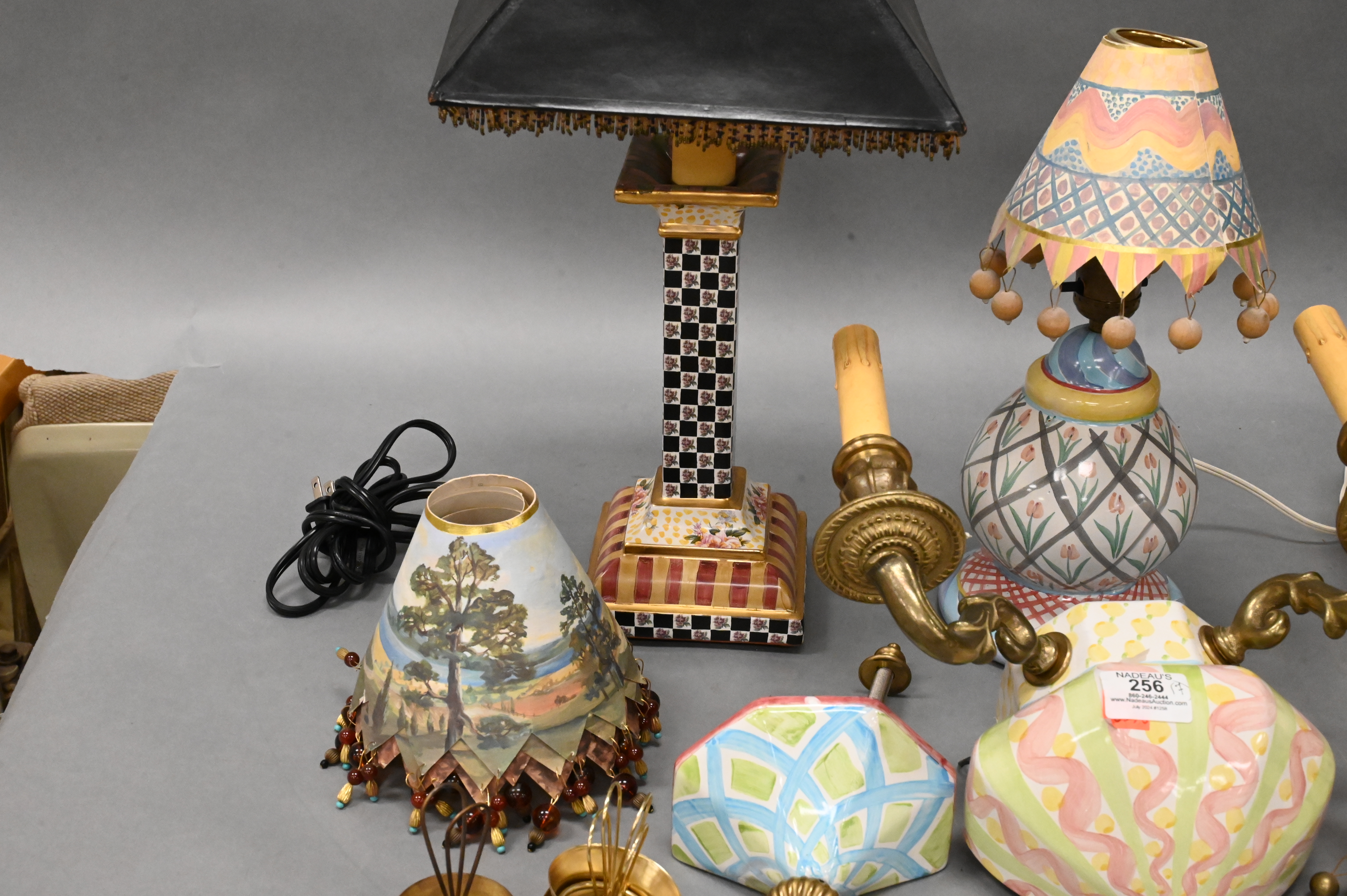to include large group of hand painted paper lamp shades, two light sconce, column form table lamp having tassel shade, and a round table lamp having tulip design