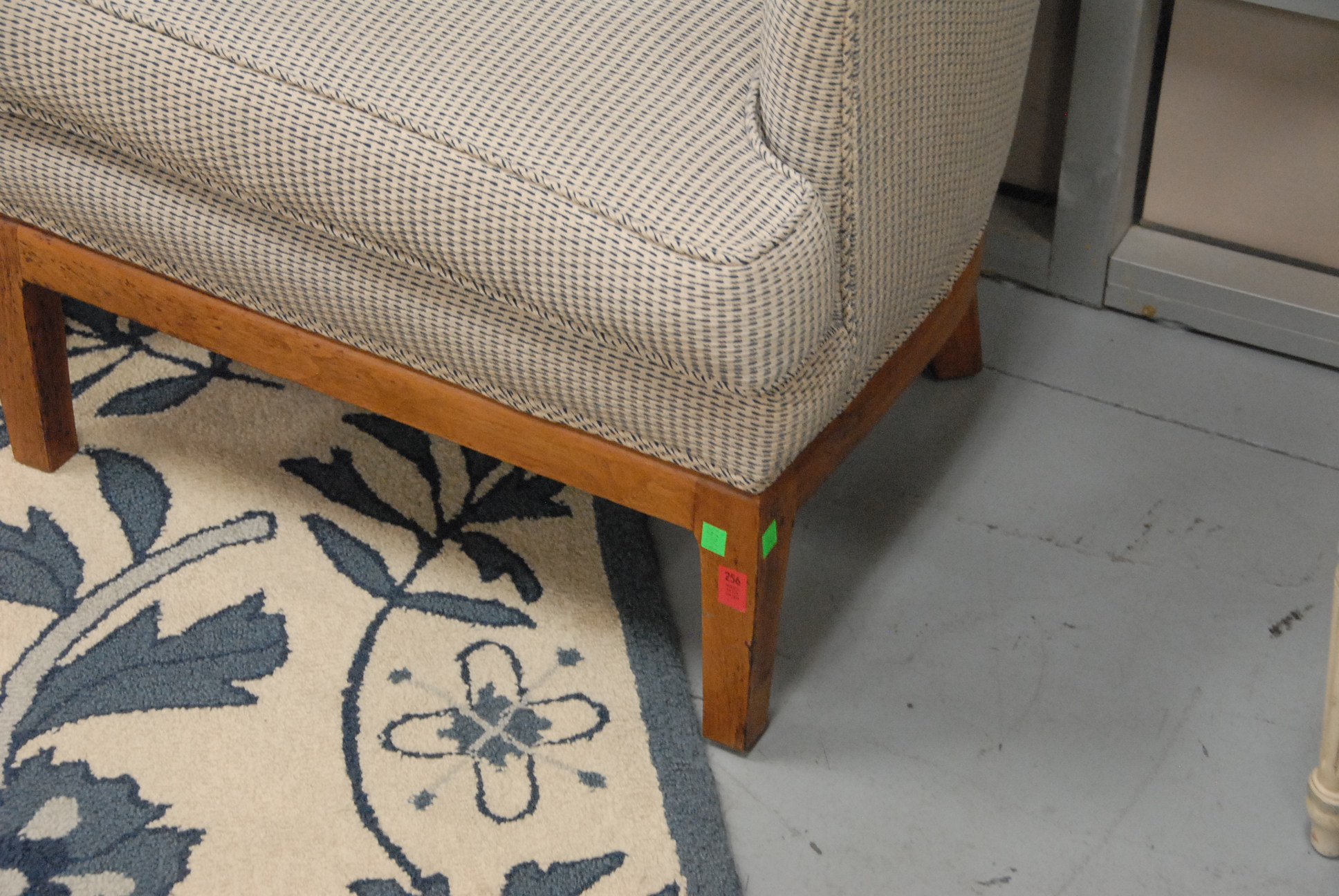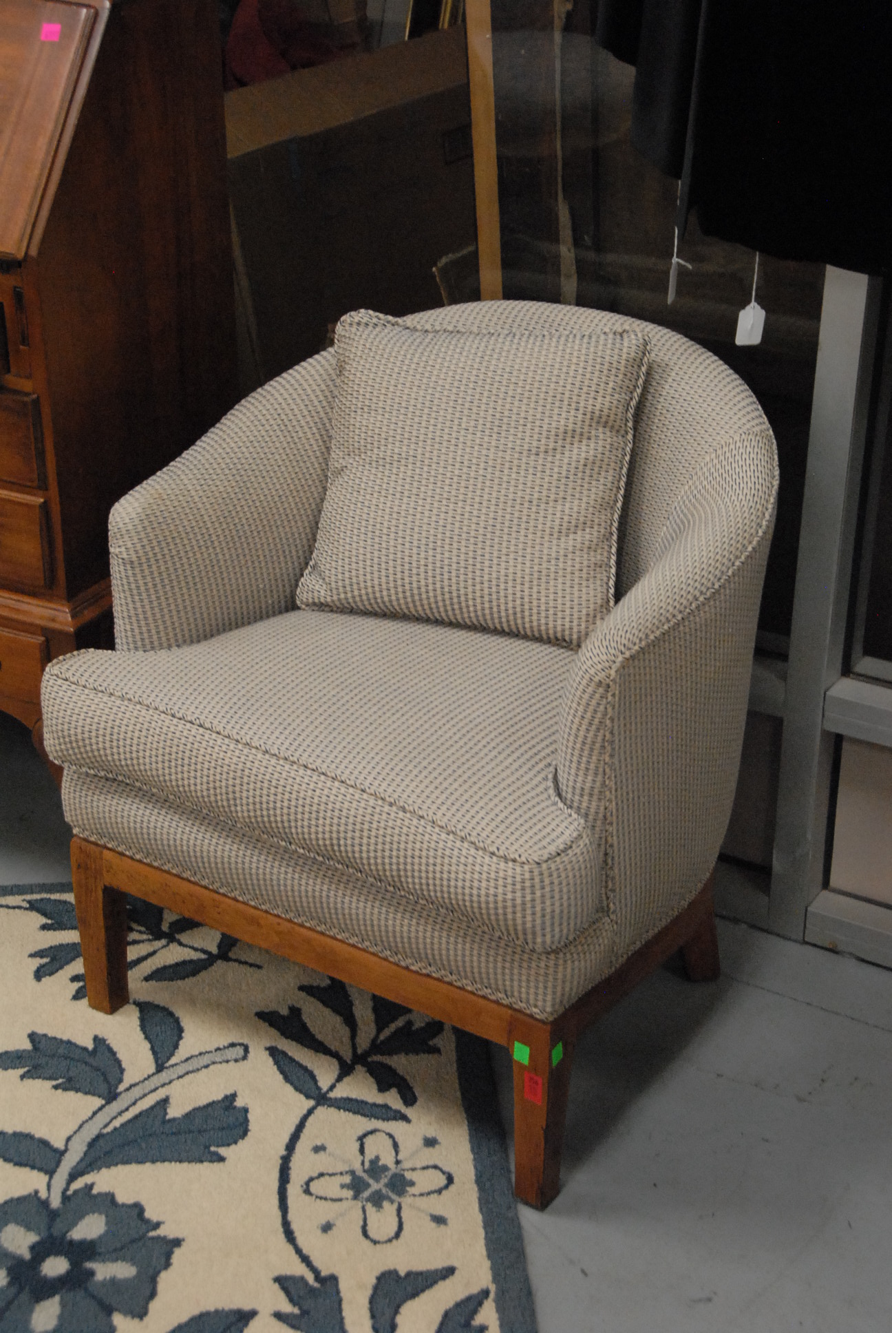 Mid-Century upholstered club chair with a curved back set on an exposed wood base.