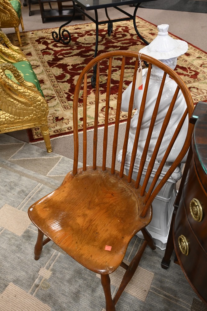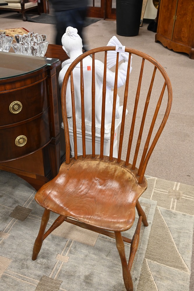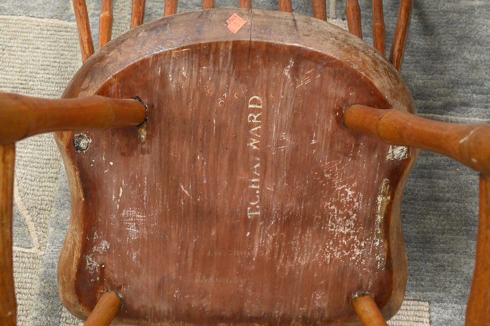 Lot 256: Pair of Bow Back Windsor Side Chairs, signed T.C. Hayward, height 36 3/4 inches.