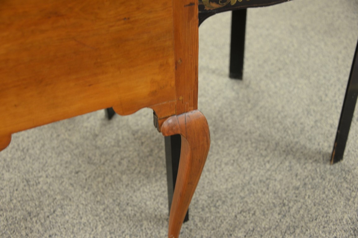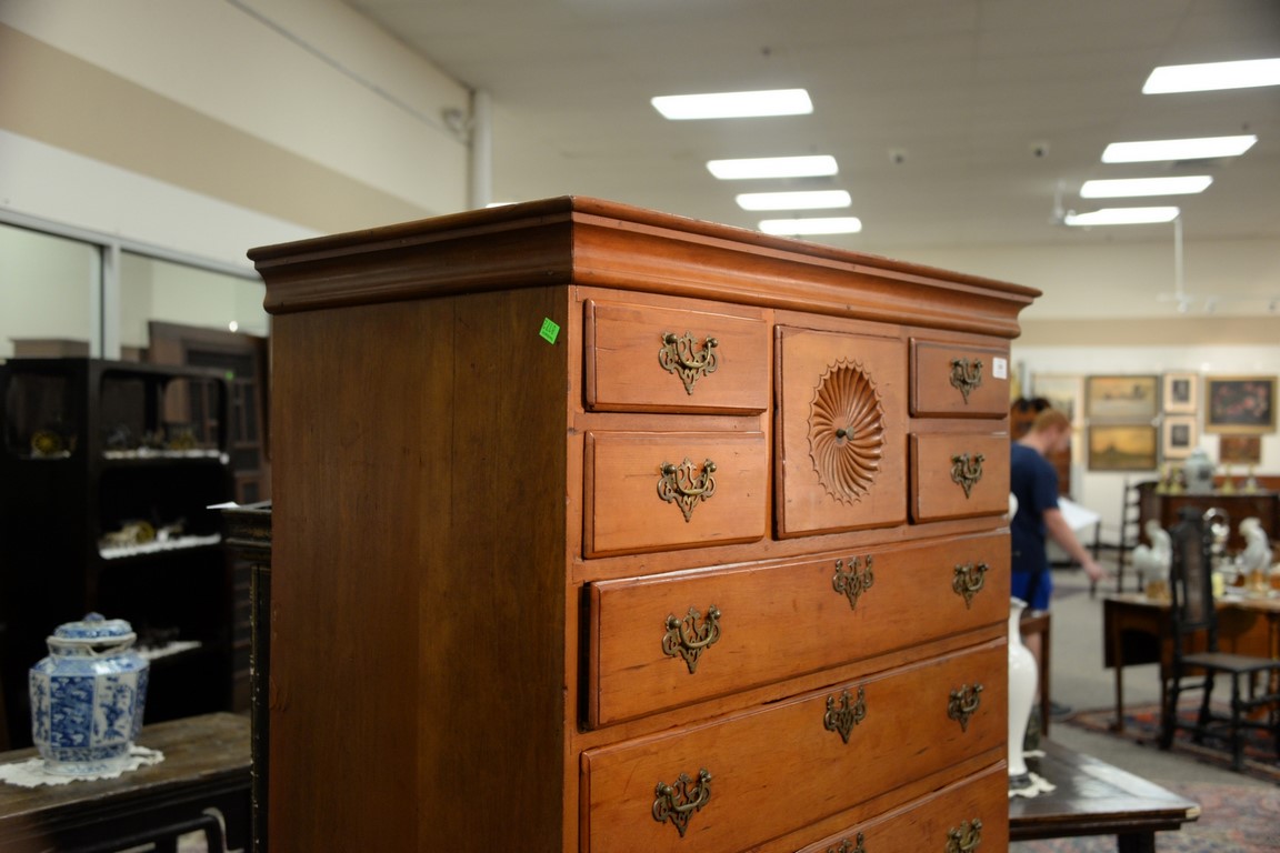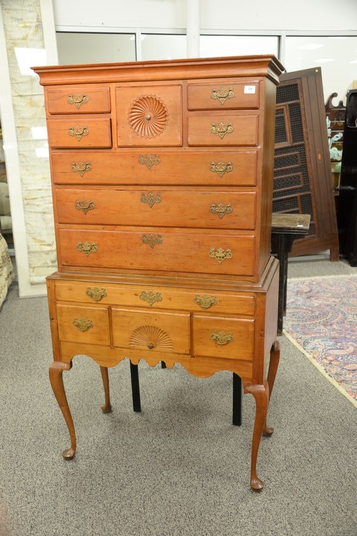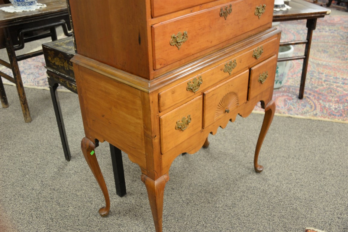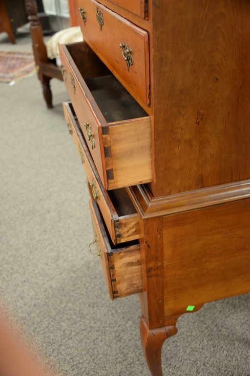 Lot 256: Queen Anne cherry highboy in two parts, upper portion with large cornice molding over pinwheel center drawer flanked by dual short d…