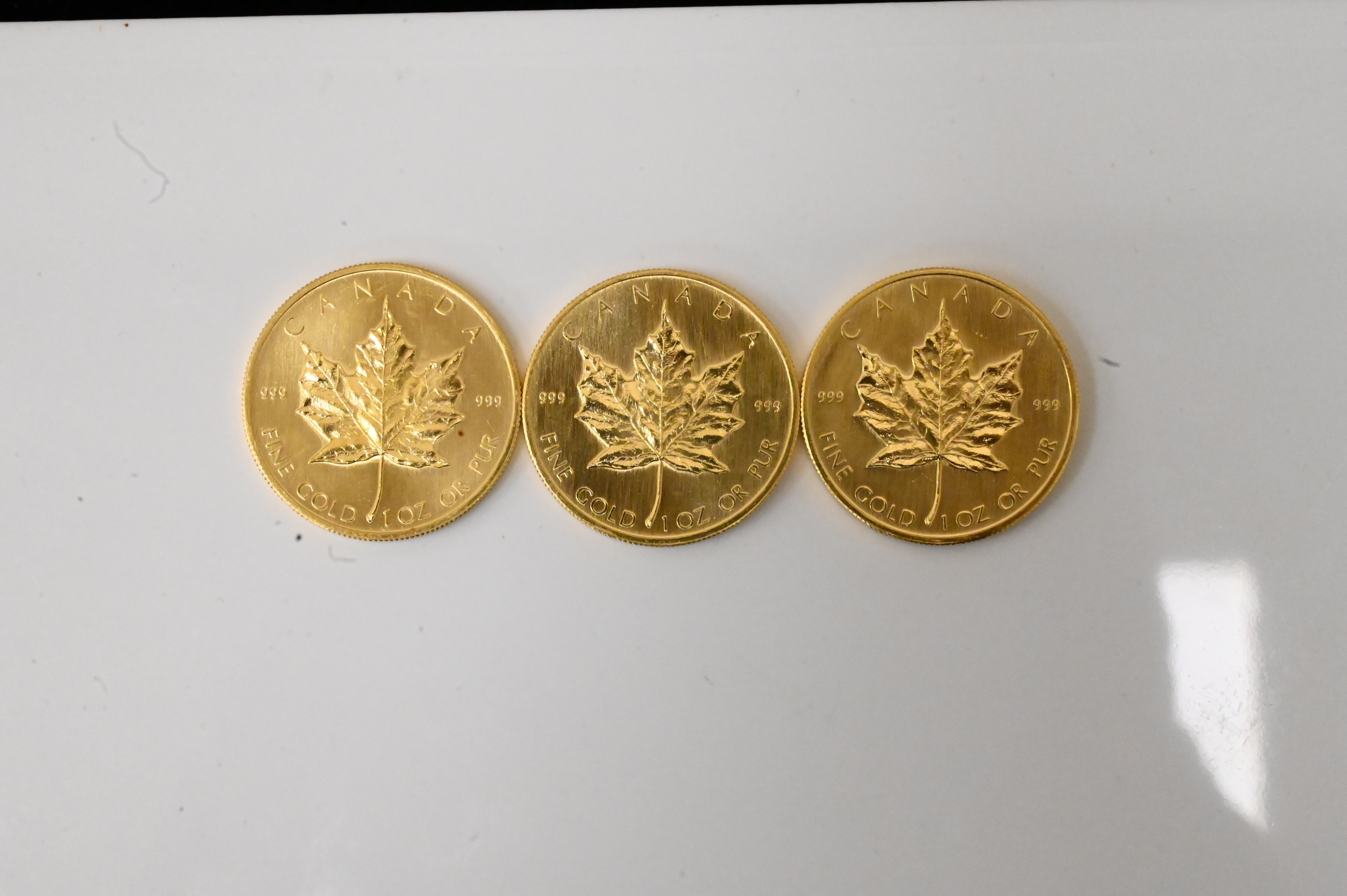 Three 1979 Canadian One Ounce Fine Gold $50 Maple Leafs, 3 oz total