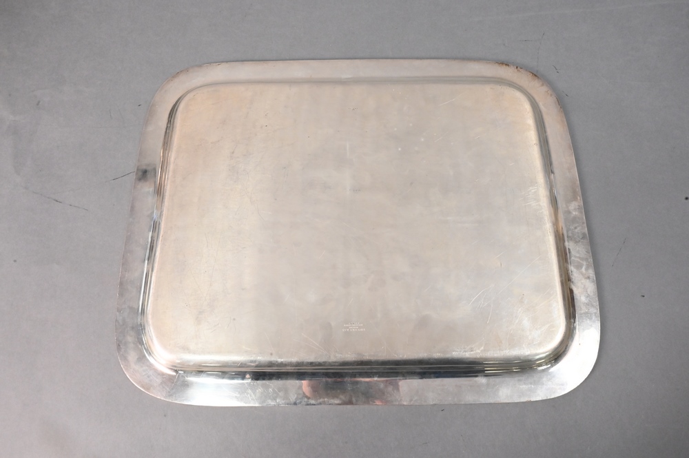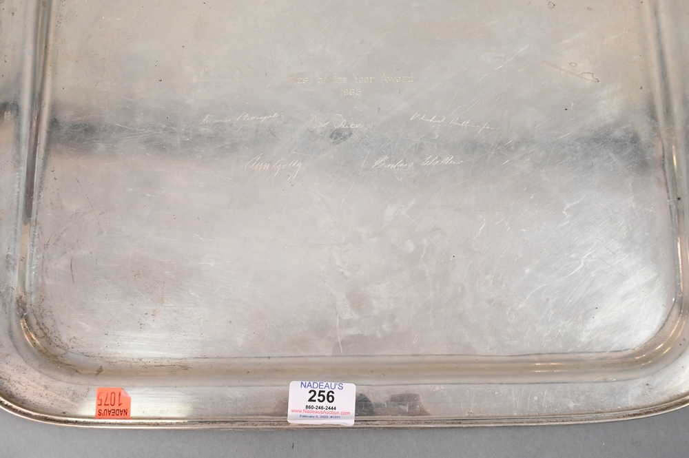 Lot 256: Tiffany Sterling Silver Tray, engraved as award “Host of the Year Award 1986”, signed Ann Getty, Barbara Walters, Michael Huffington, etc., 66.5 t.oz.