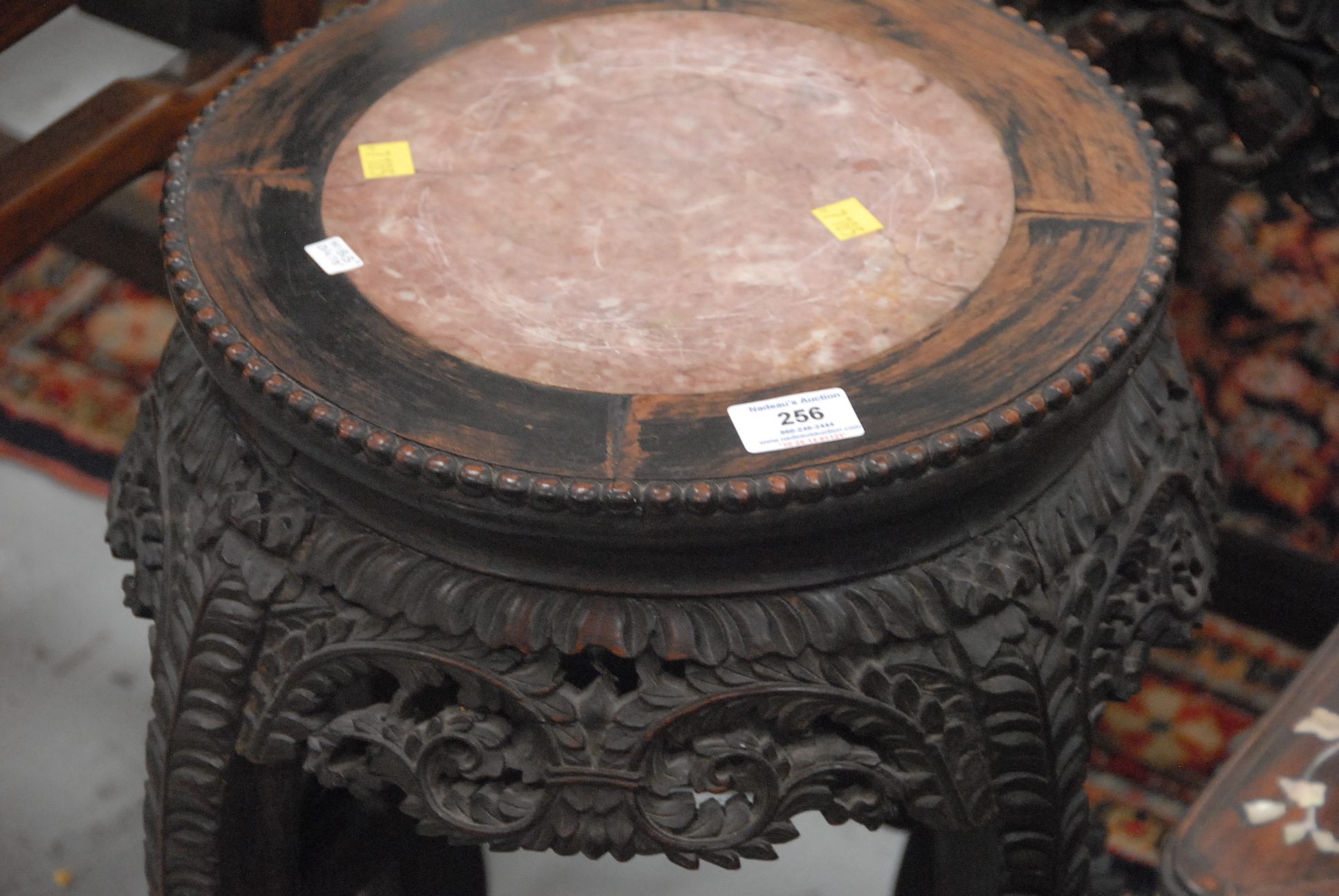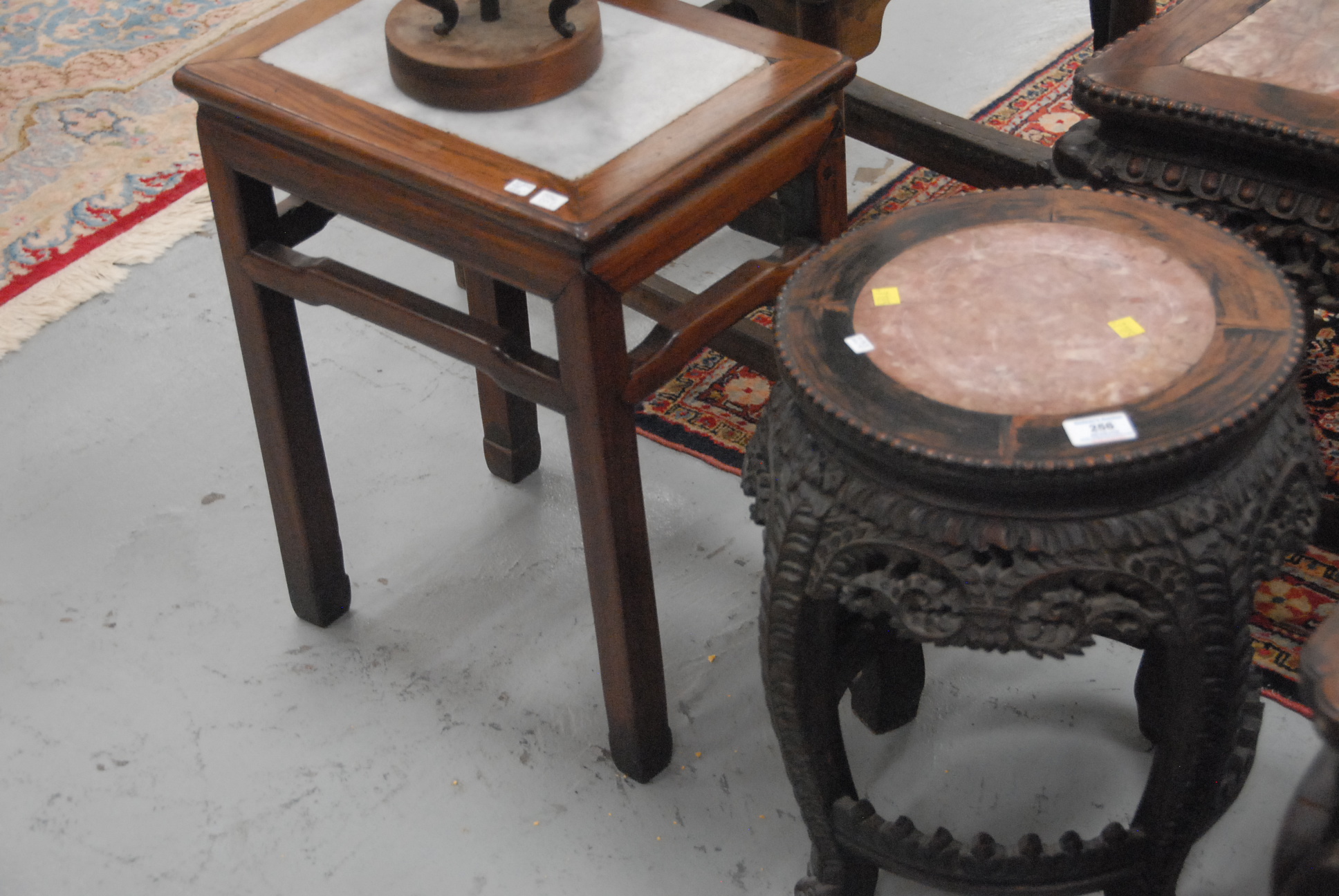 Two Chinese teak stands, one rectangular and one round with inset marble.