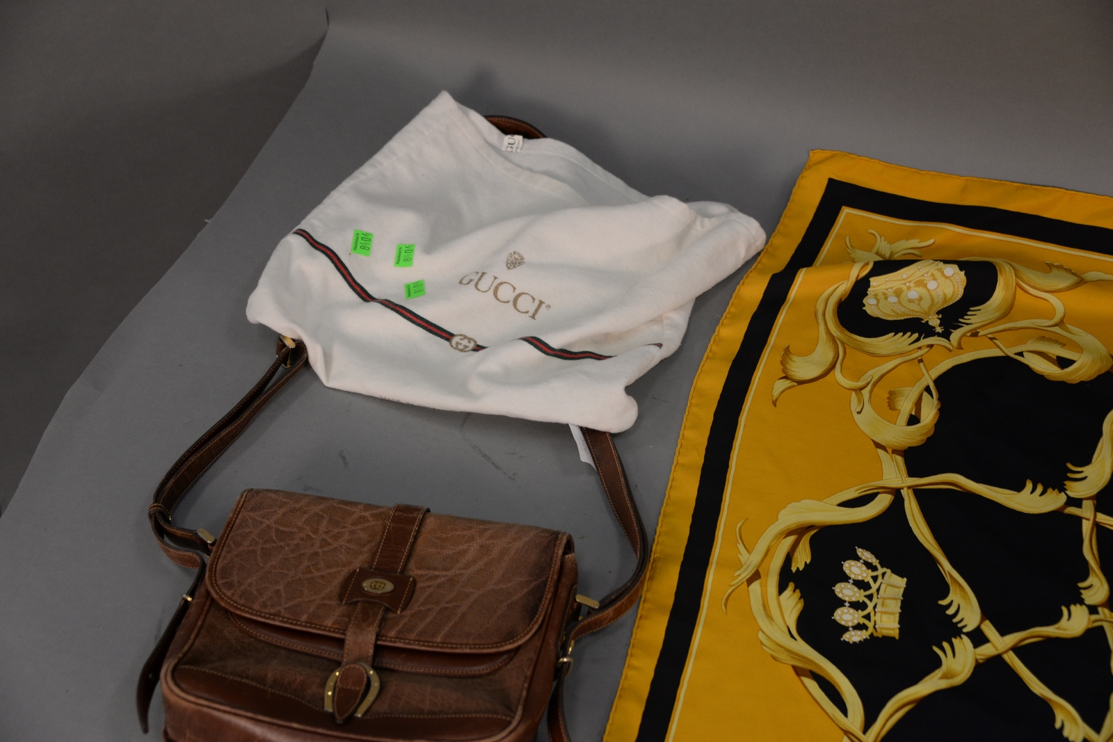 Two piece lot to include Hermes silk scarf and a Gucci tan leather purse.