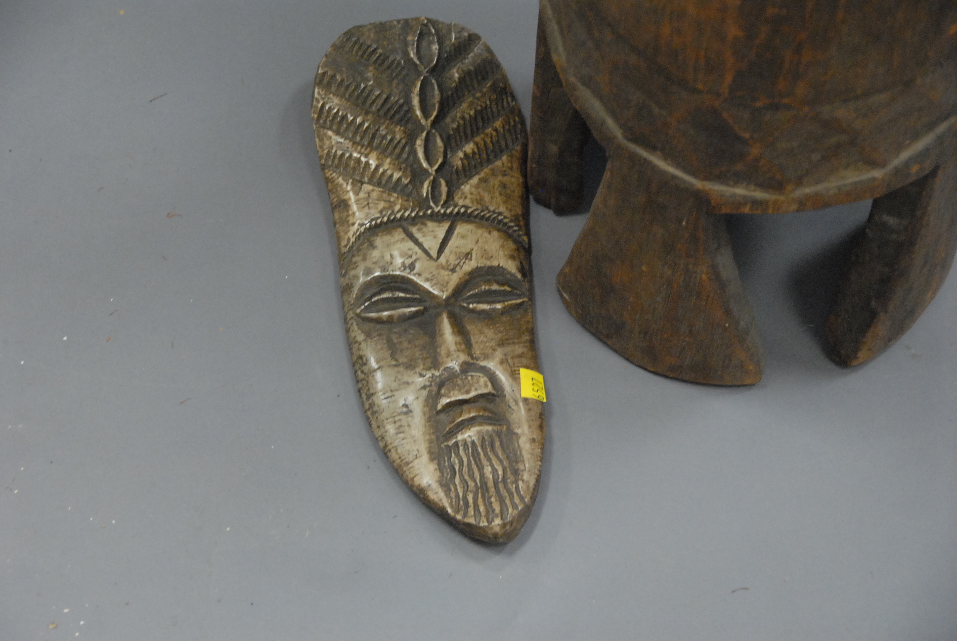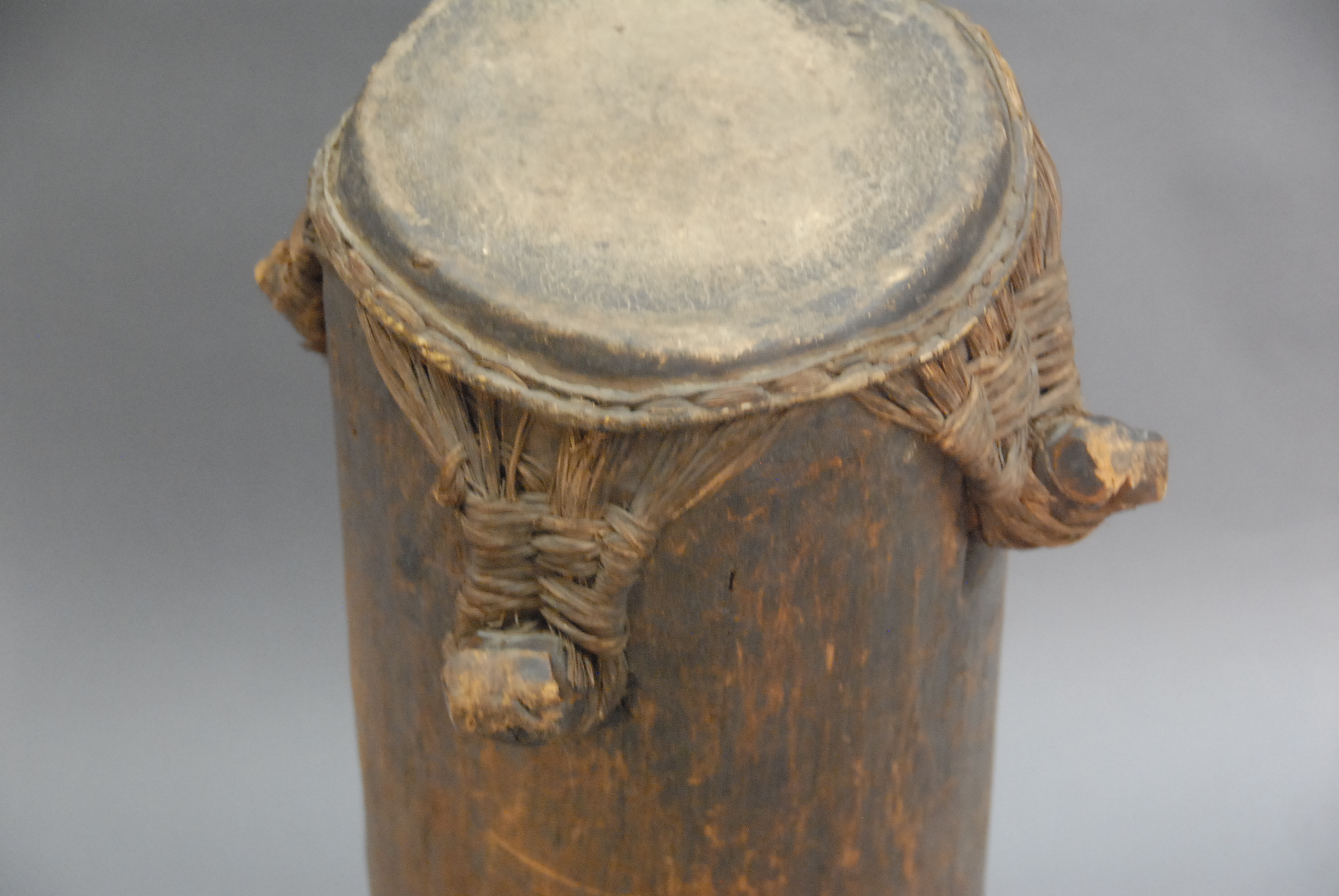 Two piece lot West African drum and bone mask in the style of the Baule Tribe, ht. 26.