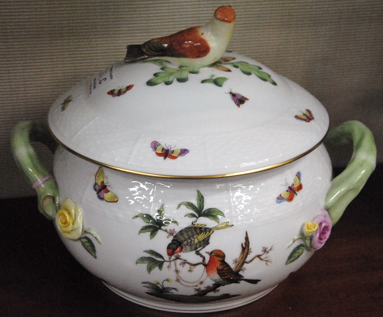 Herend Rothchild tureen with cover and bird finials, height 8 3/4in.
