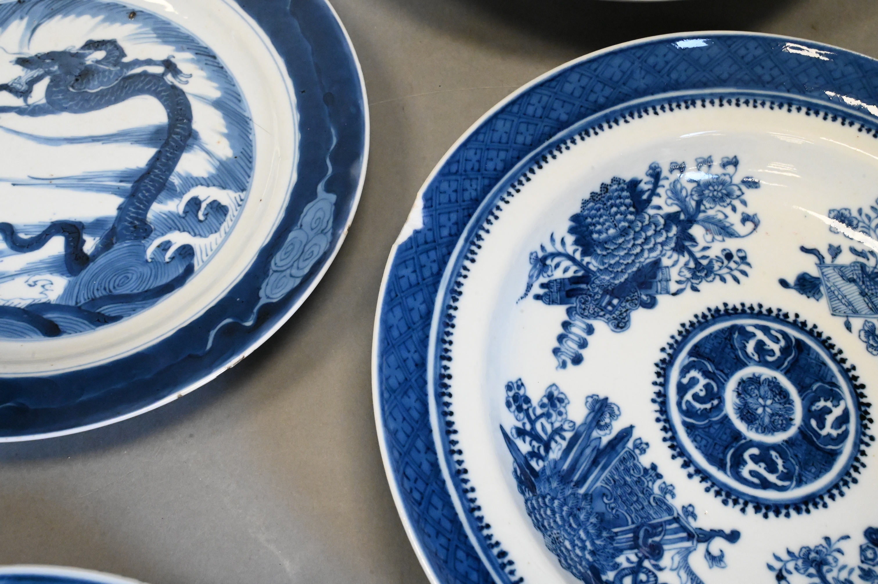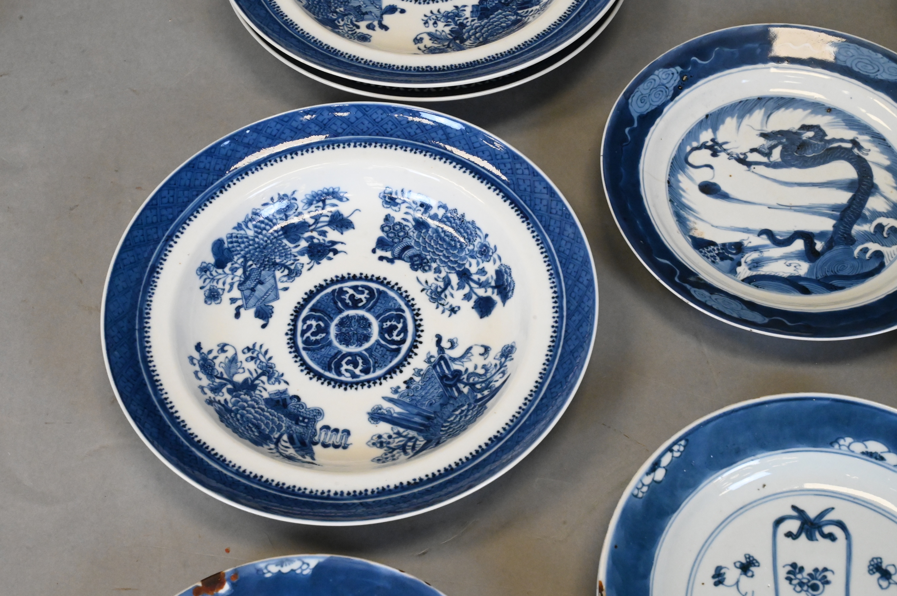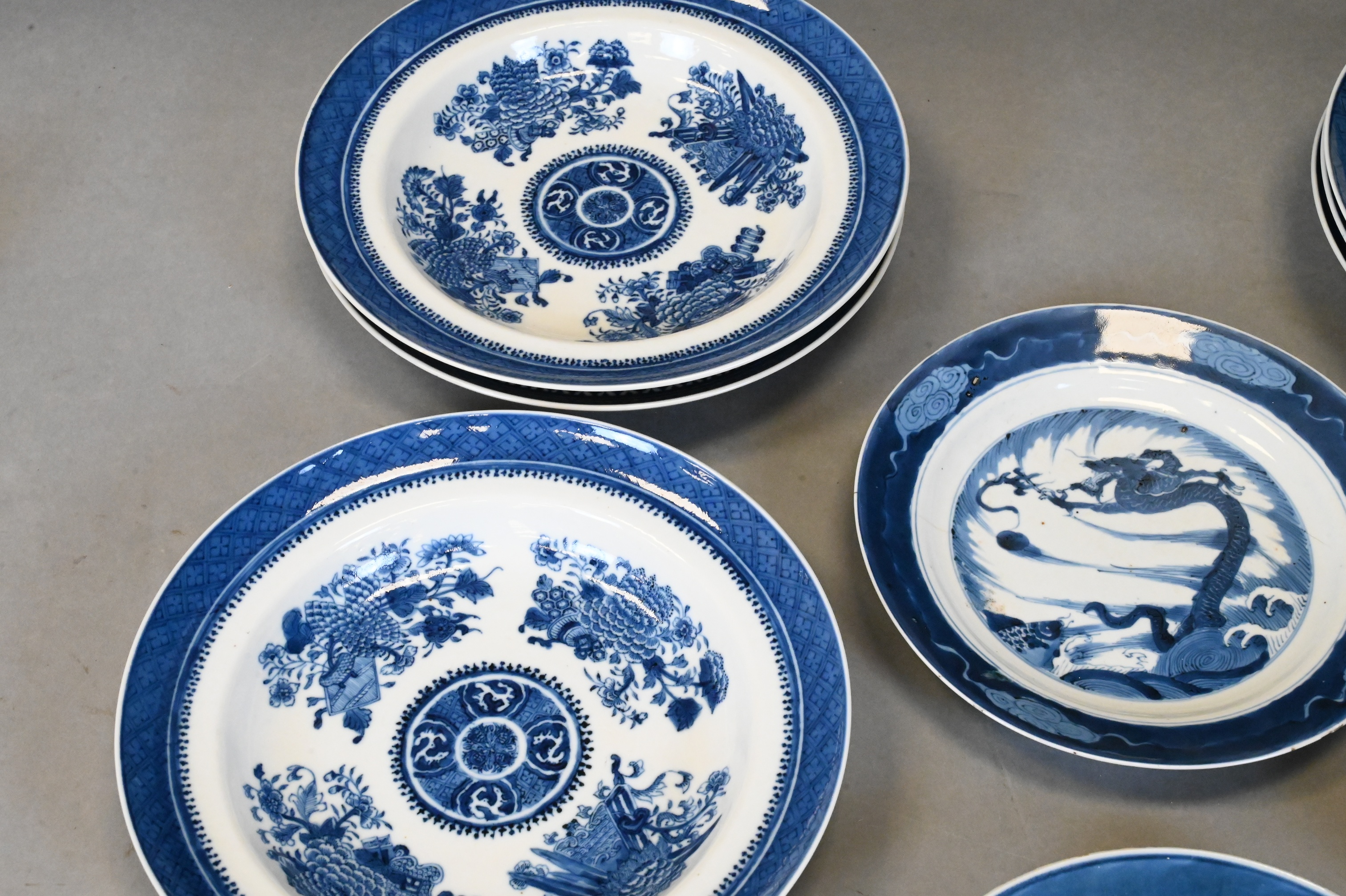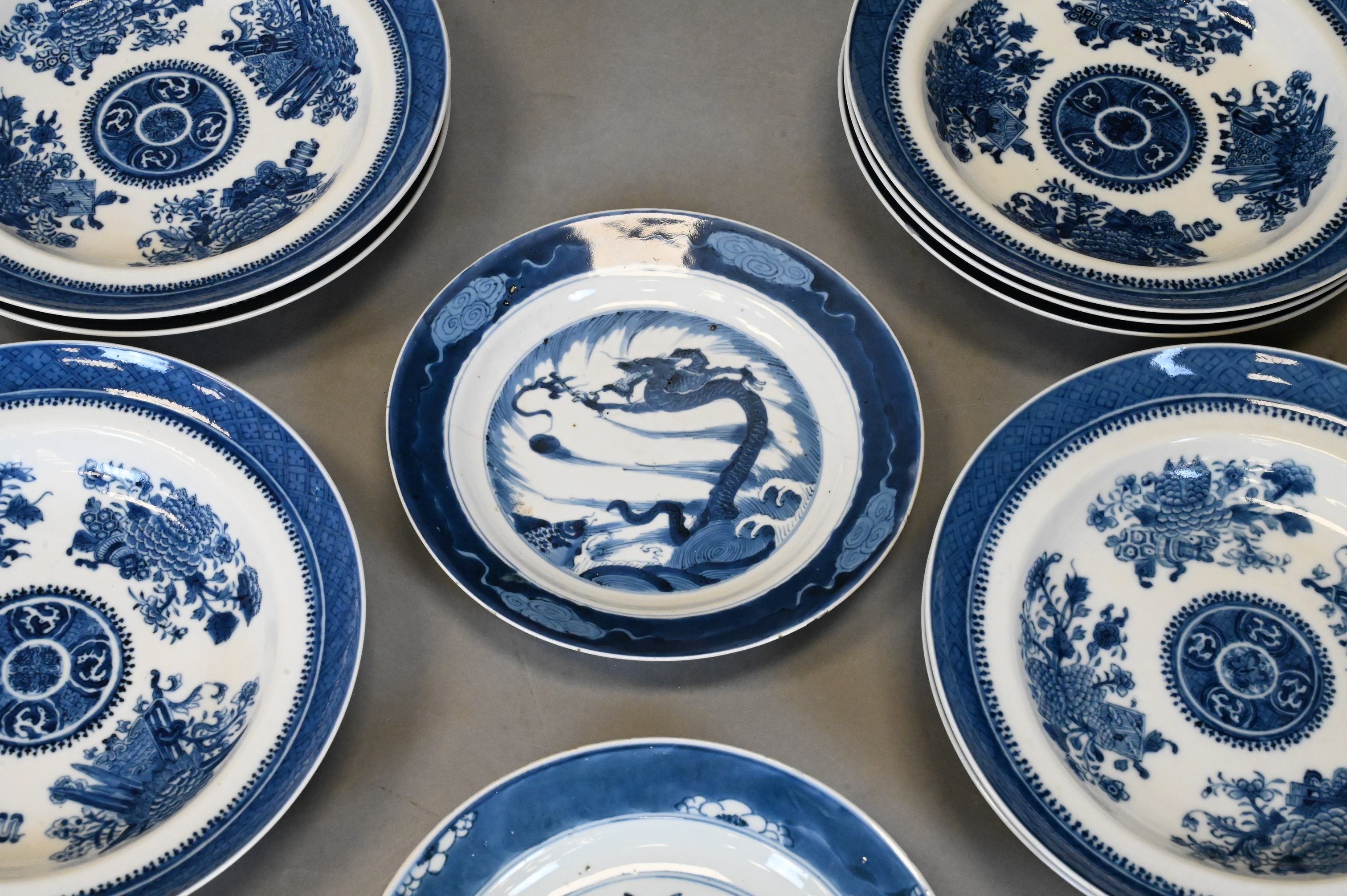 to include set of eight Chinese export Nan King deep plates, four Canton deep plates, baskets of flowers, white round dragon amongst waves plate, two stapled rim chips, small rim chips to three of the Nan Kings