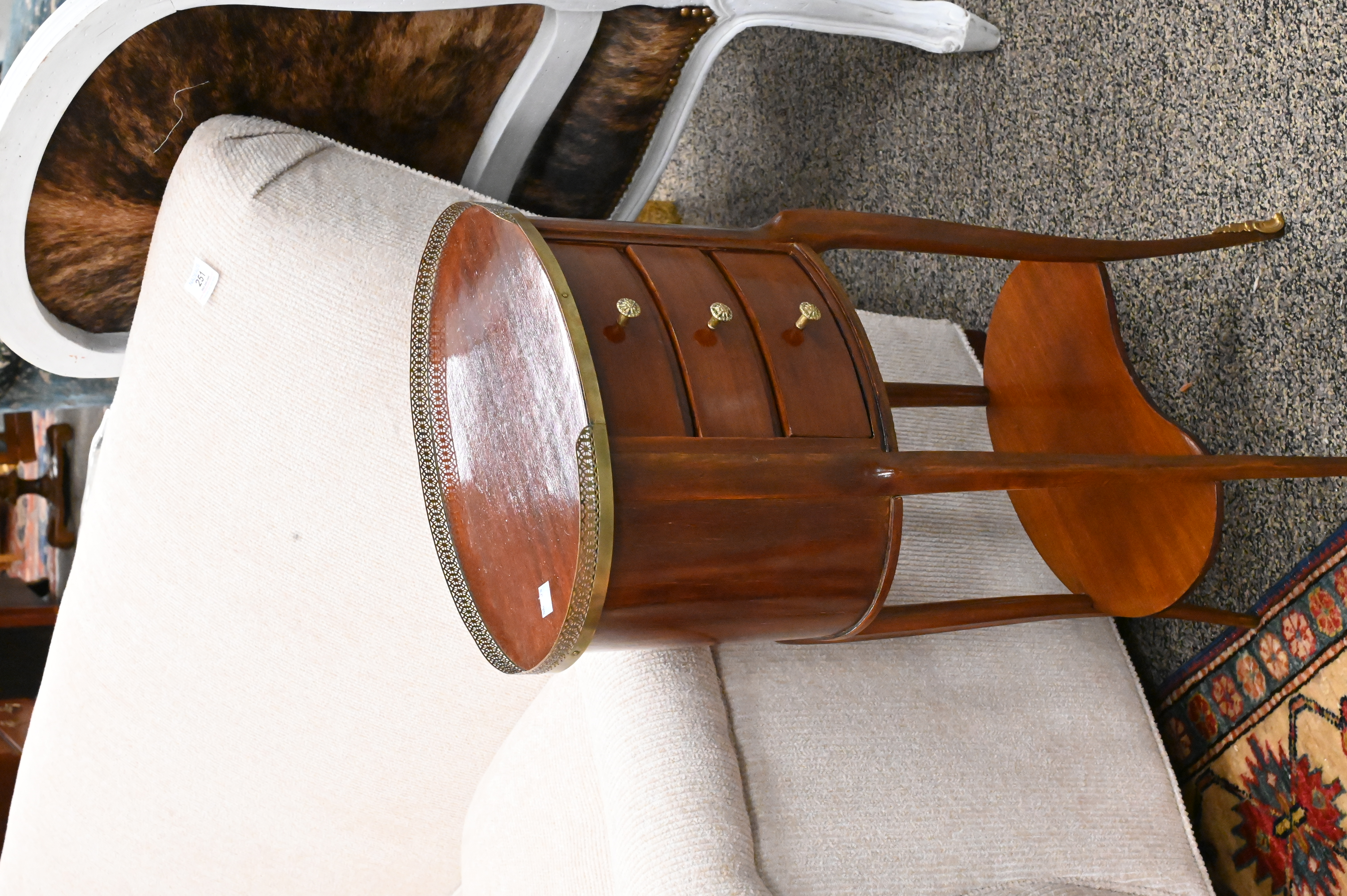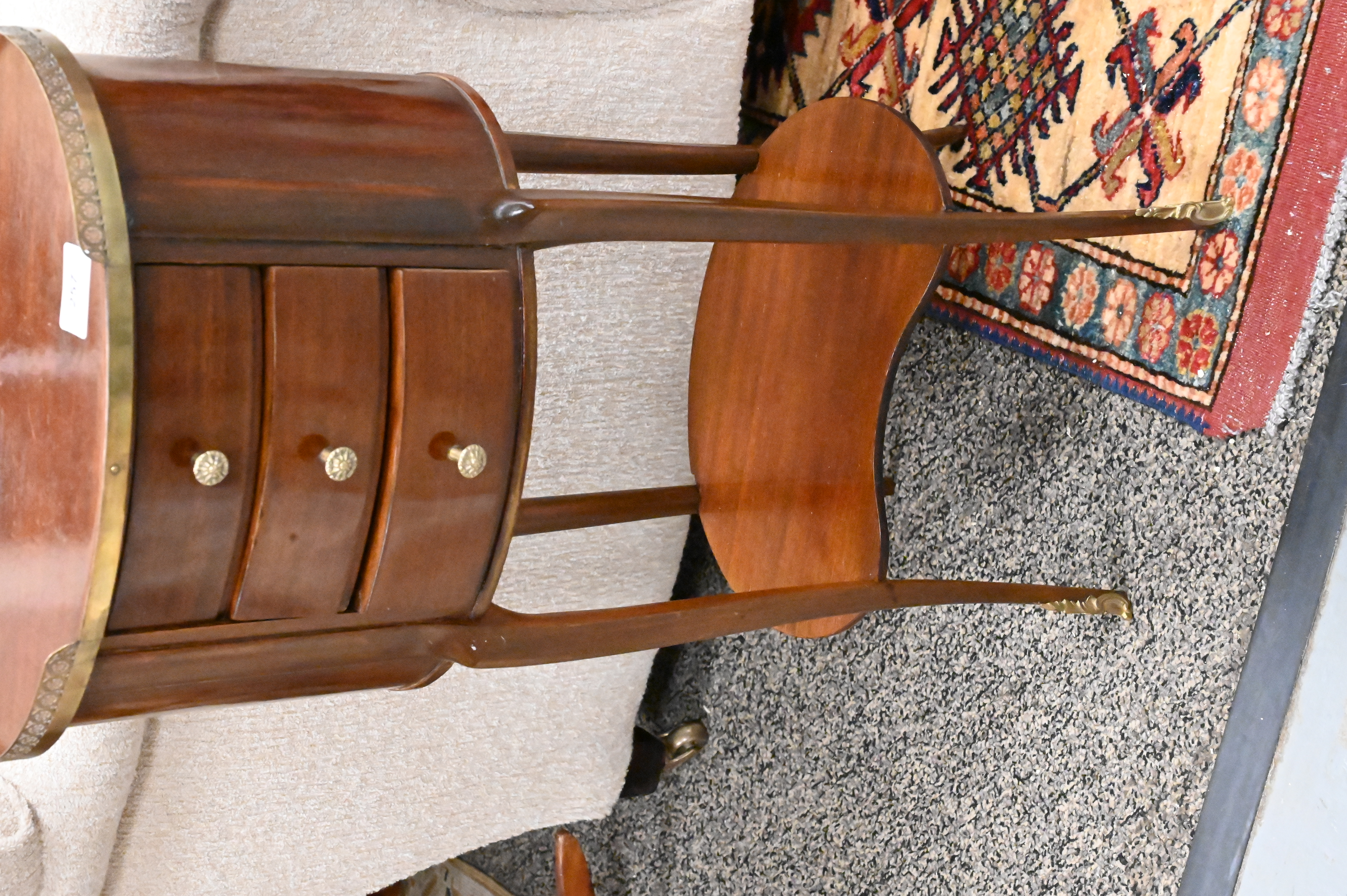 A Pair of Mahogany Louis XV Style Stands, having three drawers, oval form, height 28 inches, top 10″ x 13 3/4″.
