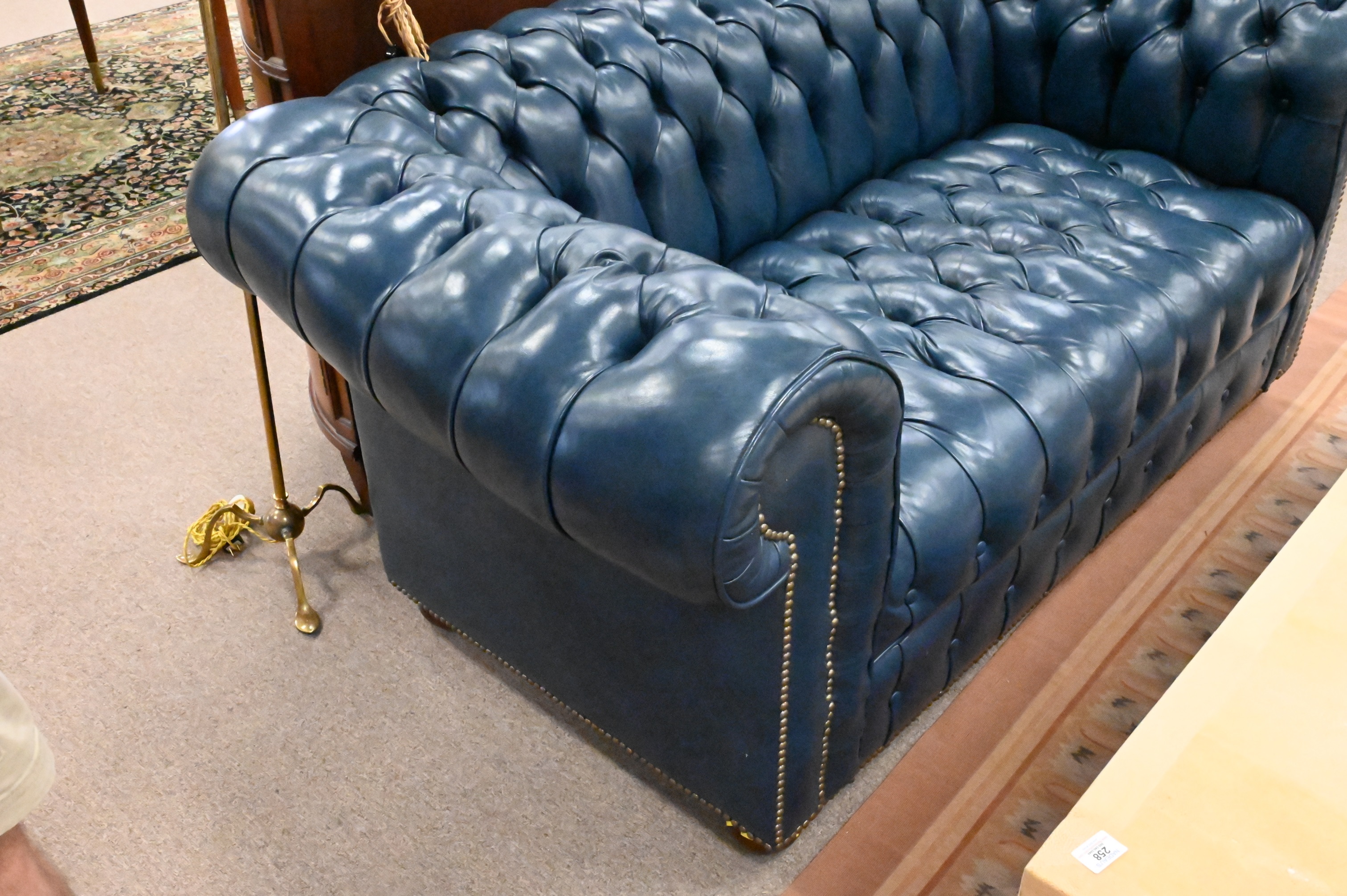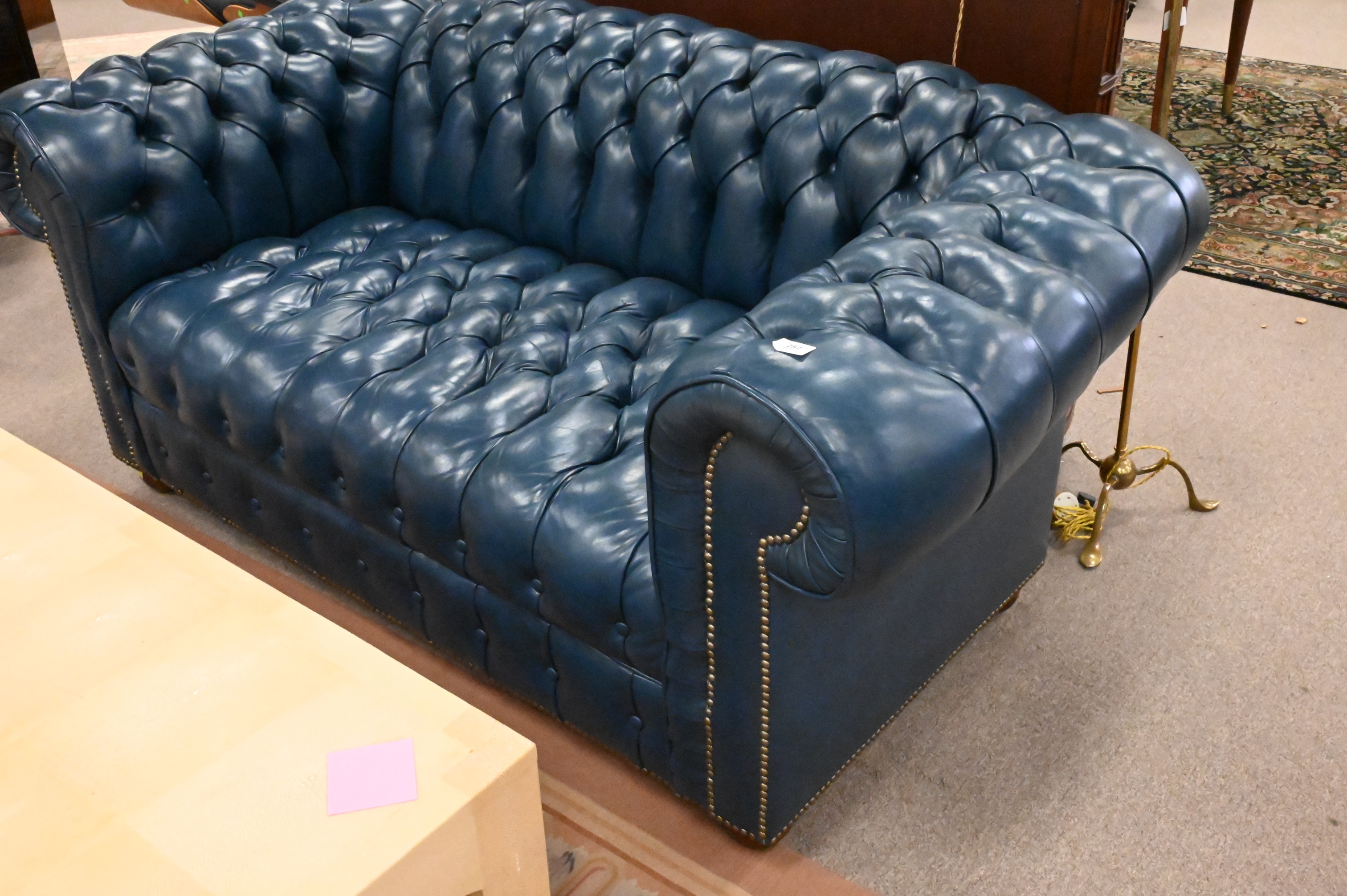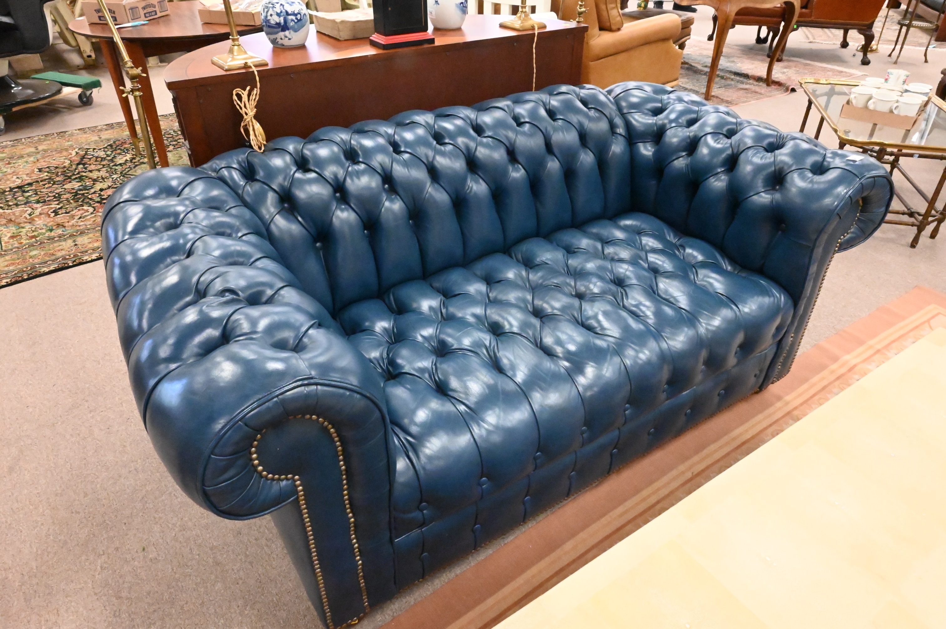 Blue Leather Chesterfield Tufted Loveseat, having rolled arms and bun feet, height 30 inches, length 68 inches, depth 35 inches.