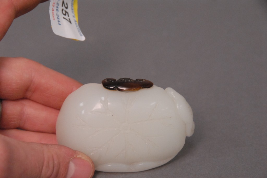 Lot 257: Carved white jade fish with two lingzhi mushrooms one brown lingzhi all on a leaf, lg. 3.