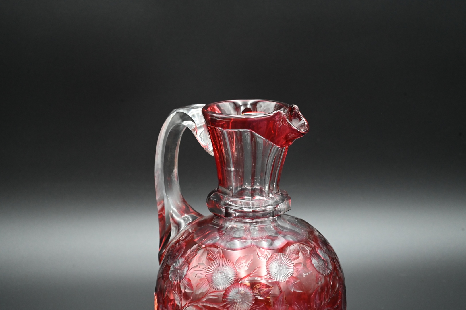Cranberry Cut to Clear Pitcher, decorated with flowers, height 8 inches, Provenance: Estate of Cyril H. Moore Jr, Kent, Connecticut.