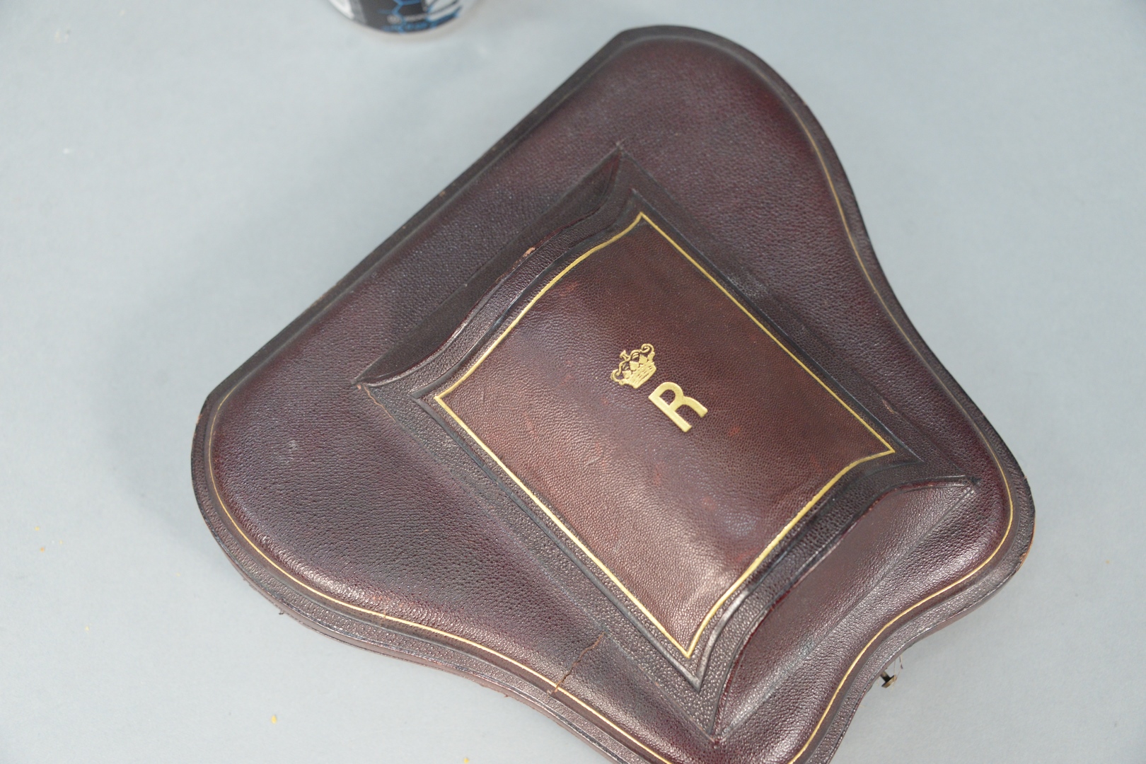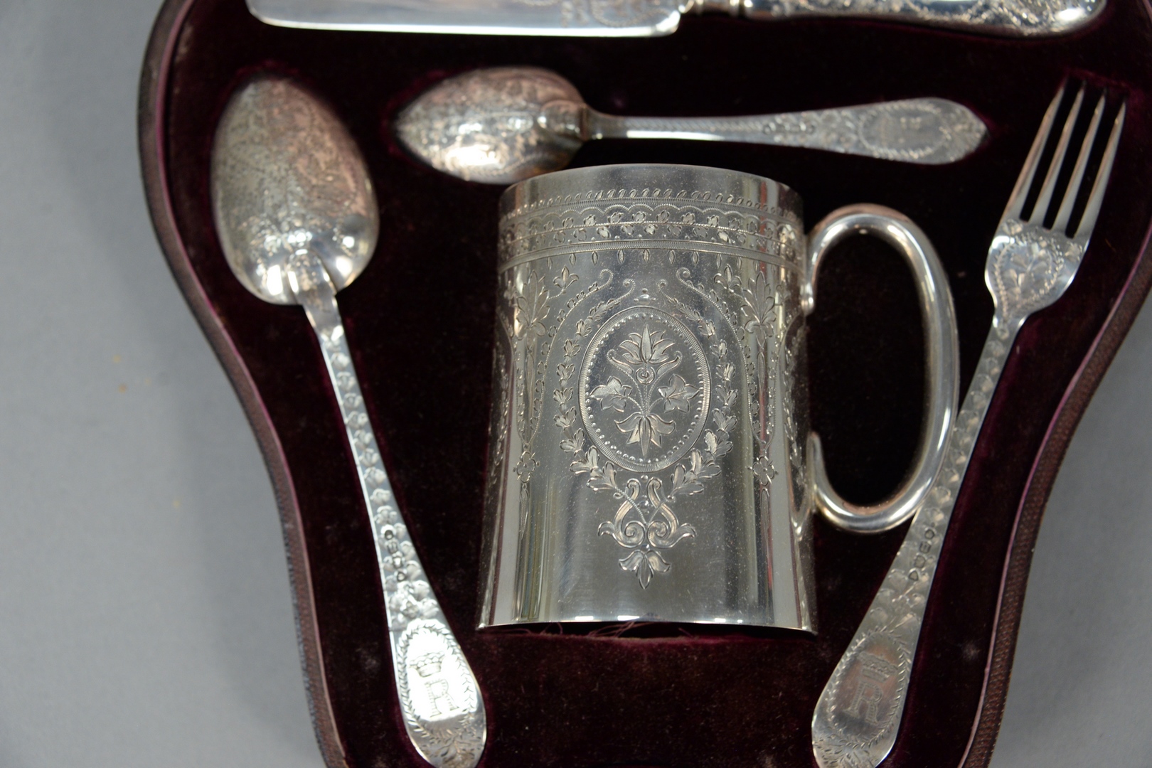 Edward Barnard & Sons Silver Five Piece Travel Set in a fitted box, to include fork, knife, two spoons and mug, all with chased designs and monogrammed R, topped with crown marked J-EBW-J-for John Edward, leather embossed fitted case, stamped Leuchars & Son, Piccadilly, London, 2 Rue De La Paix, Paris height of cup 3 3/4 inches 9.57 troy ounces plus knife Walter & John Barnard