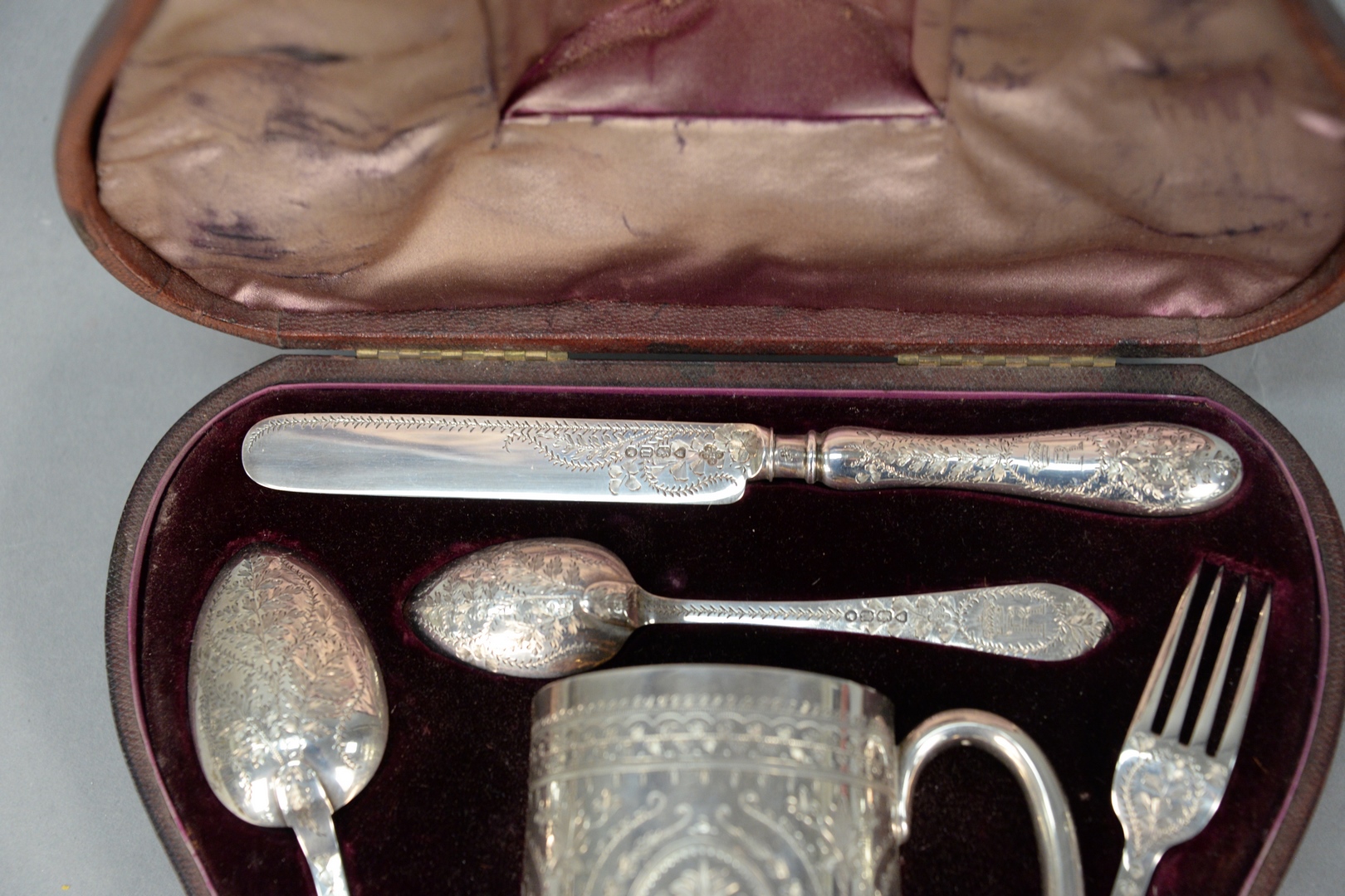 Lot 257: Edward Barnard & Sons Silver Five Piece Travel Set in a fitted box, to include fork, knife, two spoons and mug, all with chased de…