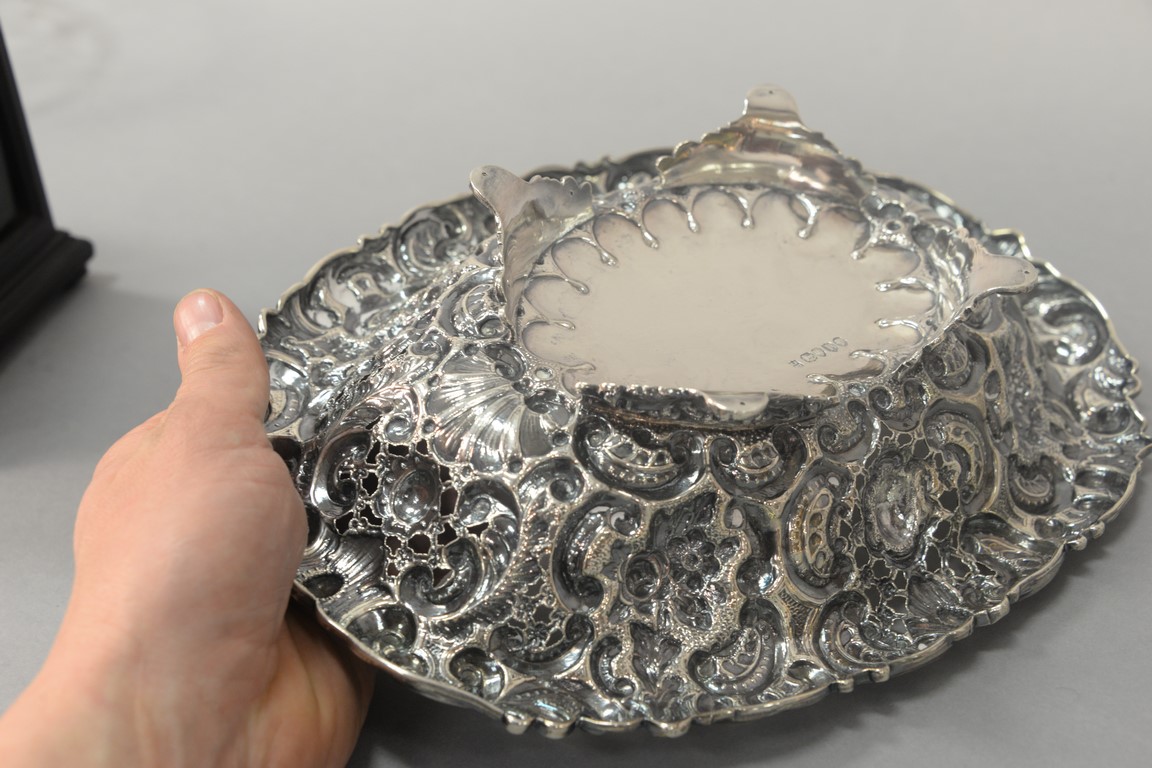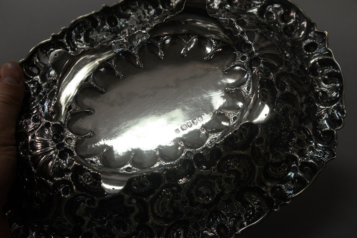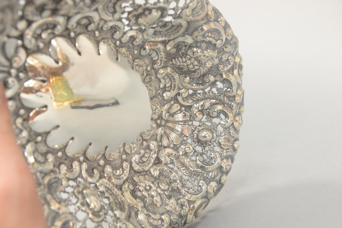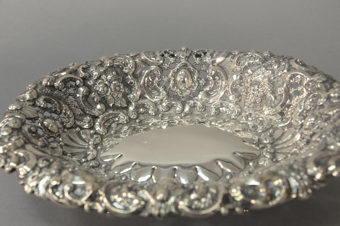 English silver oval footed bowl with fruit and floral embossed reticulated sides.