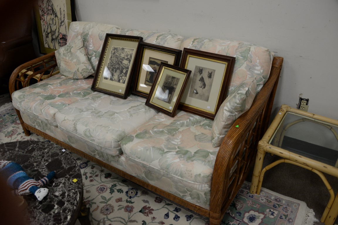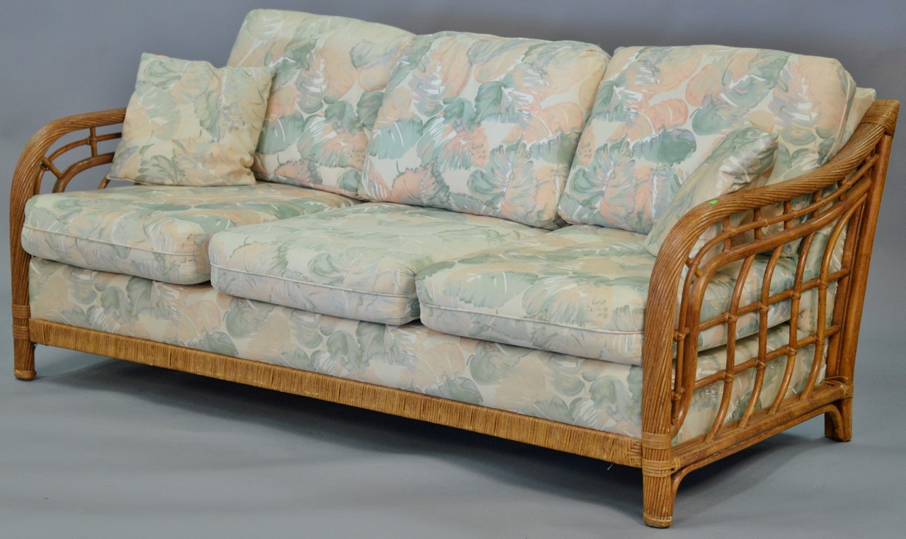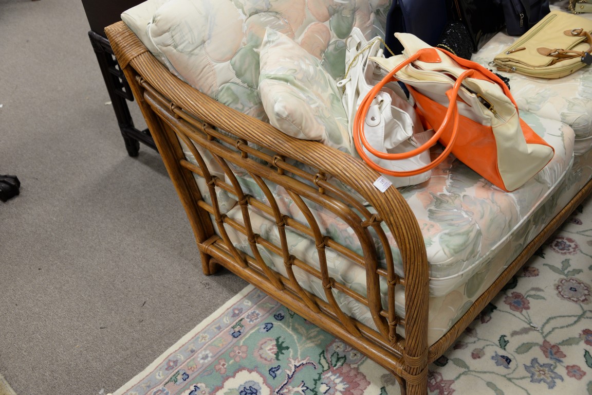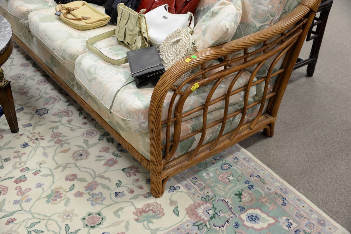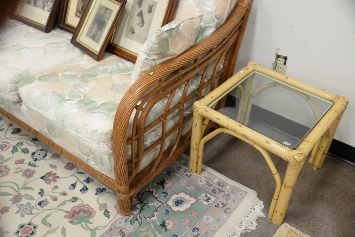 Lot 257: Four piece lot to include a pair of rattan sofas and two glass top tables. sofas: lg. 73 1/2in.