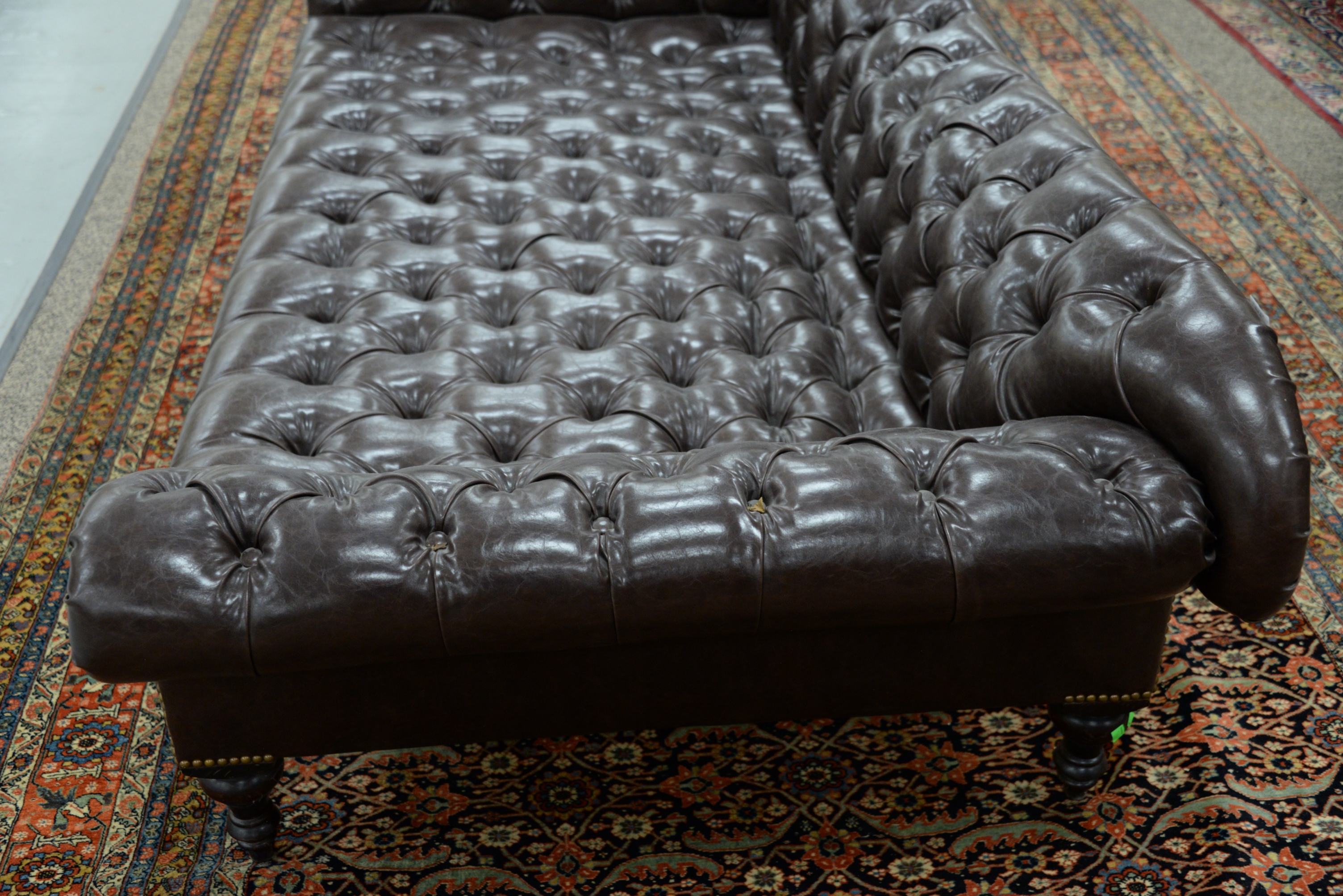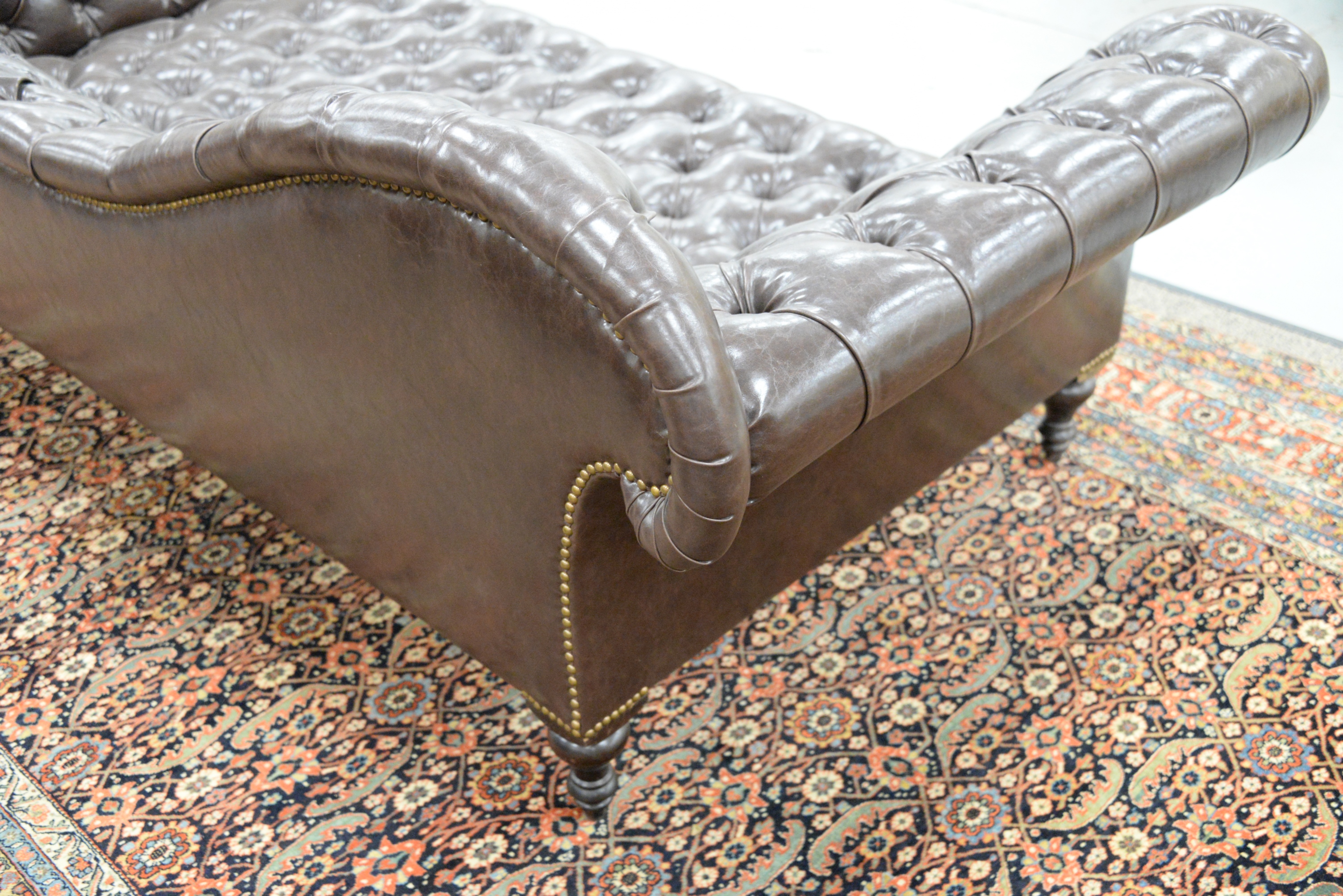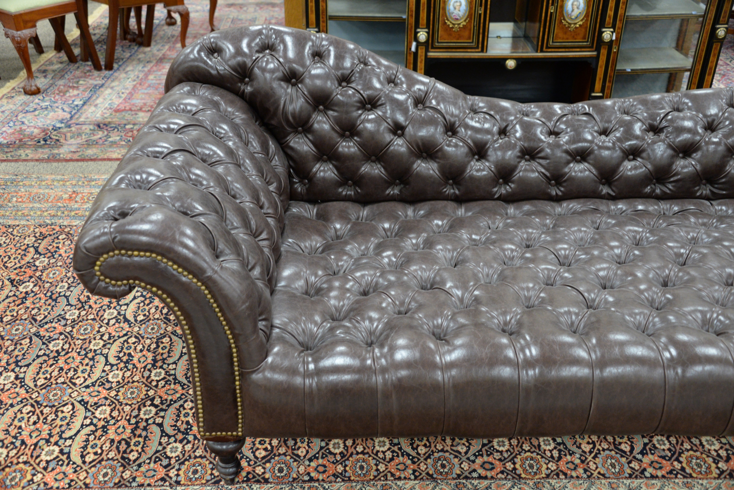 George Smith Brown Leather Recamier, “Dog Kennel Bed”, buttoned, height 33 inches (at highest point), length 90 inches, depth 41 inches, retail $20,400.