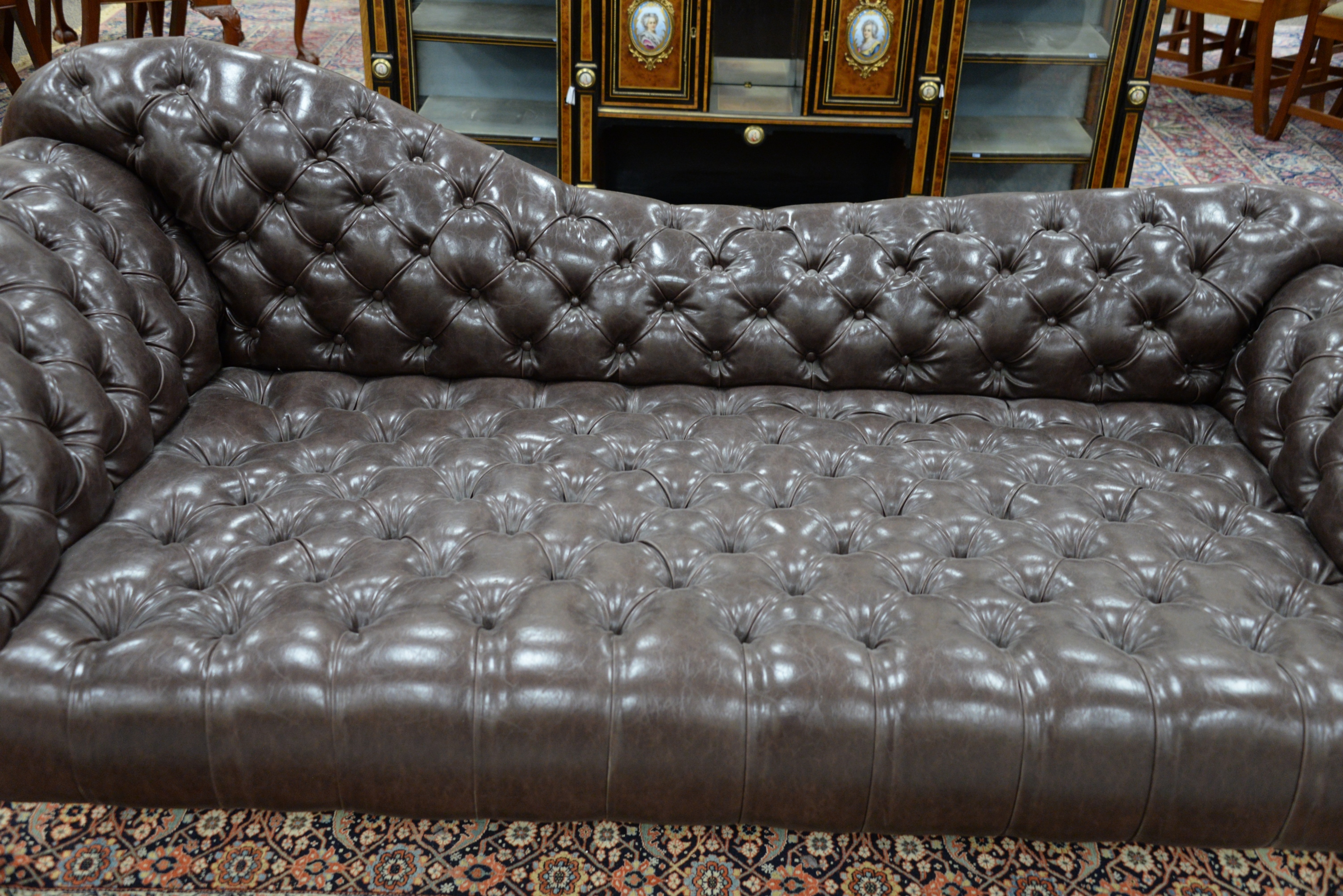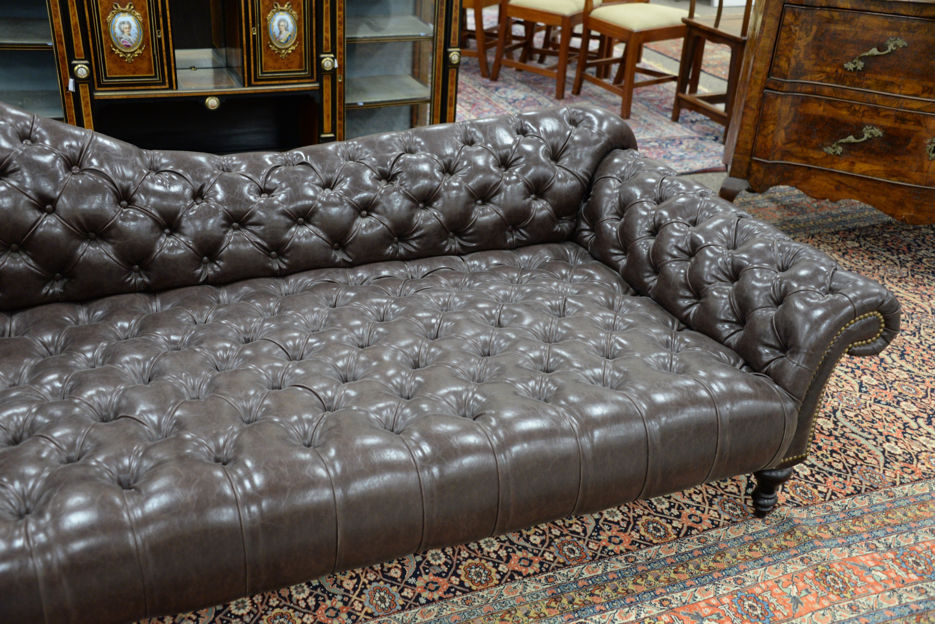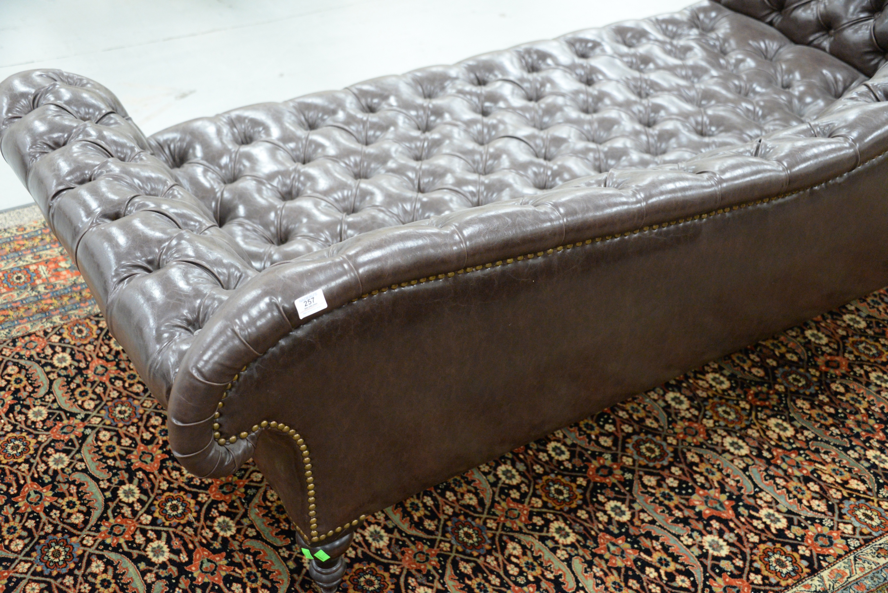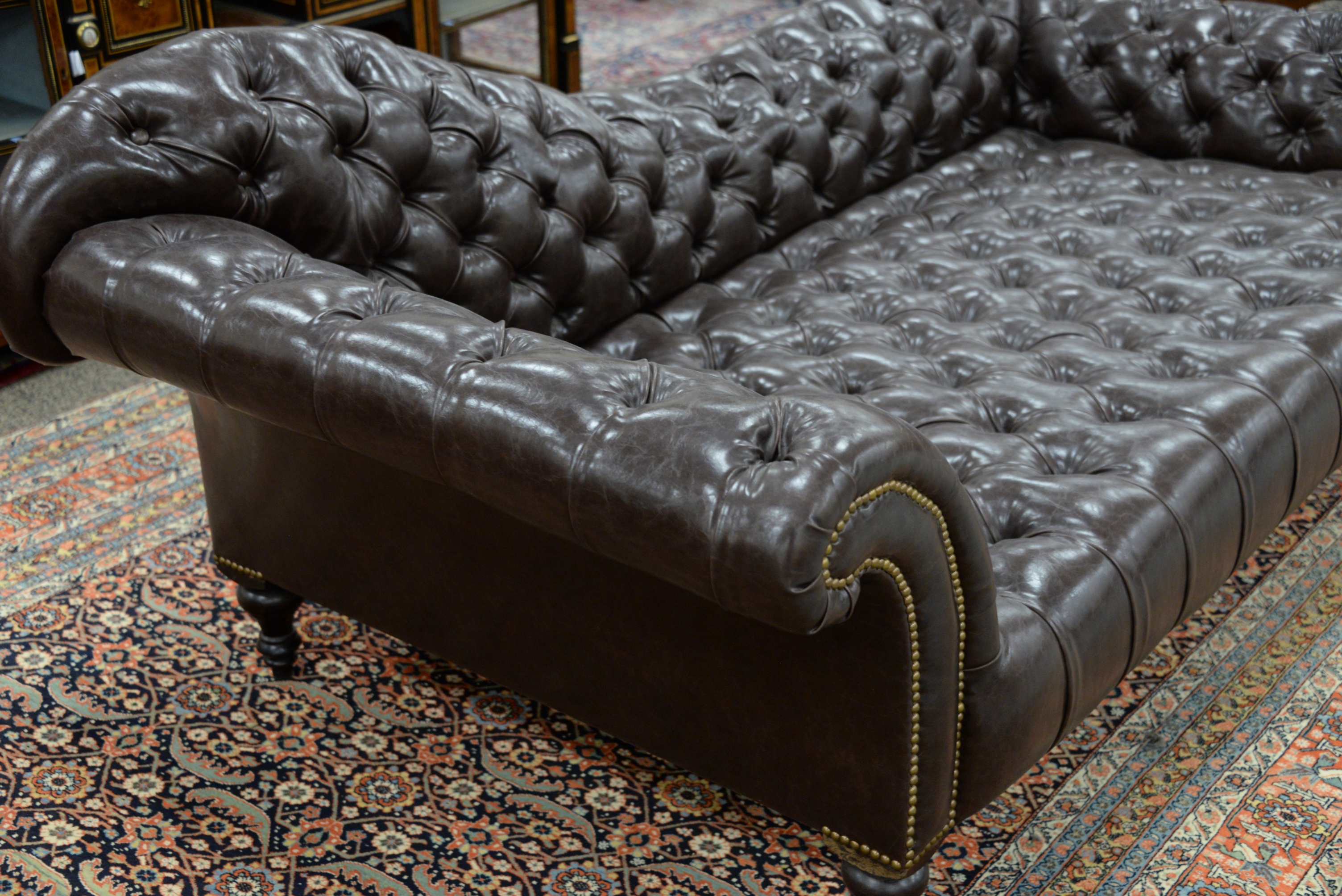 George Smith Brown Leather Recamier, “Dog Kennel Bed”, buttoned, height 33 inches (at highest point), length 90 inches, depth 41 inches, retail $20,400.