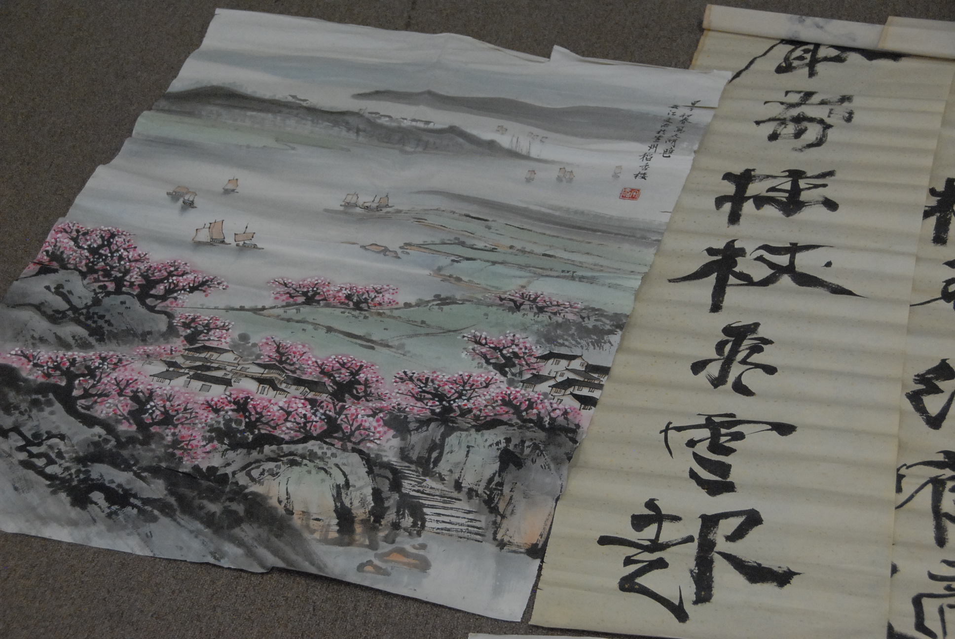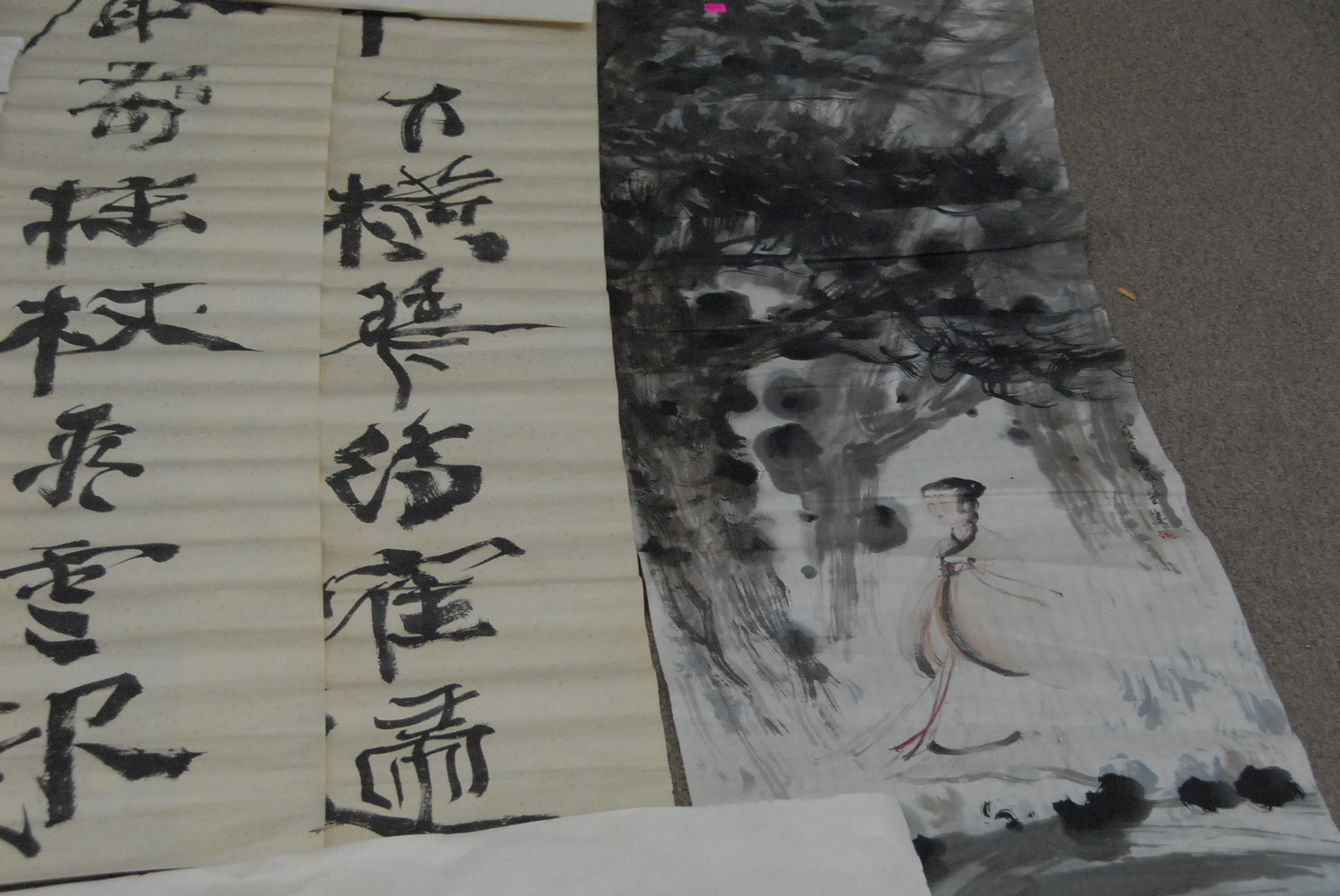 Group of five tissue paper watercolors to include a landscape with path 42 x 28, landscape with lake 42 x 28, Guanyin figure 56 x 18, and two with characters 51 x 13.