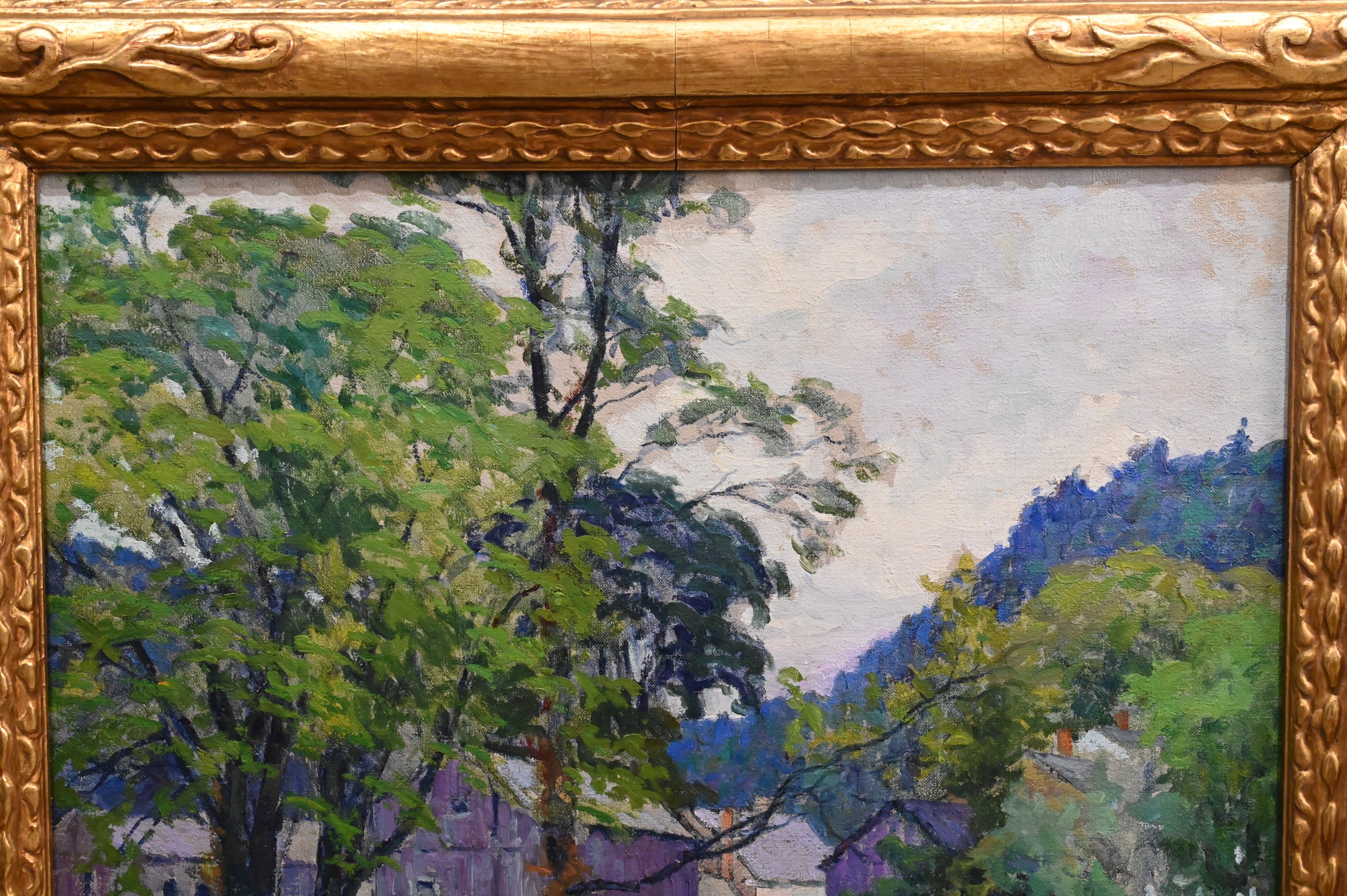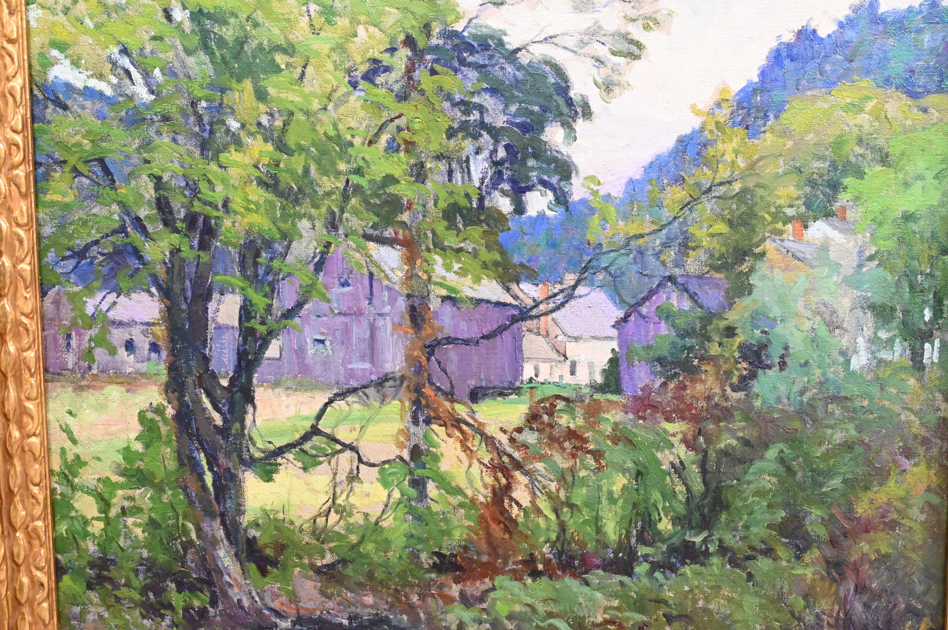 A quintessential New England landscape depicting a quiet stream bordered by trees and village buildings beyond. The composition is unified by rich atmospheric blue hues that permeate the water, shadows, and distant hill, lending depth and a cool tonal harmony to the scene. Subtle greens and earth tones balance the palette, while textured paint application captures shifting light and air.
