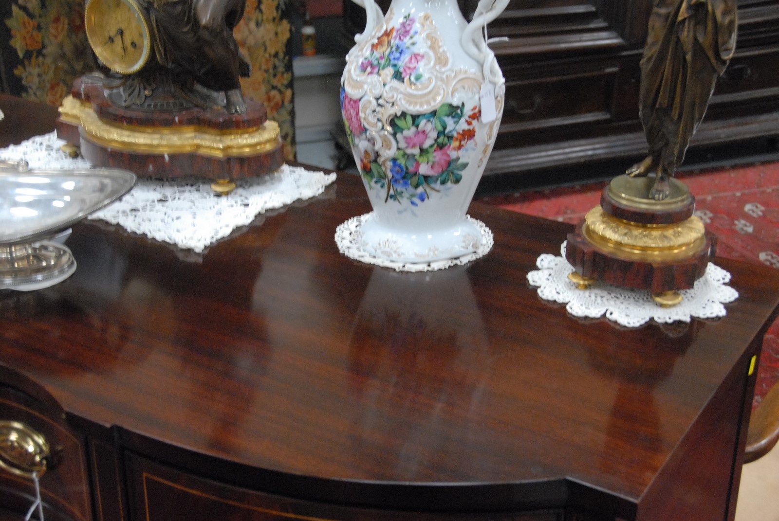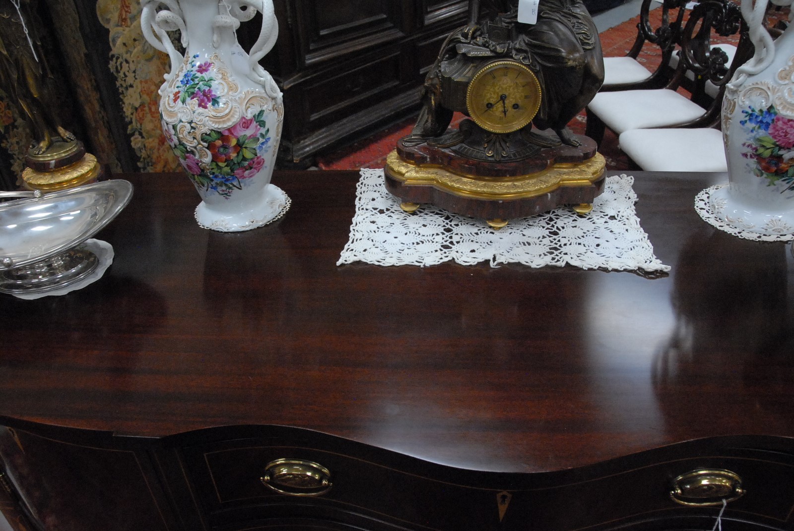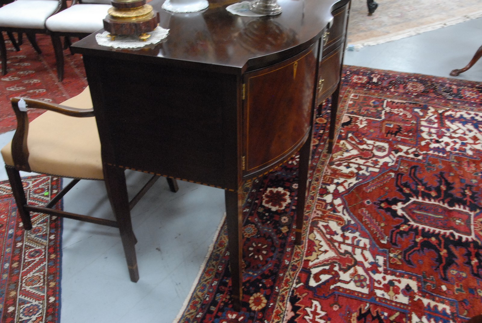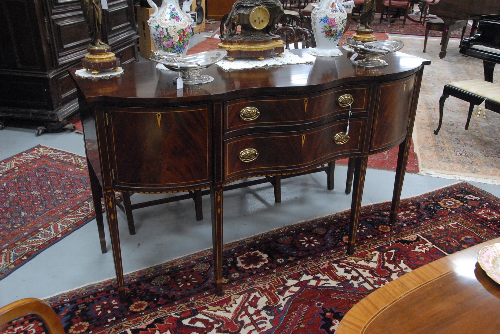 Lot 257: Henkel Harris Federal style mahogany sideboard having serpentine top over conforming case with two center drawers flanked by two doors all set on square tapered legs. ht. 38 1/2in., wd. 64 1/4in., dp. 18 in.