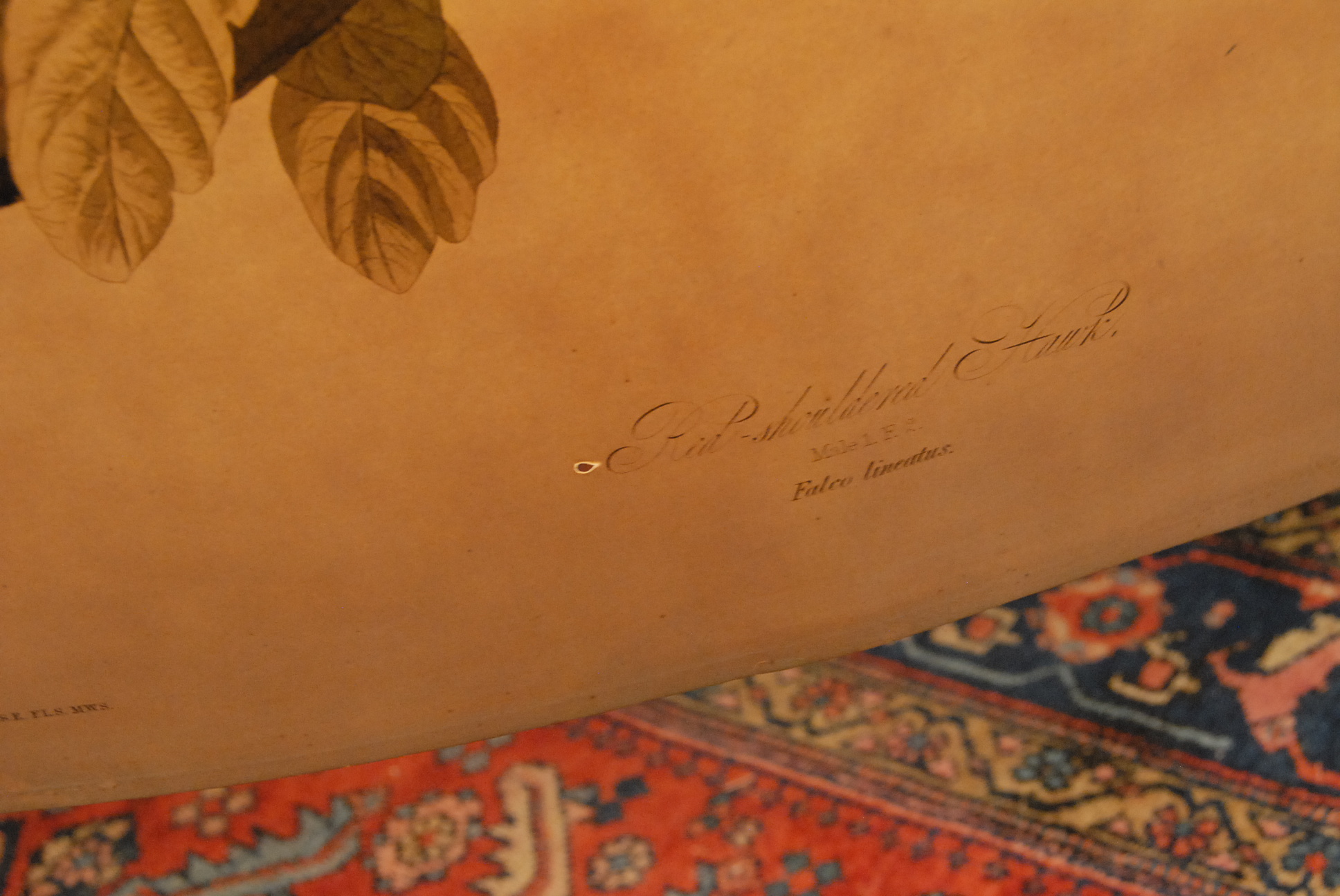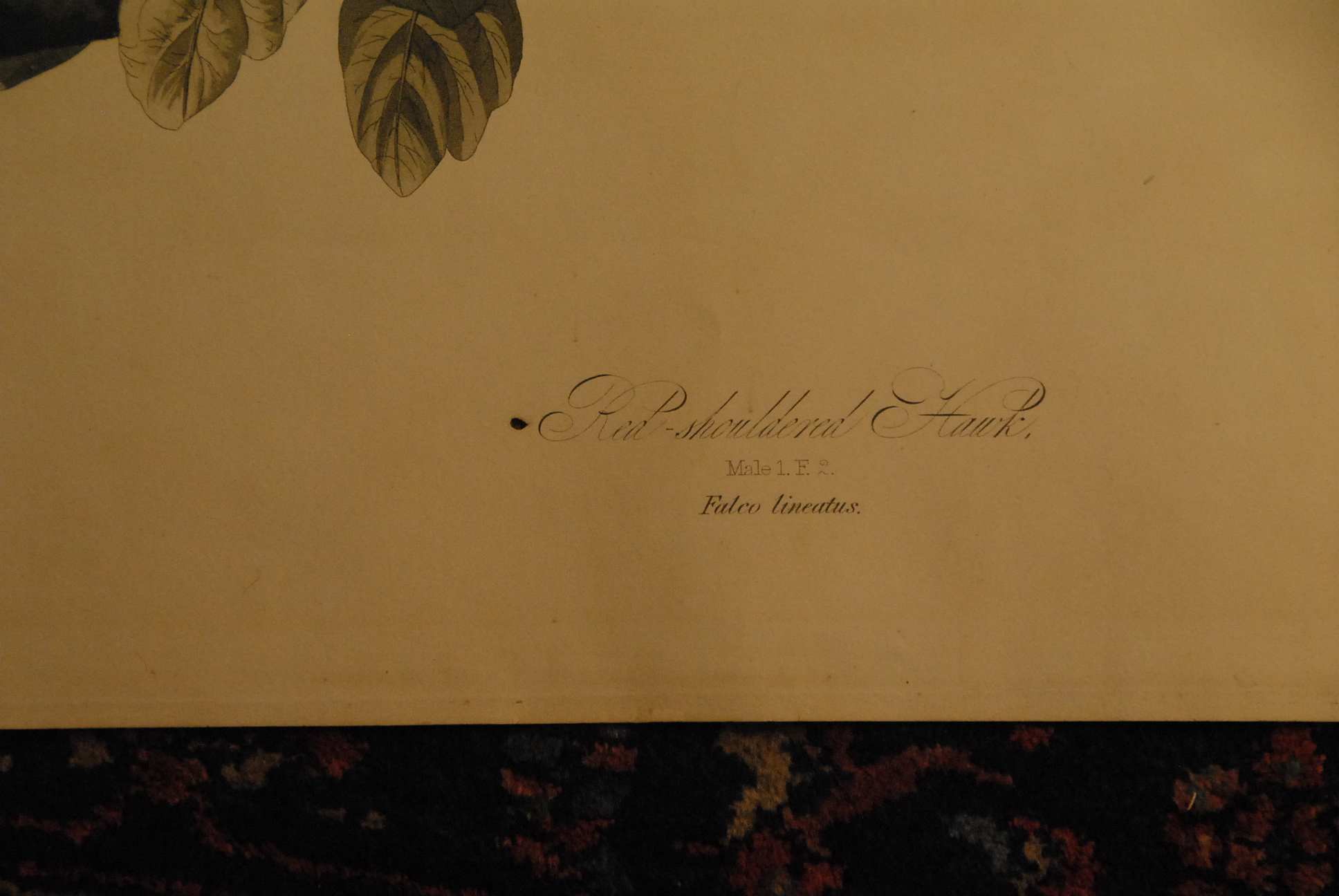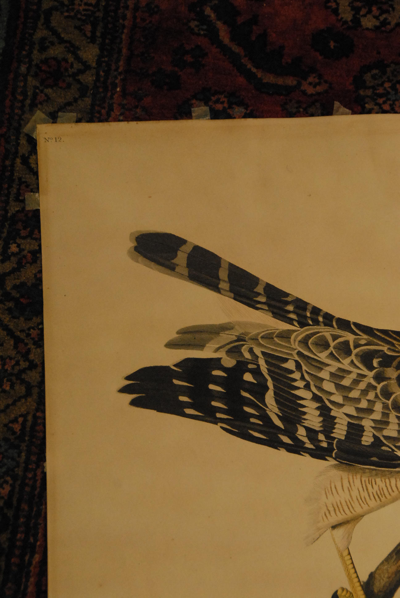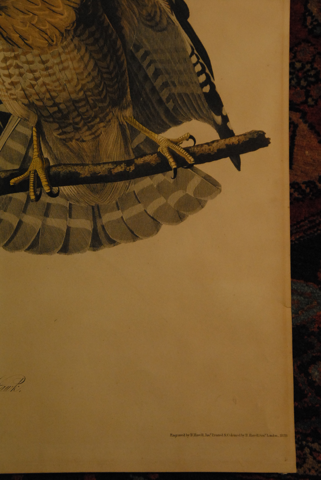 John James Audubon 1785-1851 RED SHOULDERED HAWK Male 1 F2 Falco Lineatus hand colored engraving marked lower left: Drawn from nature and published by John J. Audubon F.R.S.E. F.L.S. M.W.S. marked lower right: Engraved by R. Havell Jun, printed and coloured by R. Havell Sep London 1829 J. Whatman Turkey Mill watermark Kennedy Gallery New York label on verso #46961 tear repair top left of center, very small hole near title, tear right side see detailed photos 38 x 25 3/16