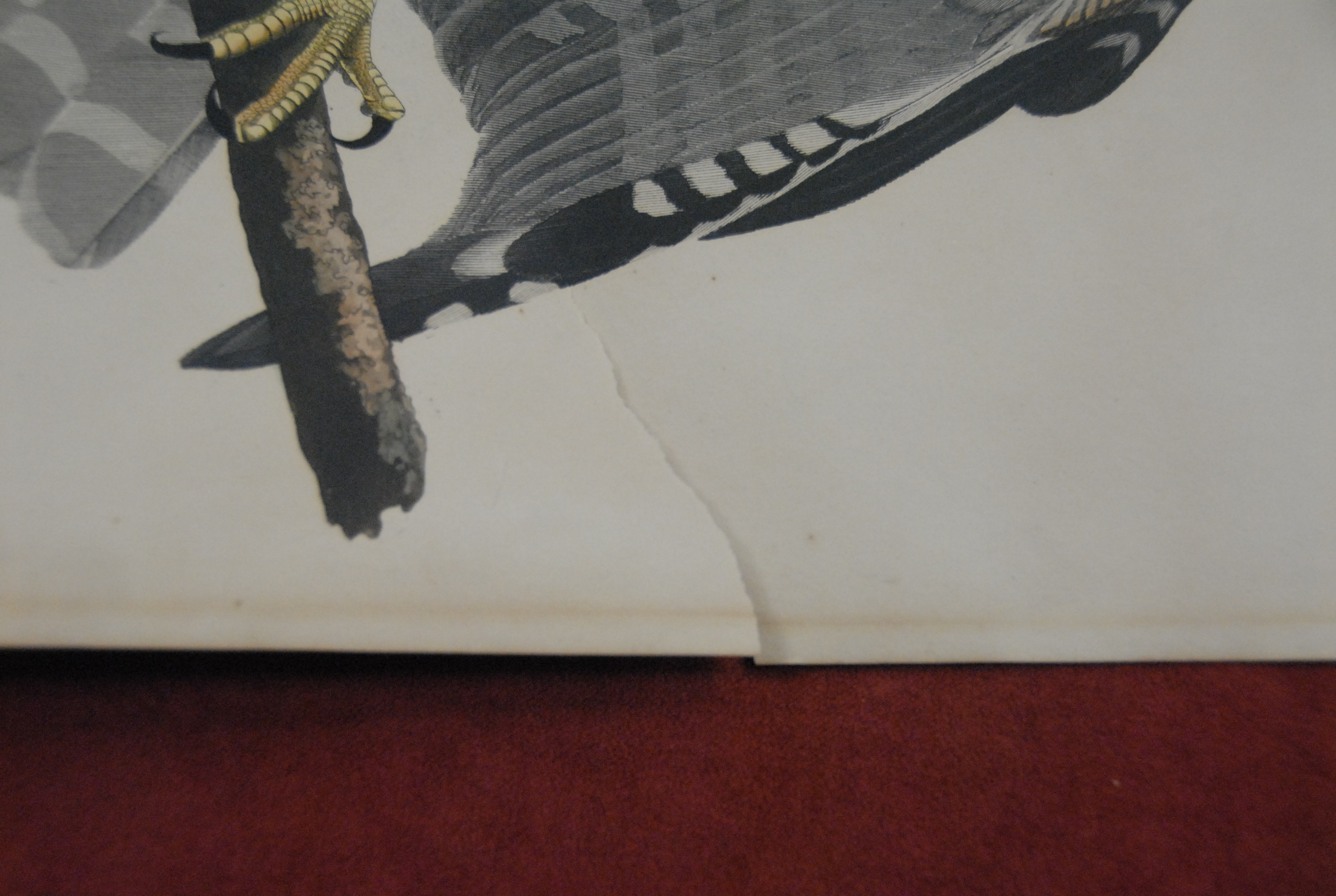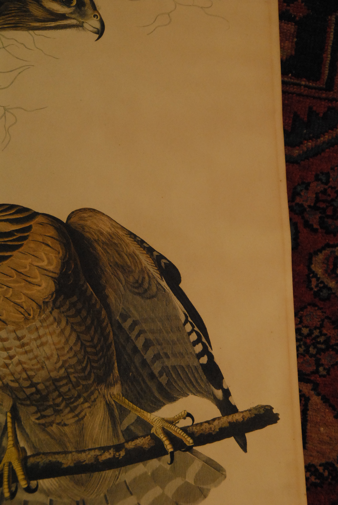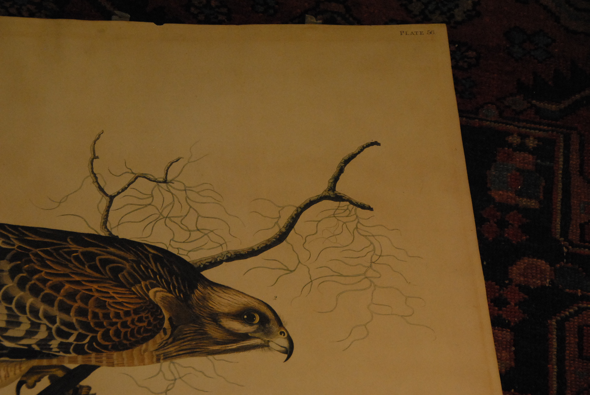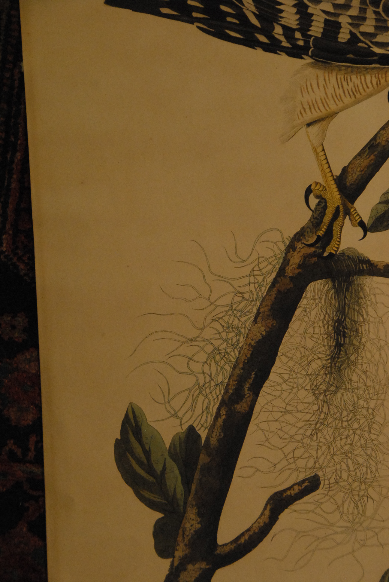 John James Audubon 1785-1851 RED SHOULDERED HAWK Male 1 F2 Falco Lineatus hand colored engraving marked lower left: Drawn from nature and published by John J. Audubon F.R.S.E. F.L.S. M.W.S. marked lower right: Engraved by R. Havell Jun, printed and coloured by R. Havell Sep London 1829 J. Whatman Turkey Mill watermark Kennedy Gallery New York label on verso #46961 tear repair top left of center, very small hole near title, tear right side see detailed photos 38 x 25 3/16