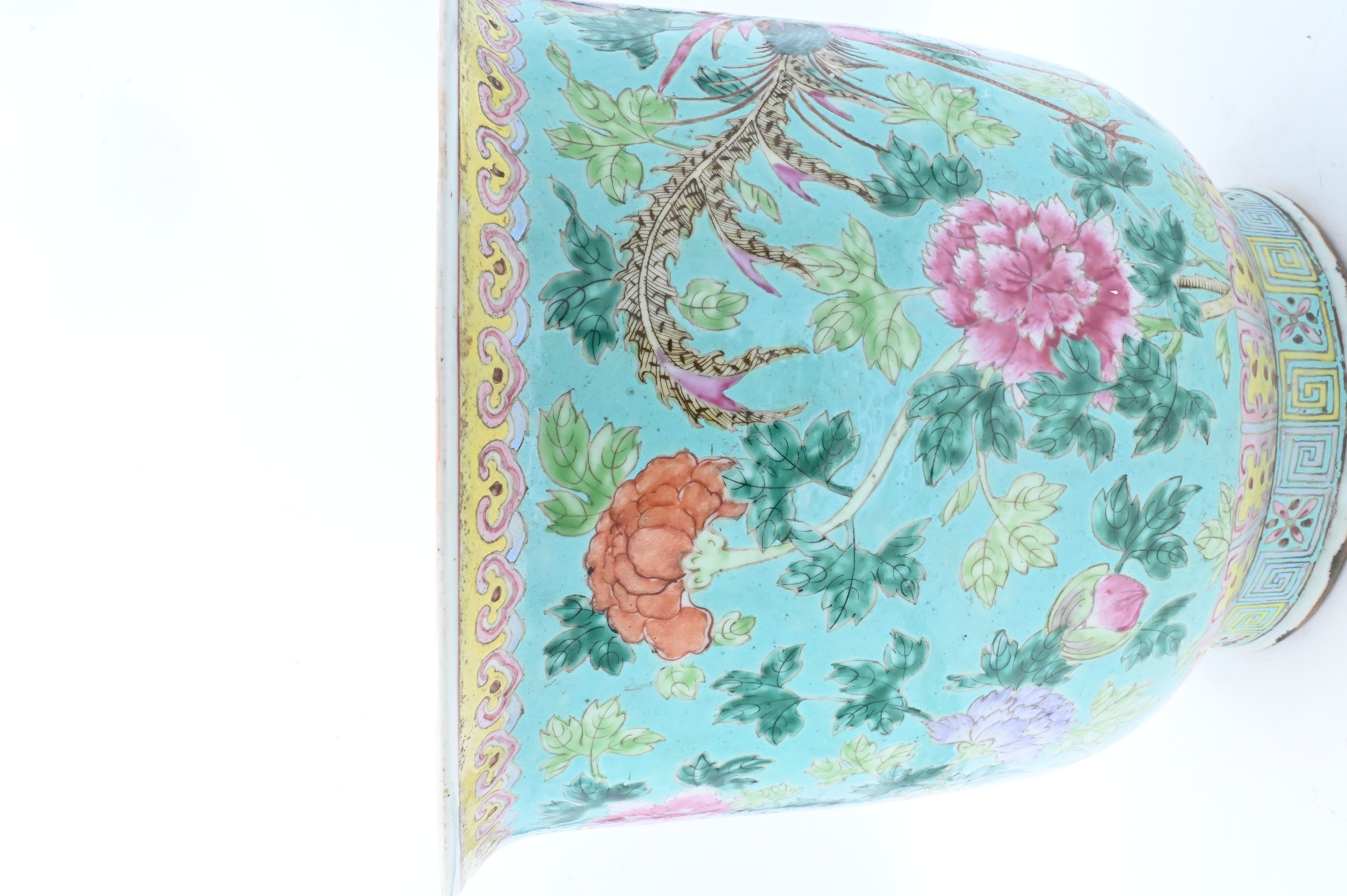 to include one teal or turquoise blue ground with chrysanthemum and ho-ho bird motif,