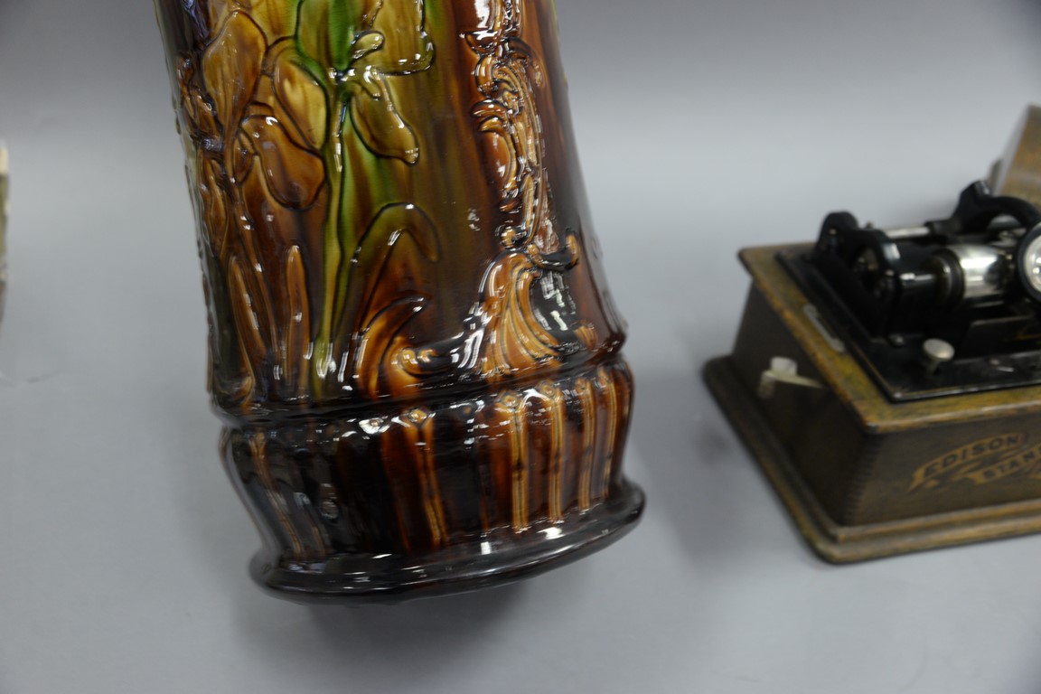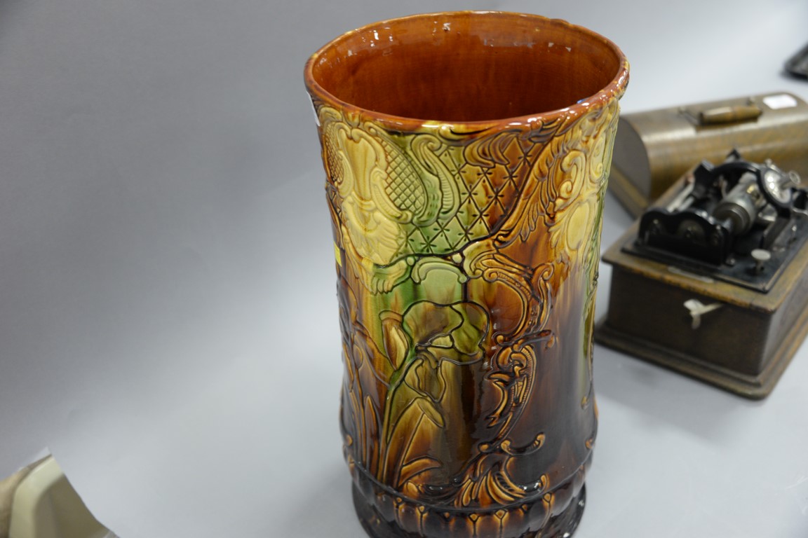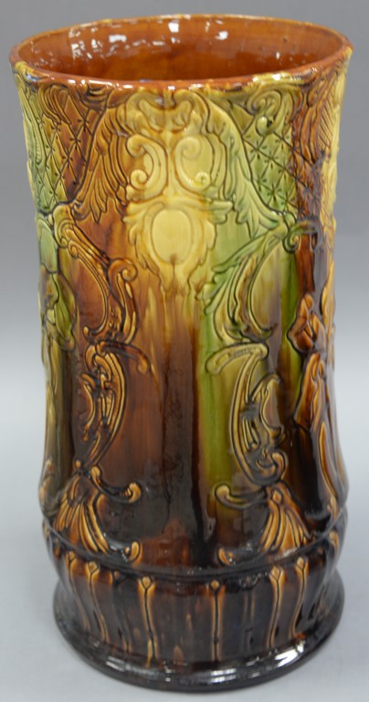 Majolica umbrella stand, green brown glazed with embossed flower design.
