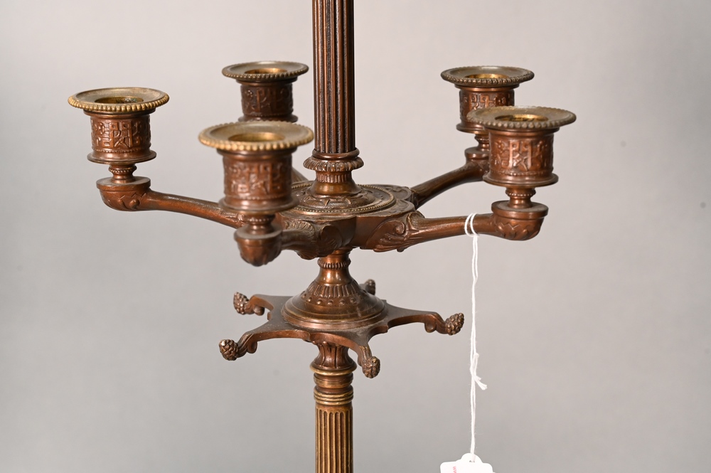 Pair of Napoleon Patinated Bronze Candelabras, having oil form central front with five candlestick arms, on tall standard on paw-footed tripartite bases, crane standing on turtle finials, missing candle holder, height 47 inches.