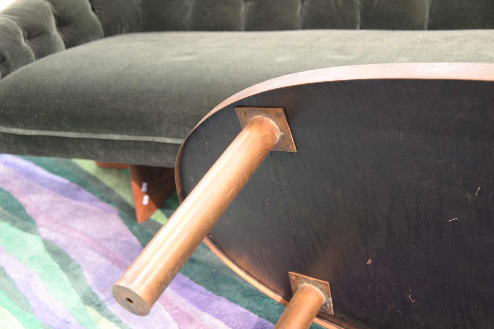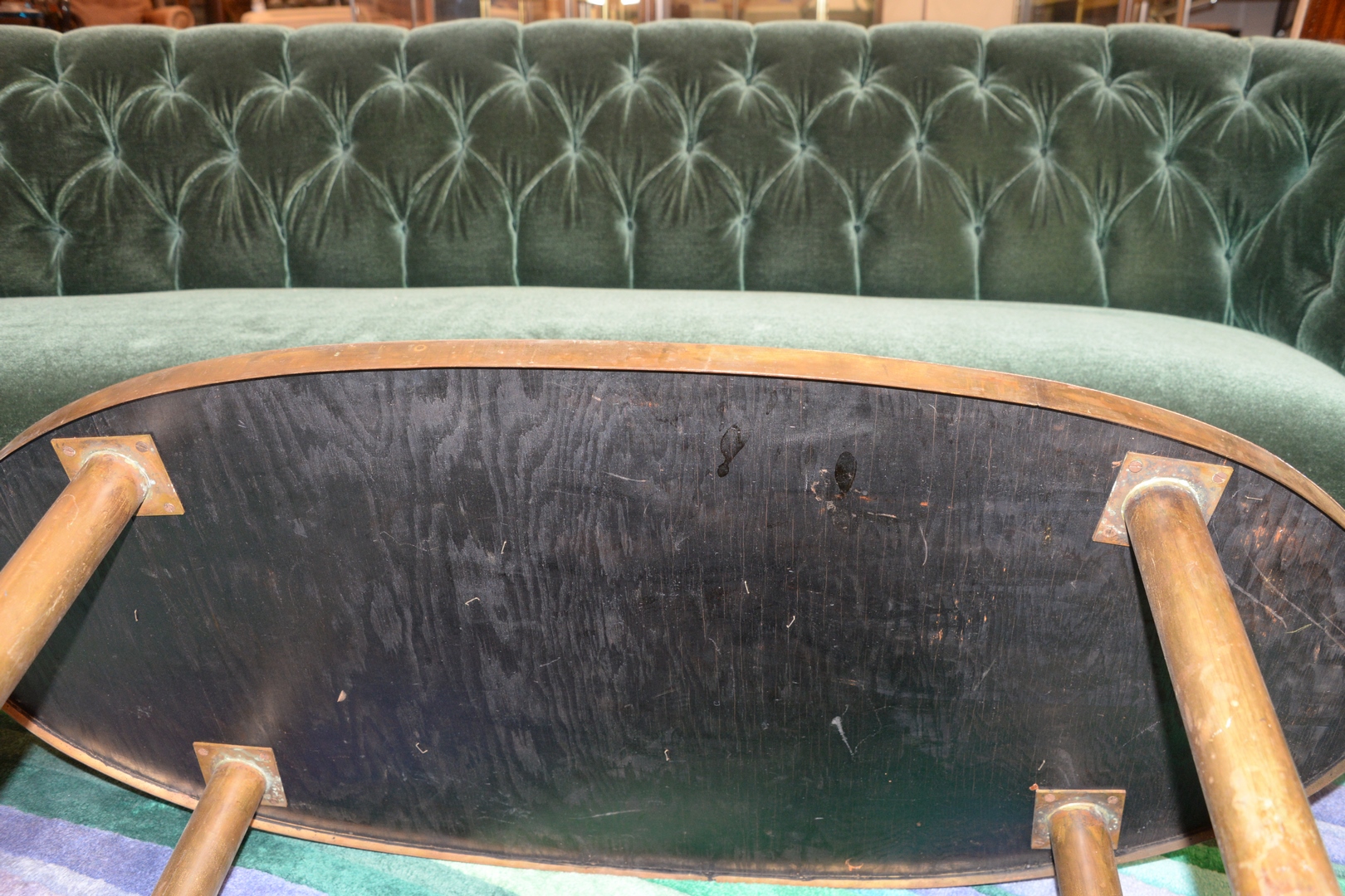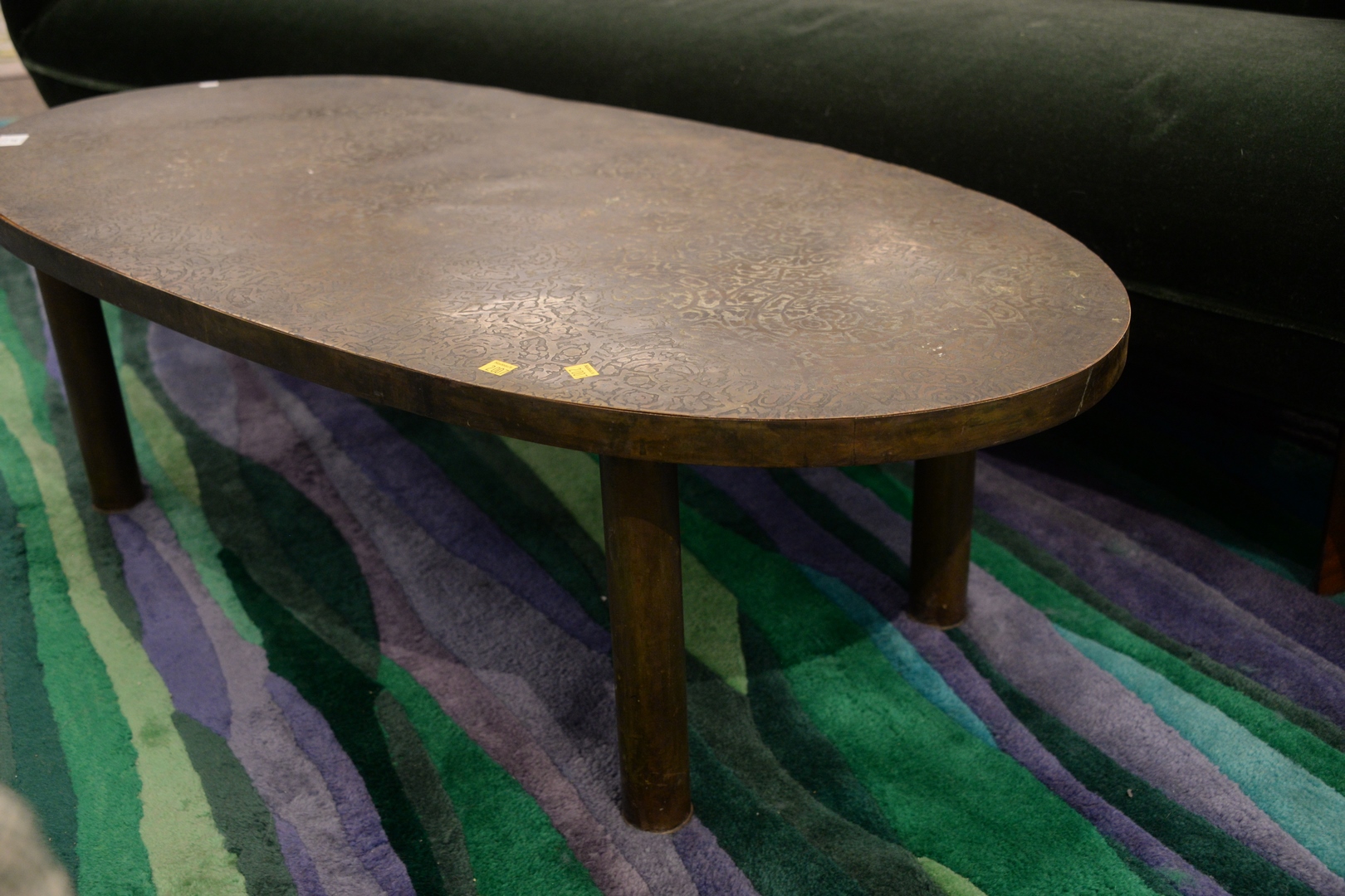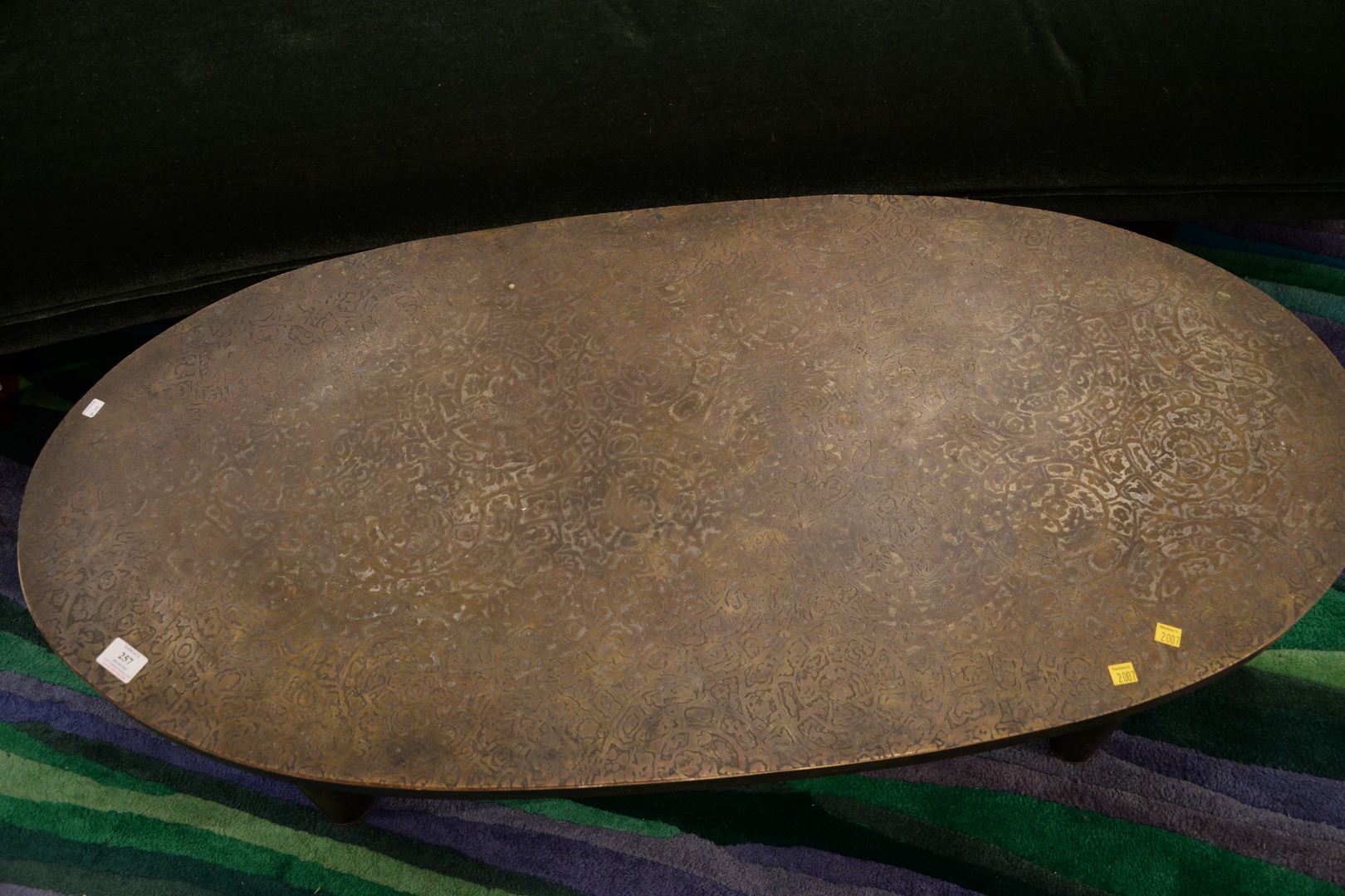 Lot 257: Philip and Kelvin Laverne, Etruscan oval coffee table, acid etched brass and patinated, height 14 inches, length 48 inches, width 23 1/2 inches.