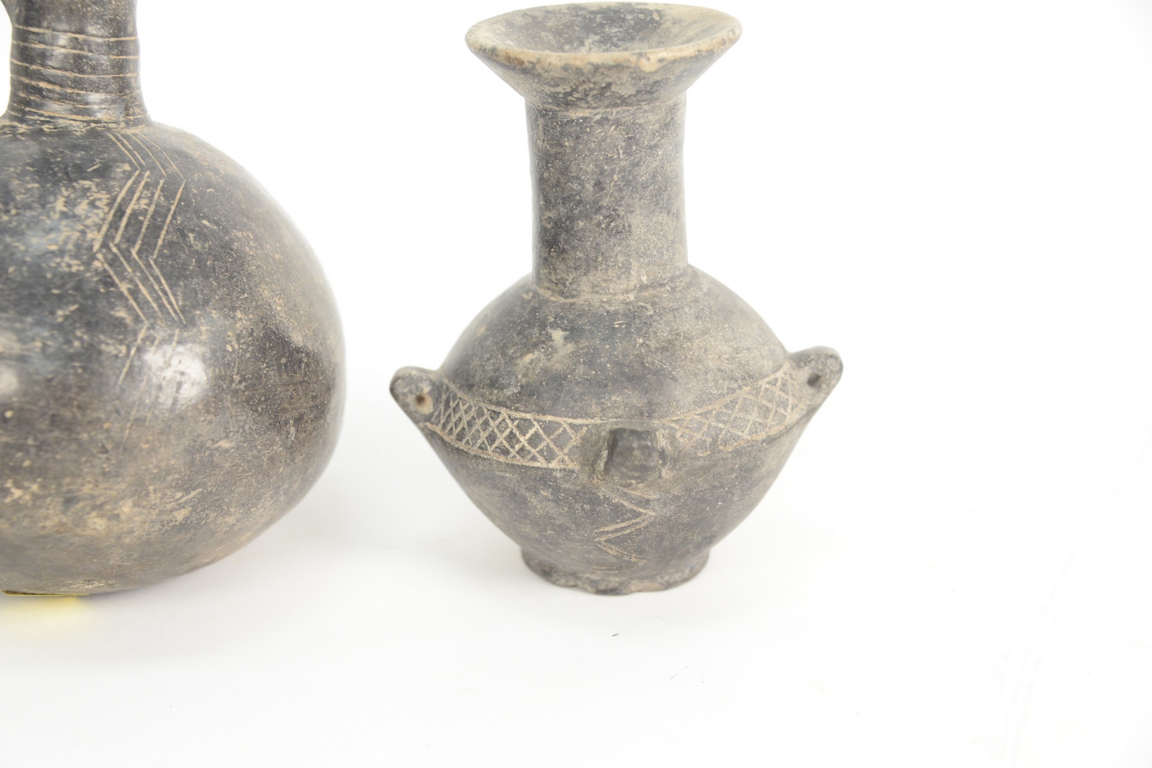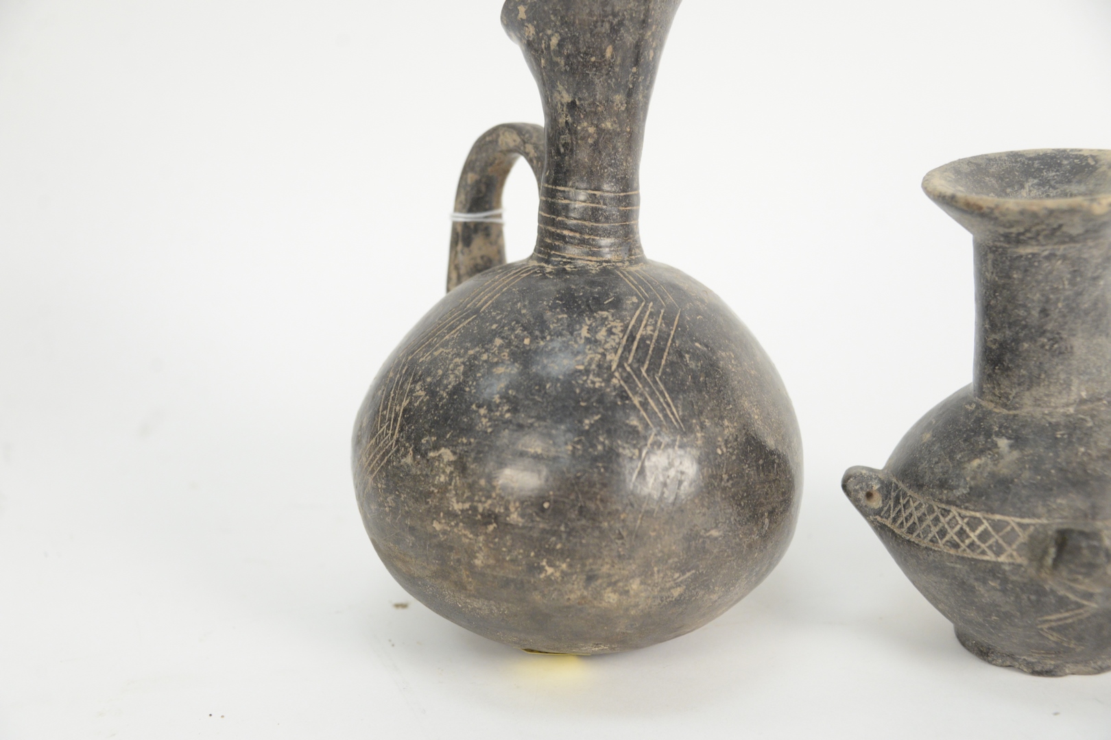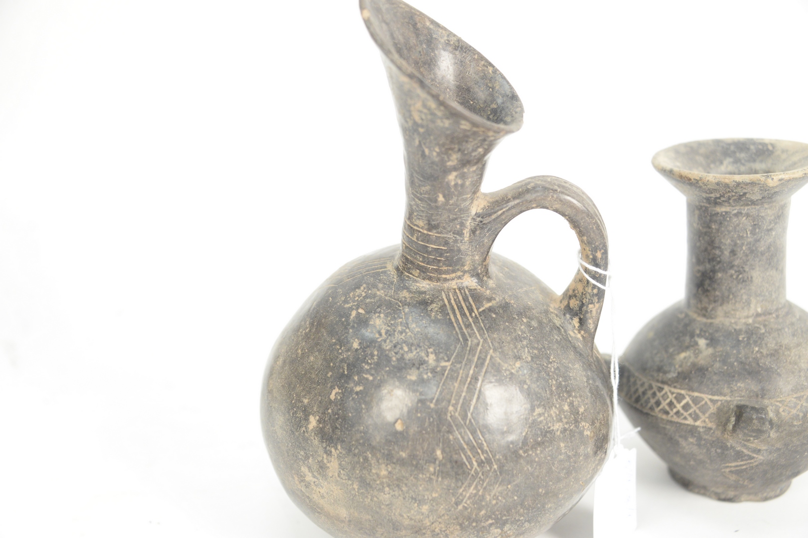 Two Ancient Pottery Vessels, to include grey terracotta jug with globular shape, flared rim and handle, height 5 3/4 inches along with vase form with incised sides, flared rim, height 8 1/4 inches. Provenance: Part of Ariadne Galleries, New York, receipt from May 31, 1991 collection.