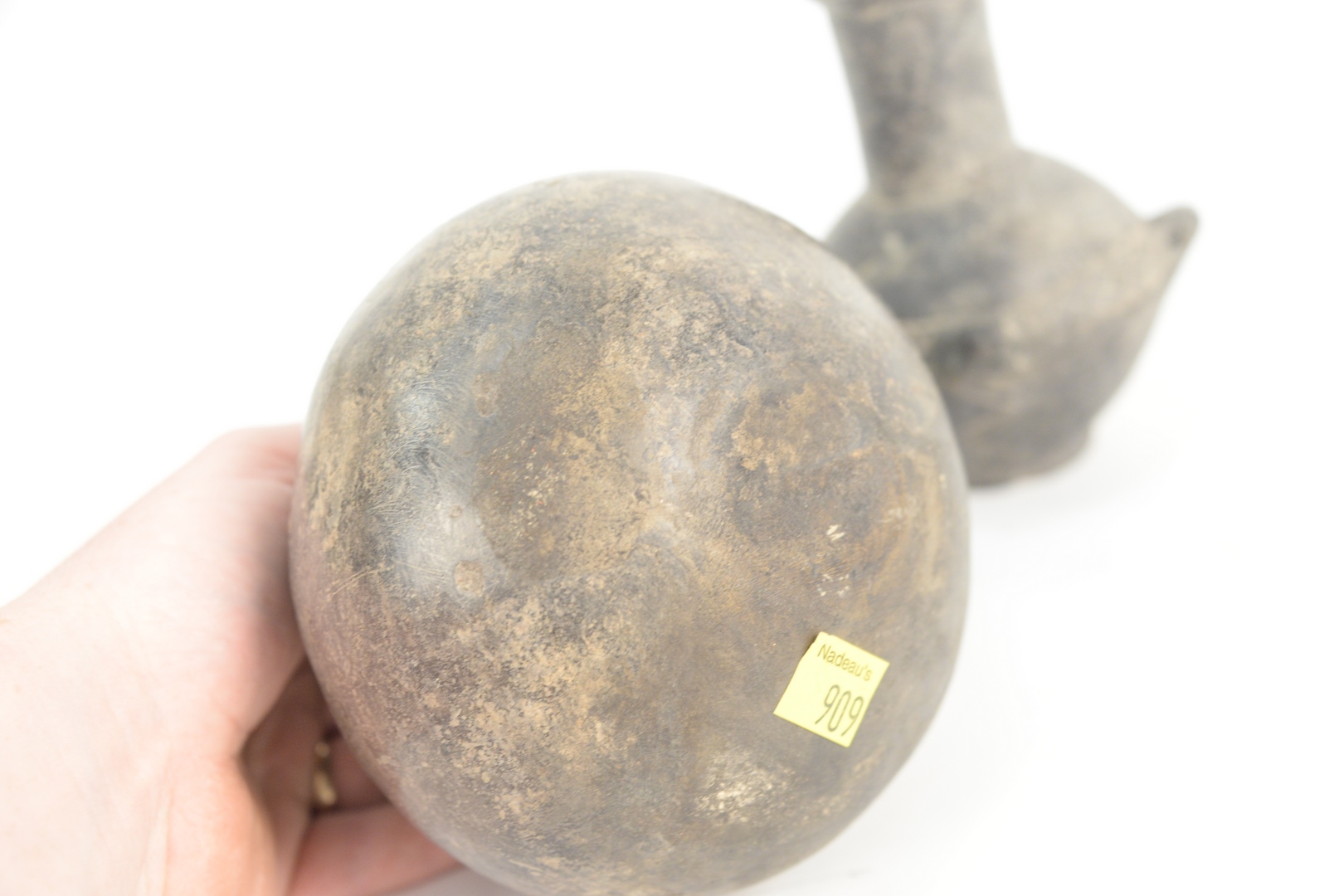 Lot 257: Two Ancient Pottery Vessels, to include grey terracotta jug with globular shape, flared rim and handle, height 5 3/4 inches along with vase form with incised sides, flared rim, height 8 1/4 inches. Provenance: Part of Ariadne Galleries, New York, re
