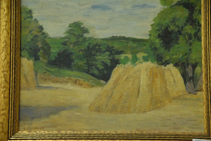 Two piece lot to include a pencil sketch marked lower right Evedder Aboo Foddah, March 29th 1890 6 1/4 x 7 1/2 and an oil on board of haystack signed lower right W. Chadwick 14 x 16.