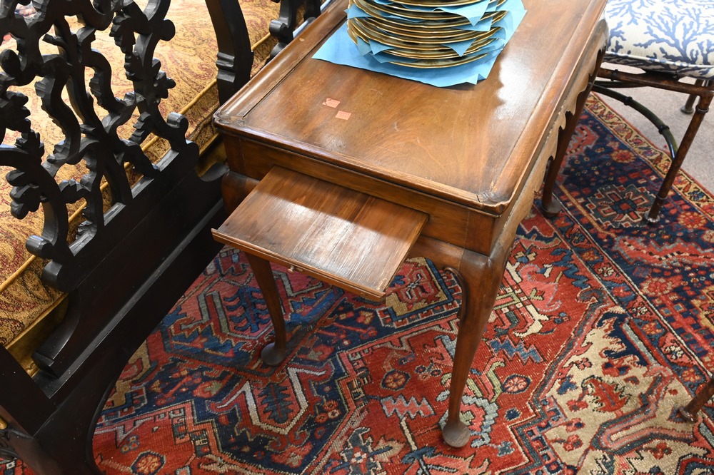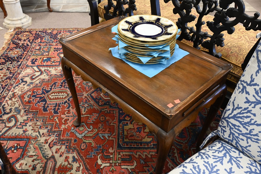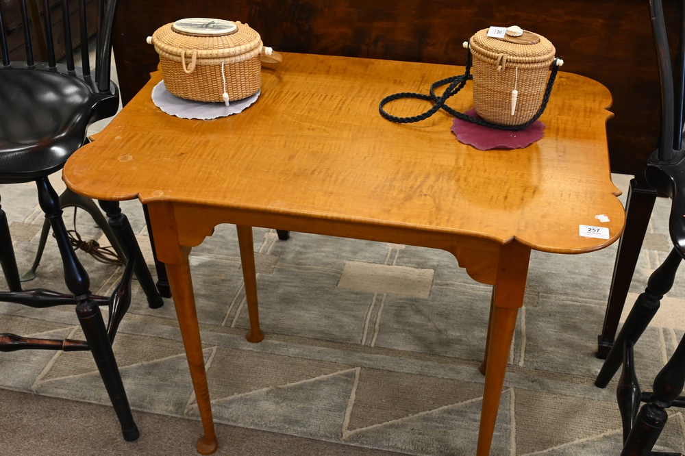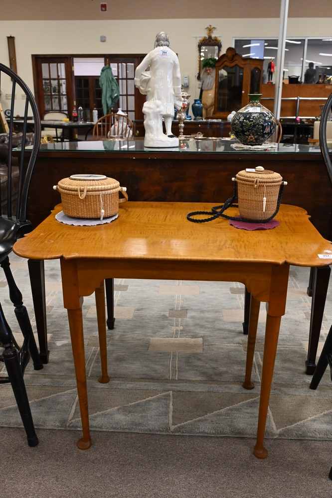 Lot 257: Two Piece Lot to include, Eldred Wheeler Tiger Maple Queen Anne Style Tea Table, having shaped top, height 27 inches, top 22 x 32 1/2 inches; along with a Kittinger Colonial Williamsburg Queen Anne style tea table (rough finish).