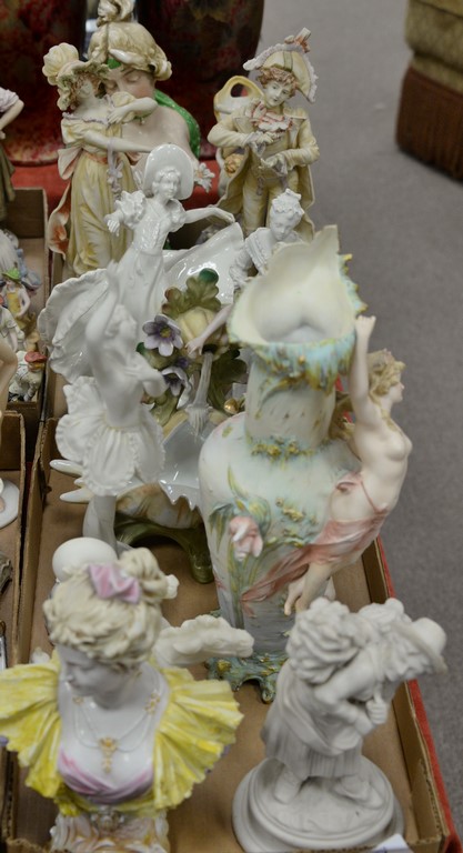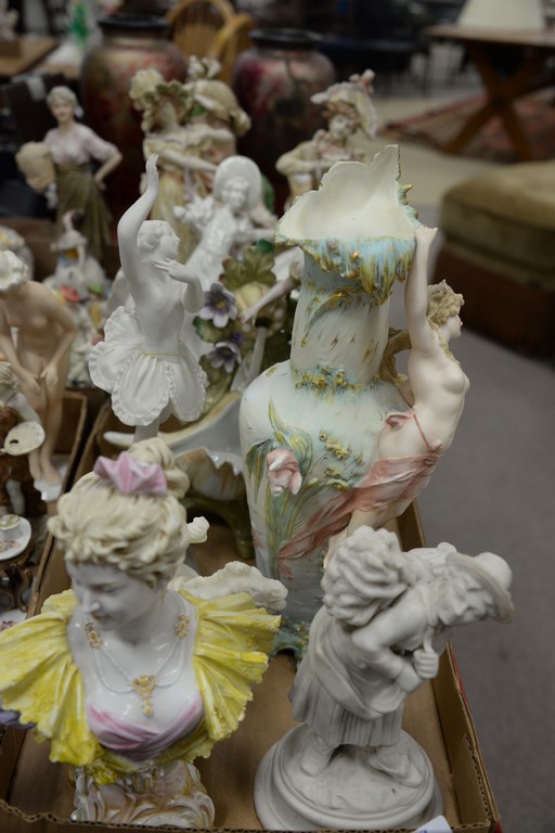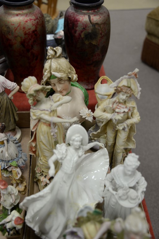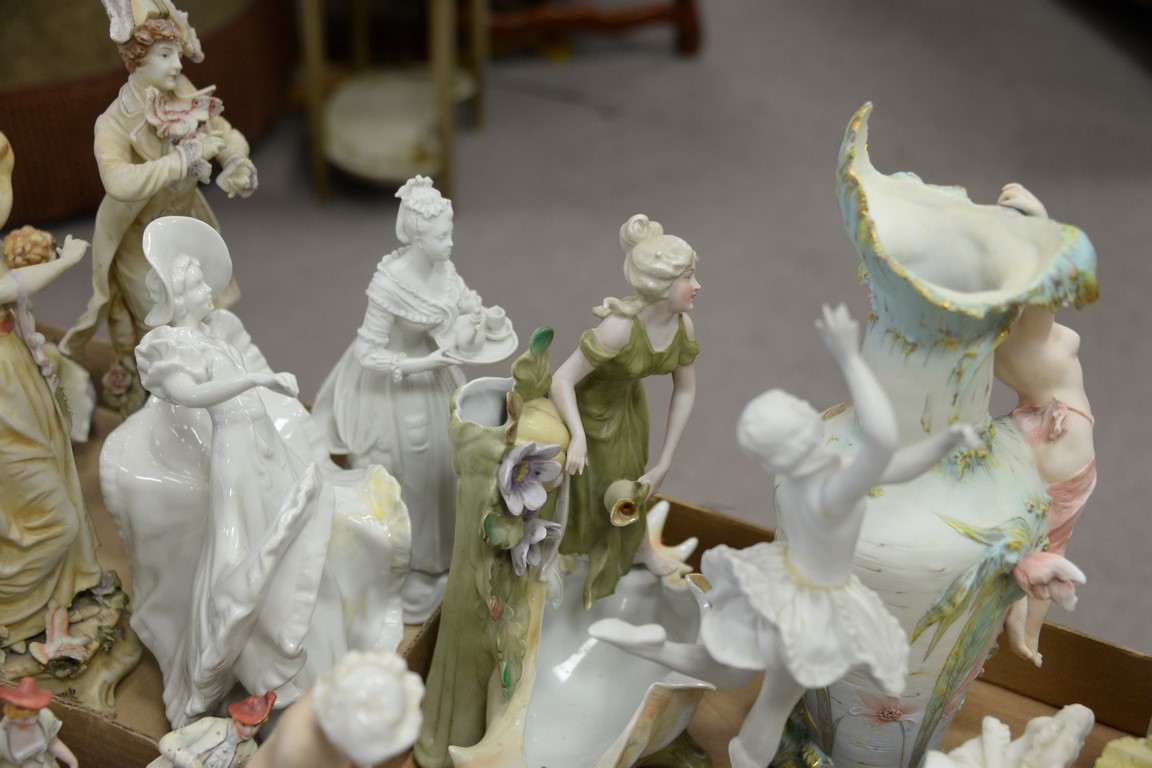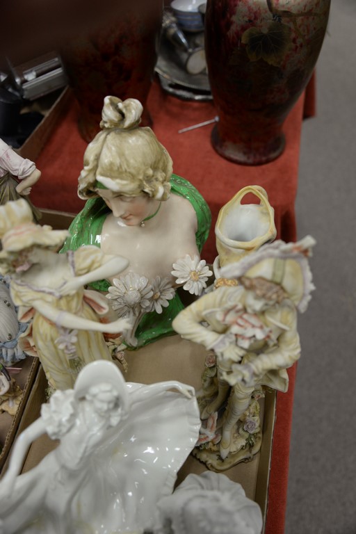 Two tray lots with porcelain and ceramic figures and figural vases.