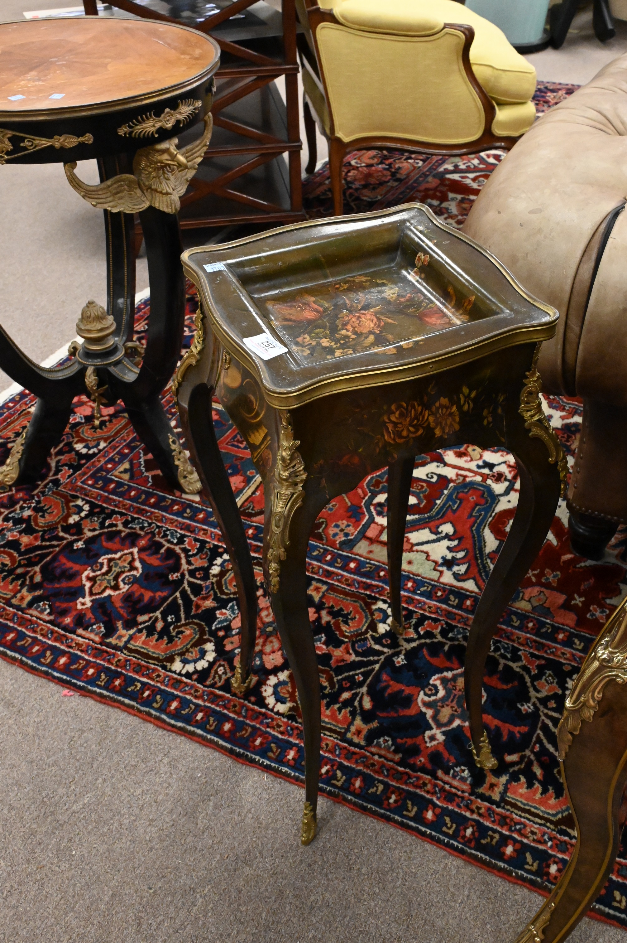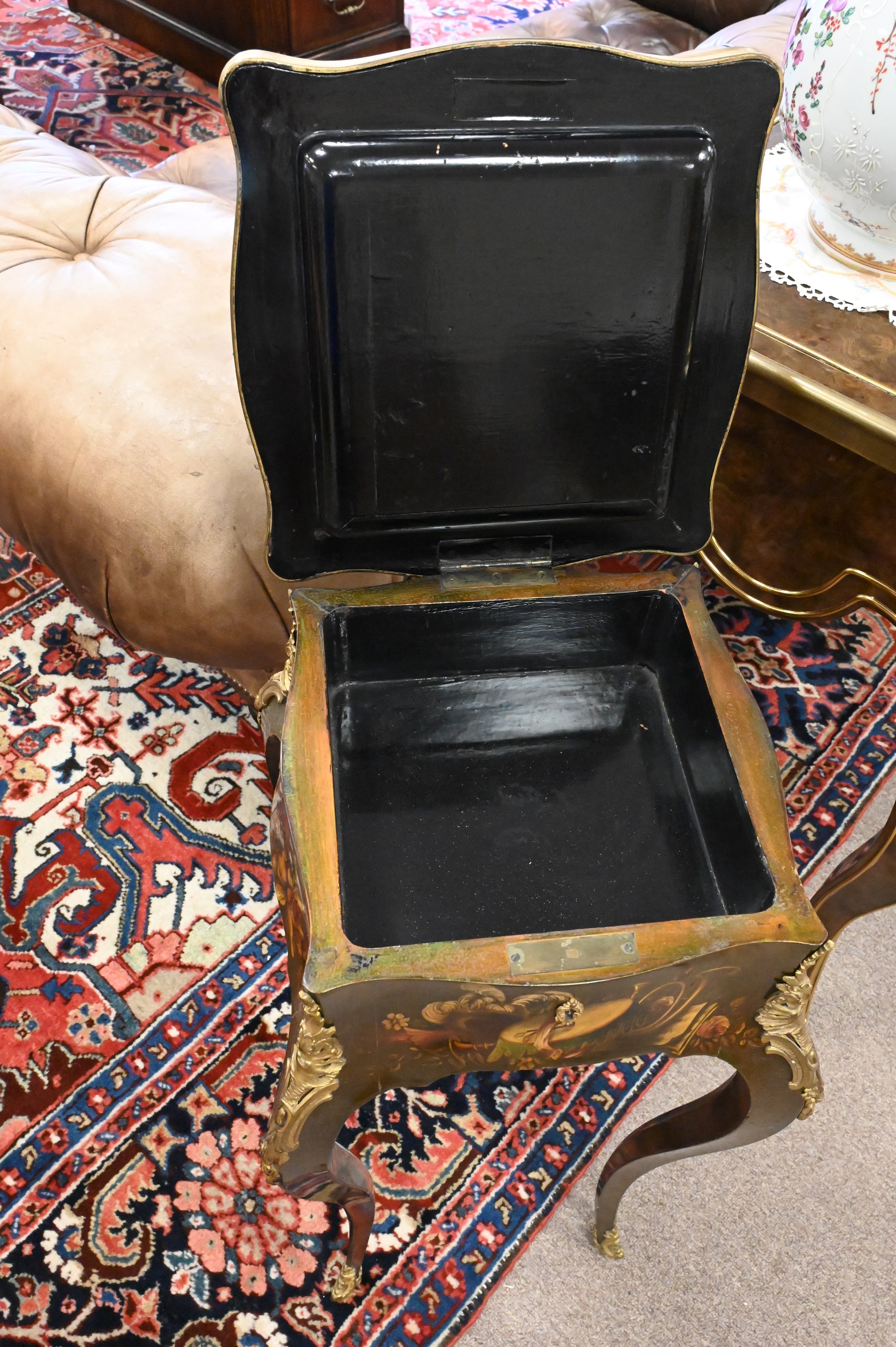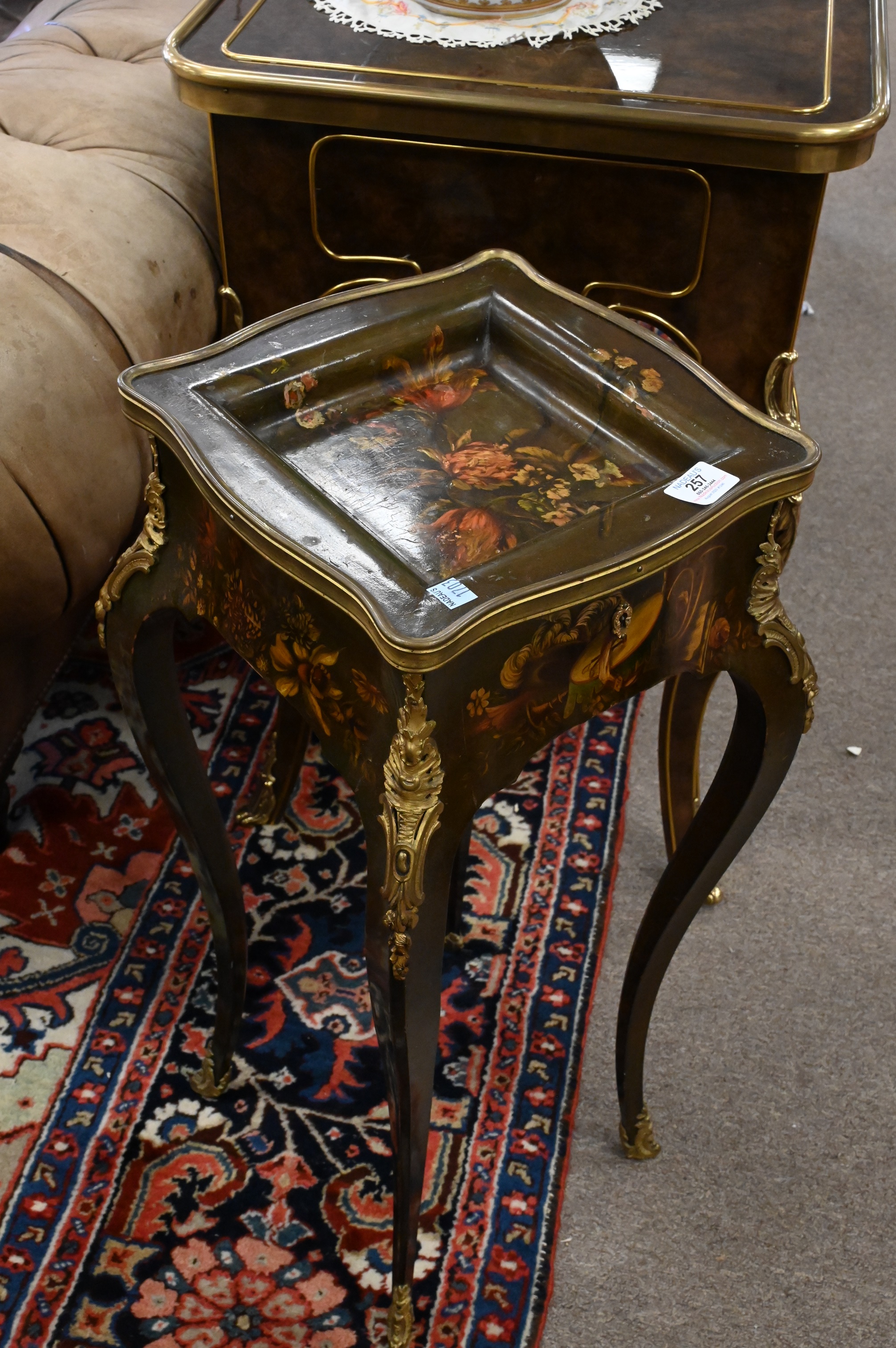Verni Martin Lacquered Tormalu Mounted Stand, having shaped brass bound top over bold cabriole legs, height 29 inches, top 11″ x 12″