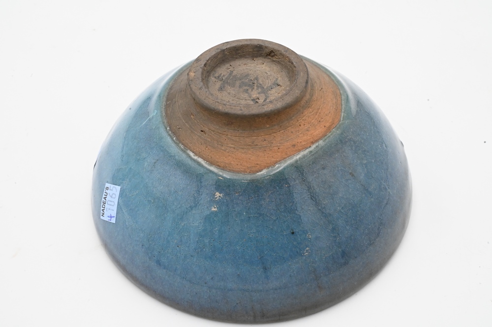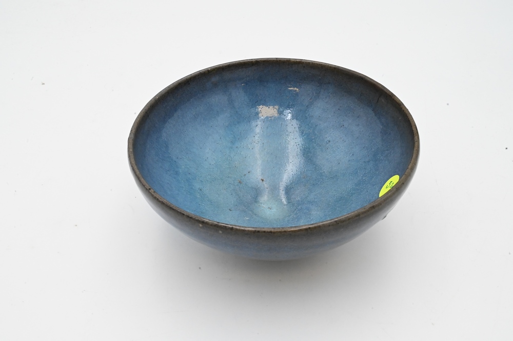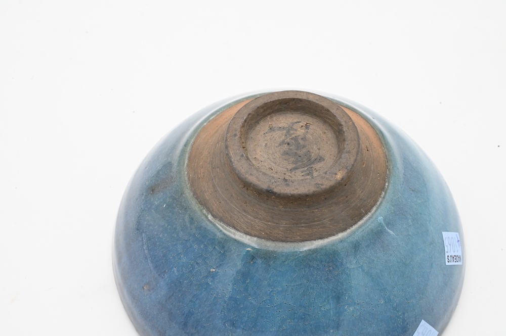 Lot 258: Chinese Ceramic Jun Ware Bowl, having blue glazed ground with purple splash on unglazed footed base, hairline crack to body, height 3 1/2 inches, diameter 7 1/4 inches.