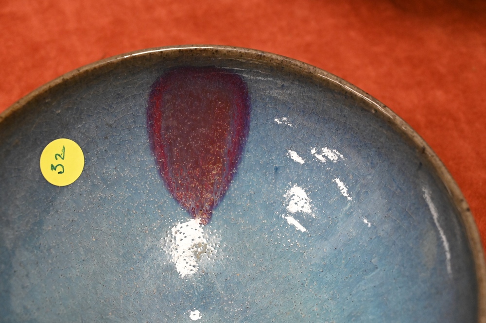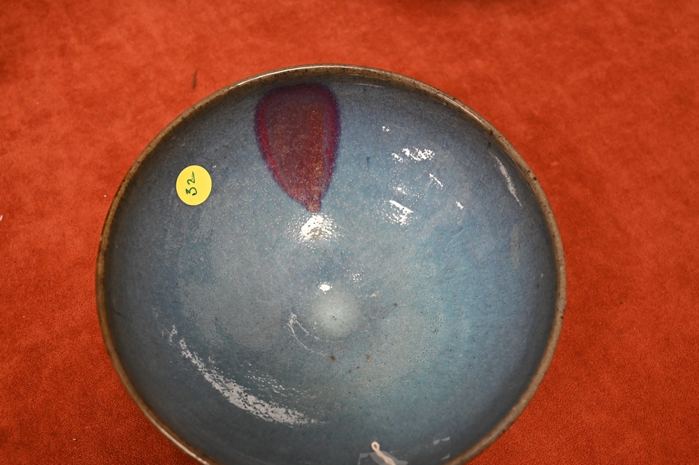 Chinese Ceramic Jun Ware Bowl, having blue glazed ground with purple splash on unglazed footed base, hairline crack to body, height 3 1/2 inches, diameter 7 1/4 inches.