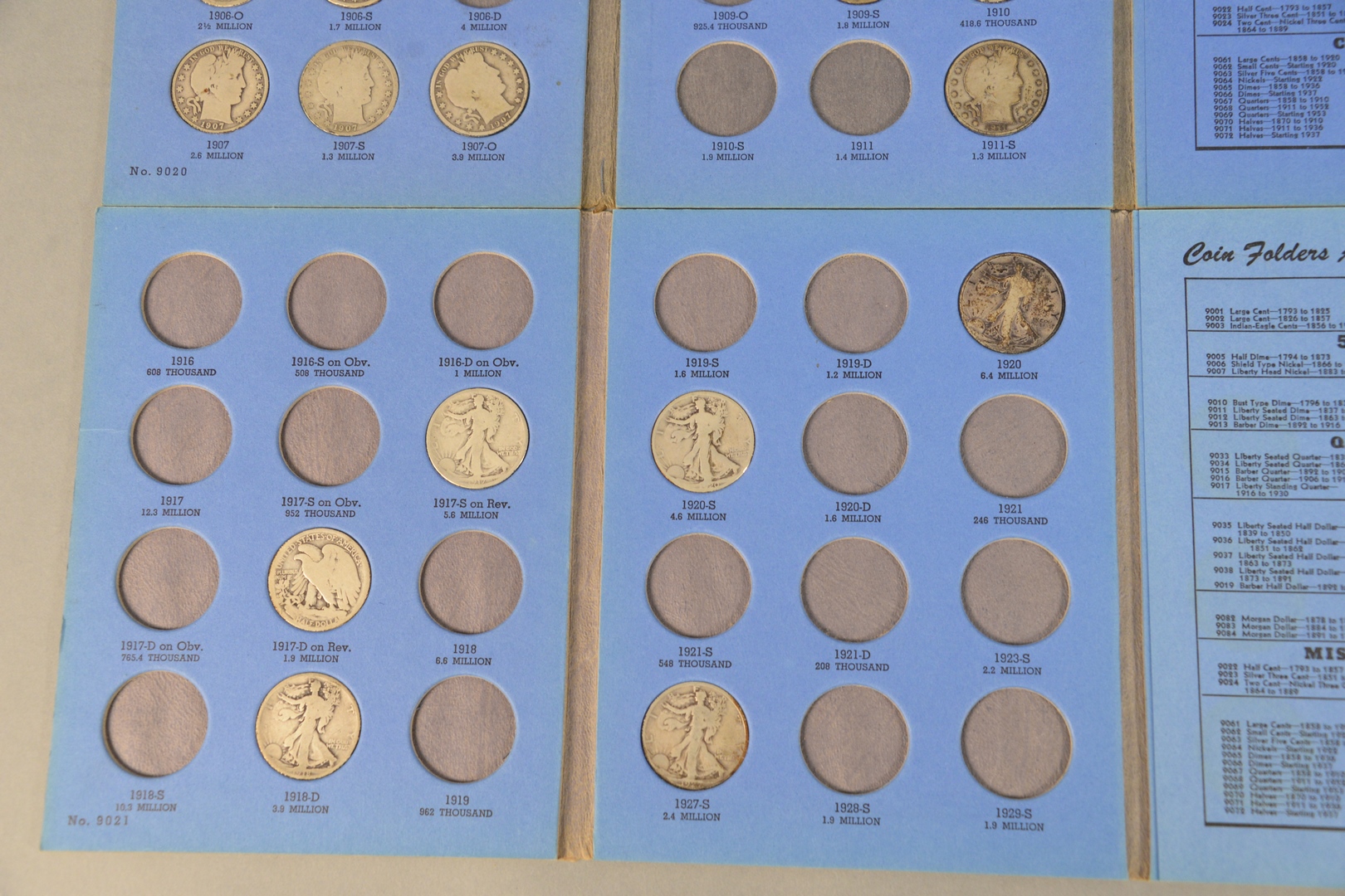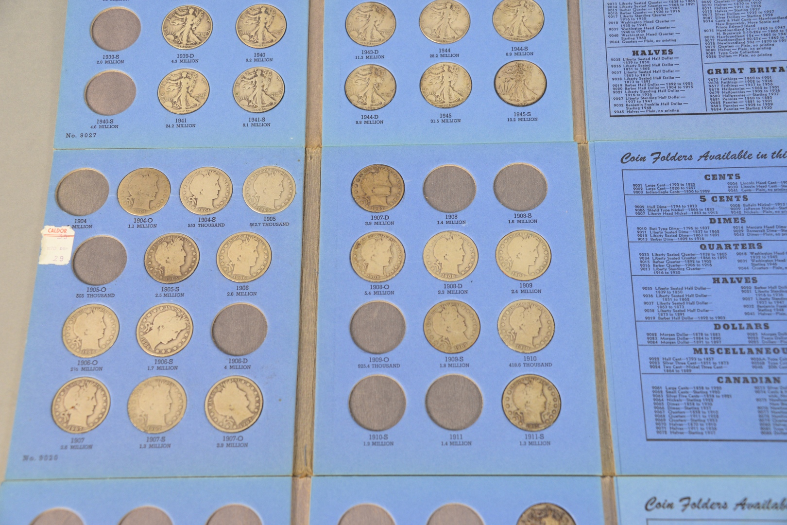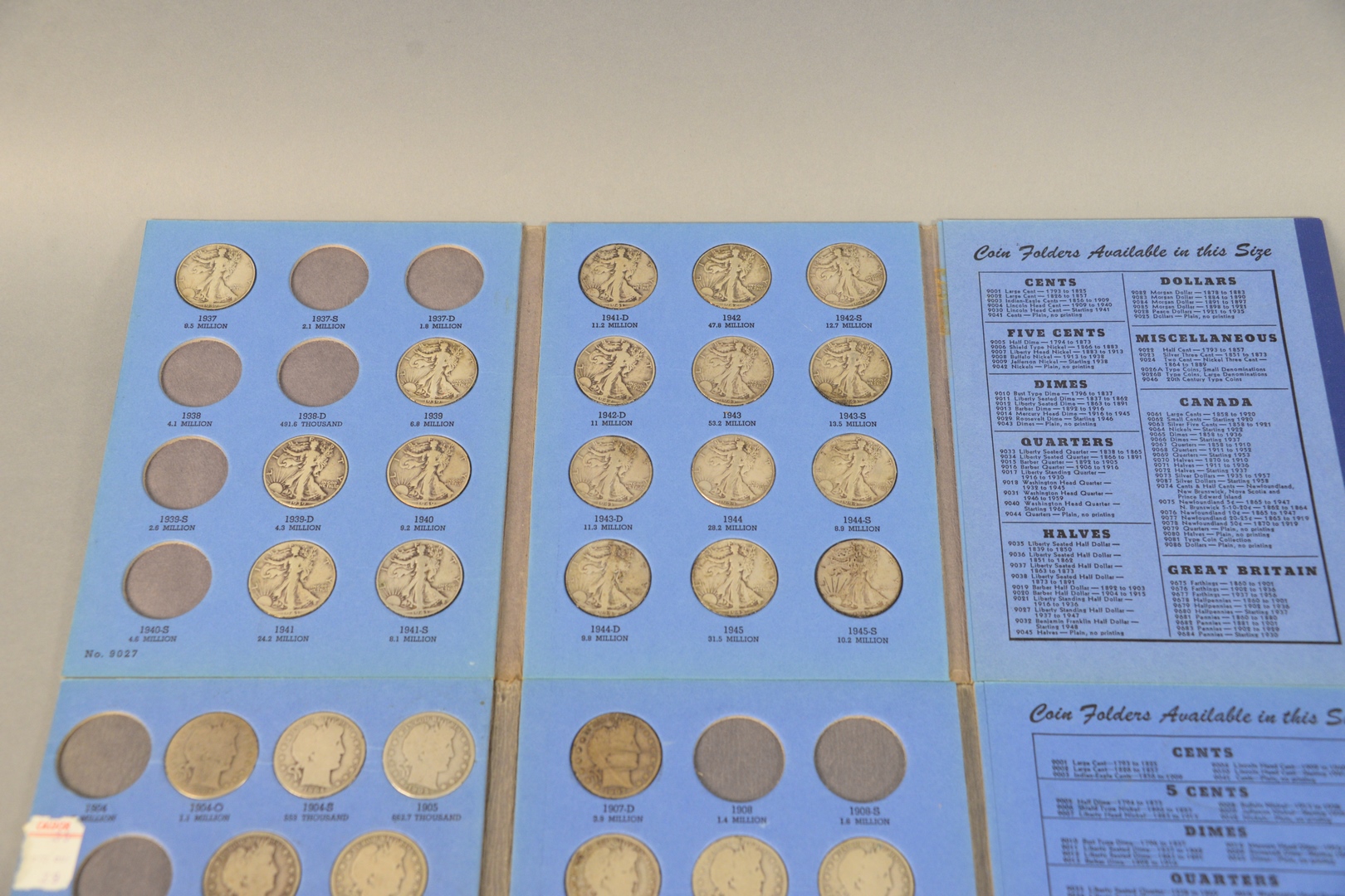 Coin lot to include, 1 partial album, Barber halves, 9.50 face 90%, 2 partial album Walking Liberty half, 16.00 face 90%.