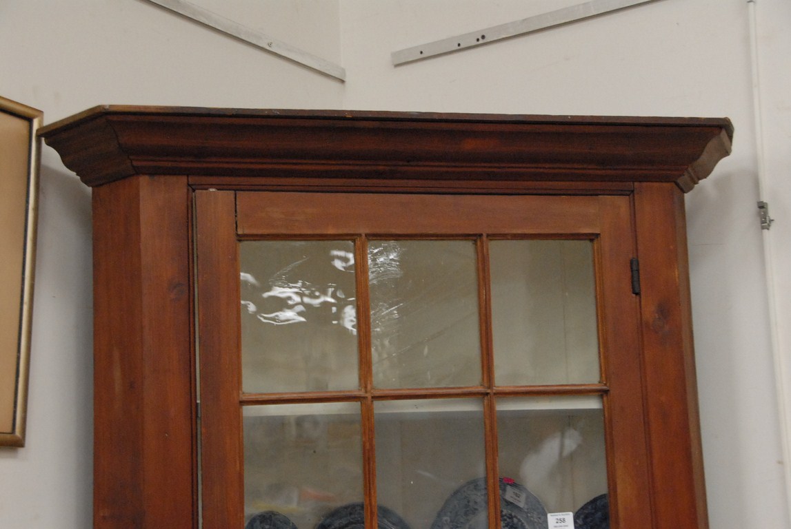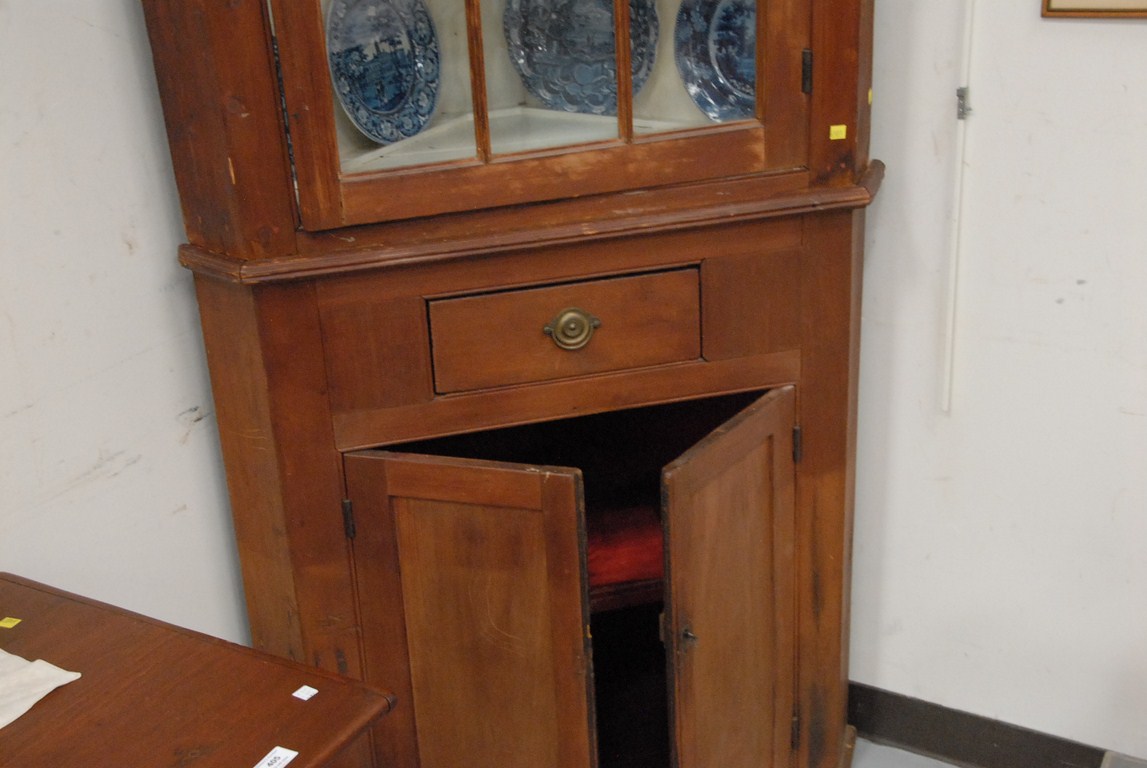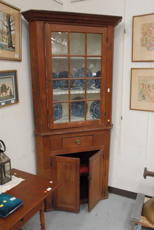 Lot 258: Corner cupboard in two parts, upper section with twelve pane door on base with drawer and two doors.