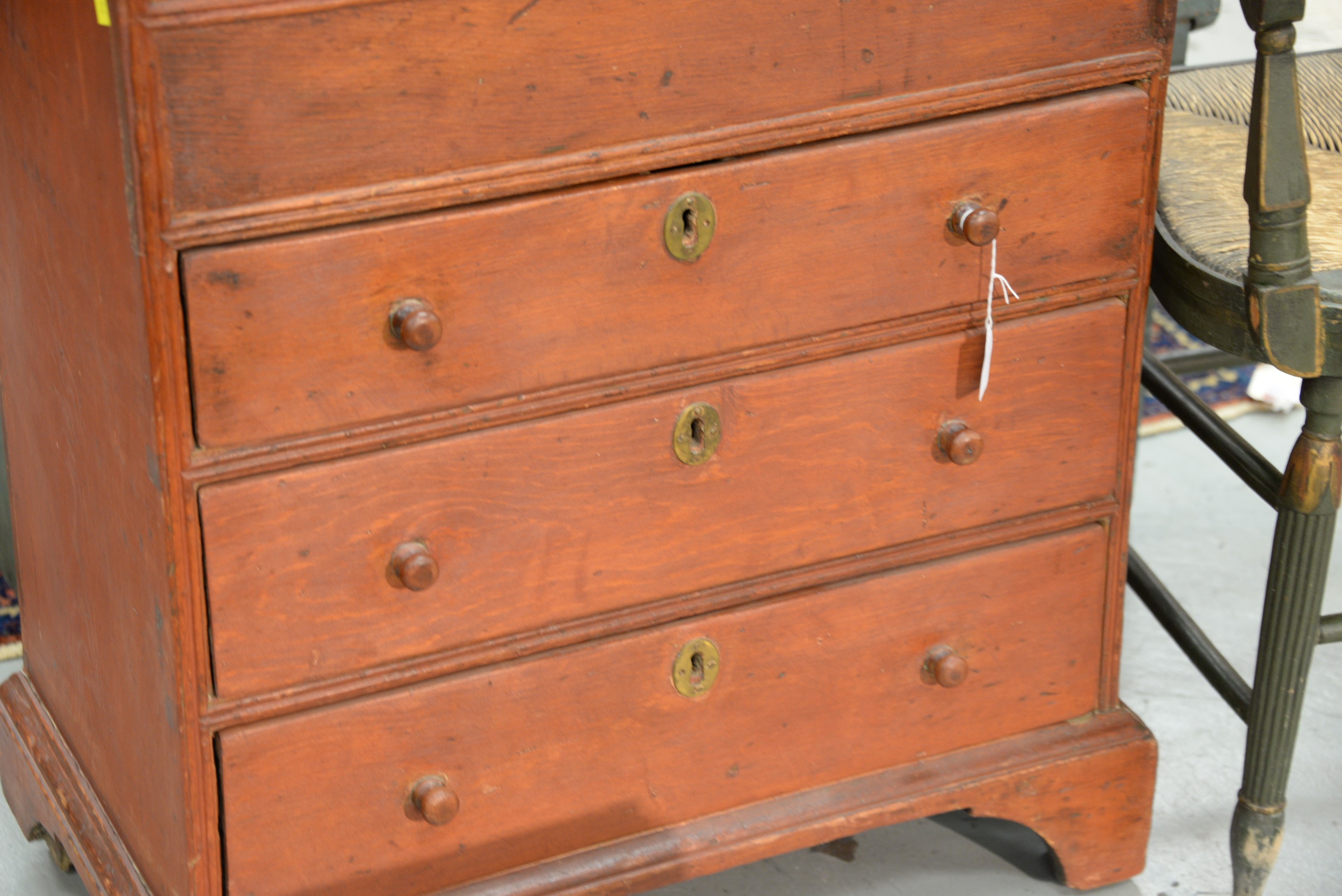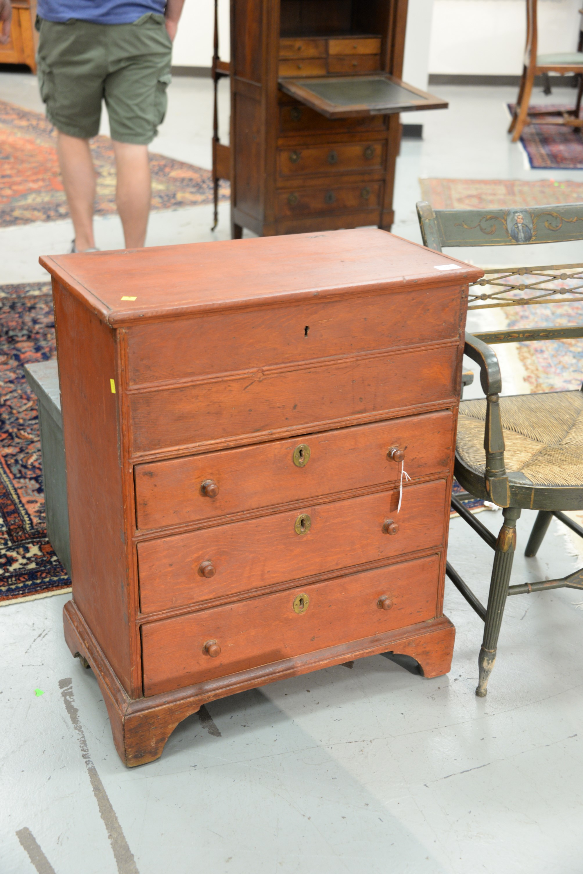 Diminutive blanket chest having lift top and two false drawers over three drawers all set on bracket base, circa 1750-1770 refinished, old red tint remaining. ht. 30 1/2 in. wd. 25 1/4 in. dp. 14 in.