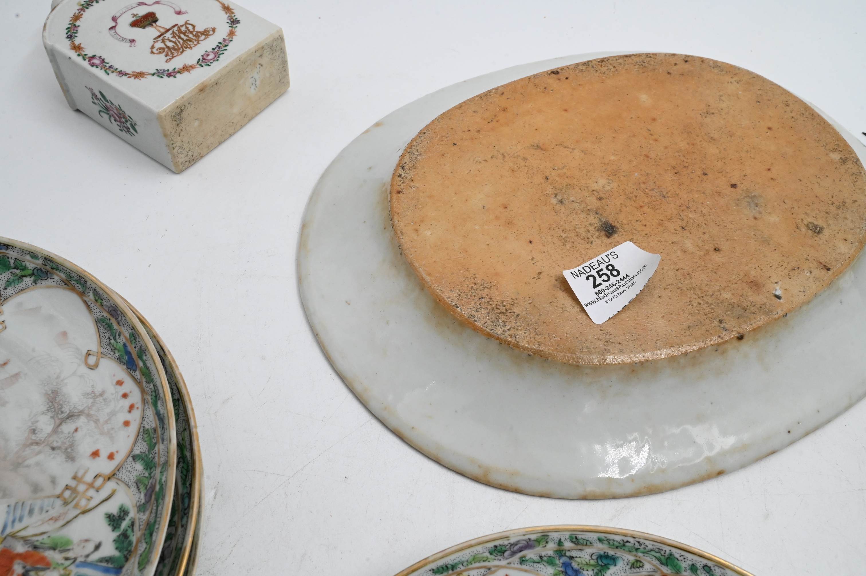 set of five Chinese Famille Verte porcelain plates each having high relief border, center medallion featuring birds in tree branches surrounded by gilt petal form cartouches depicting garden scenes with figures and landscapes, export tea caddy having gilt and floral wreath centered by crown and hand, small blue and white covered jar, along with export Famille Rose oval platter